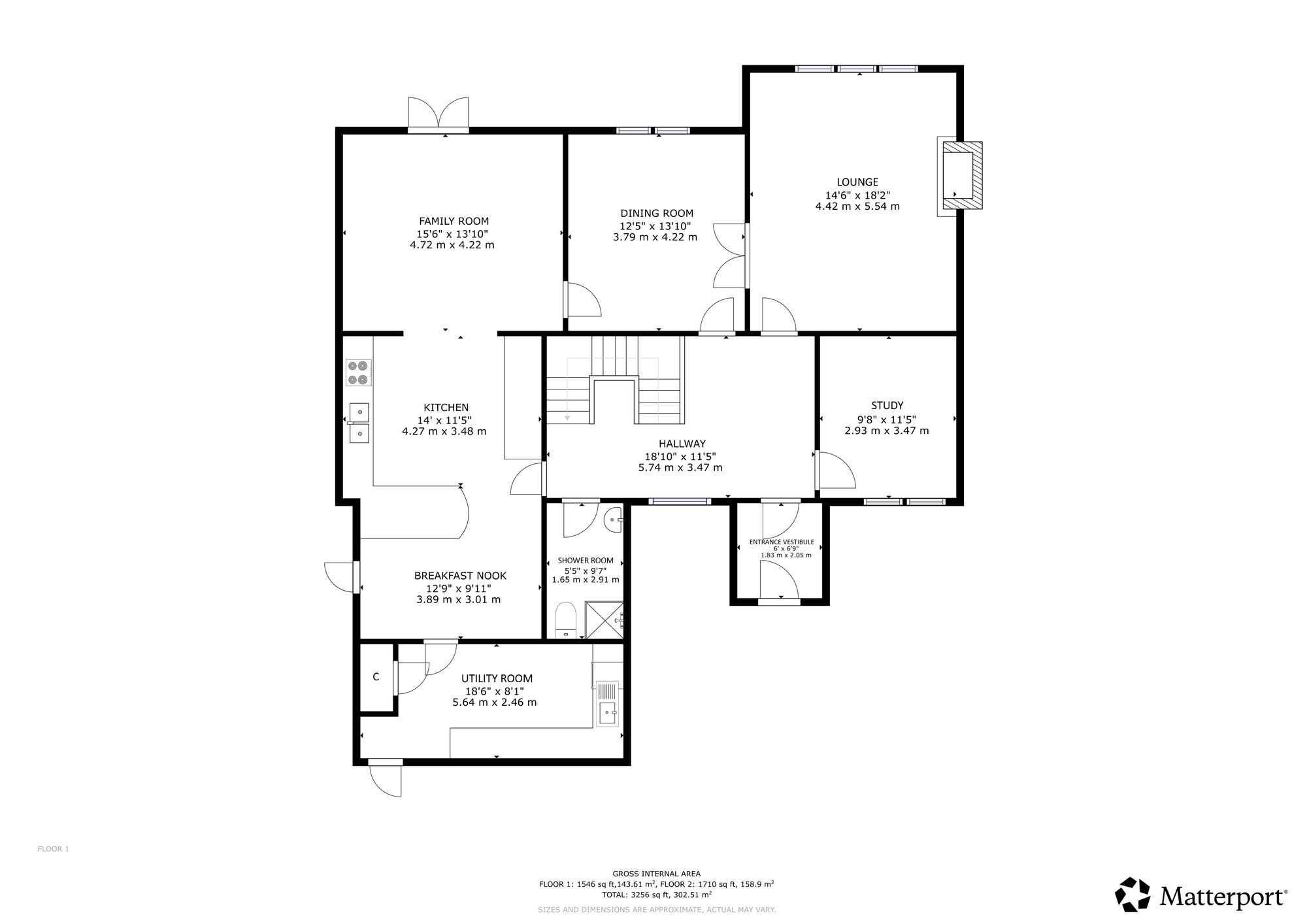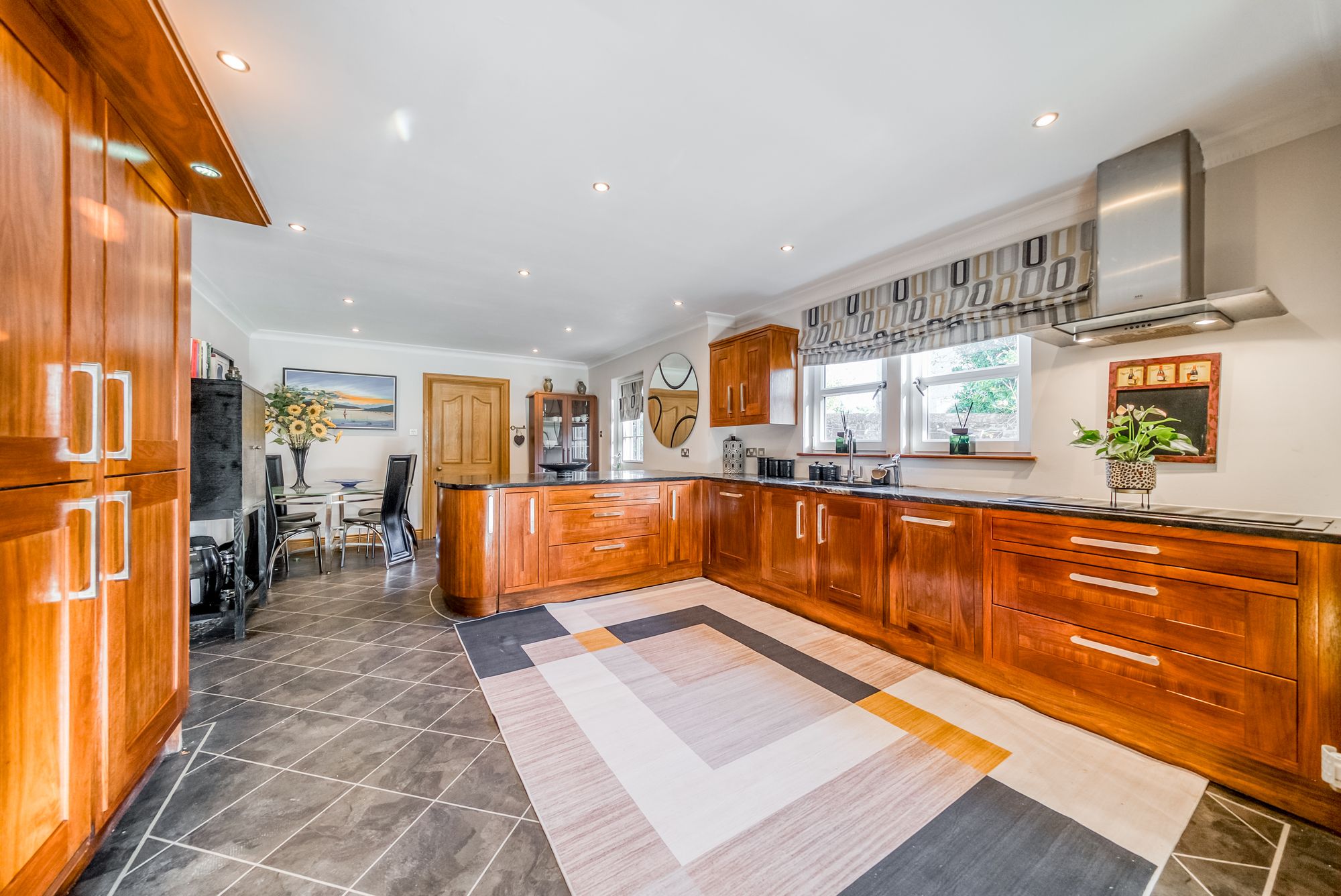 A welcoming entrance vestibule leads into an impressive central hallway where a striking wooden staircase forms an immediate focal point, creating a strong sense of arrival and scale. The formal lounge is both elegant and inviting, featuring a statement gas fire with an attractive surround, making it an ideal space for refined entertaining or relaxed family living. Double doors open into the stylish dining room, which enjoys open views across the rear garden and offers generous space for a large dining table and additional furniture.