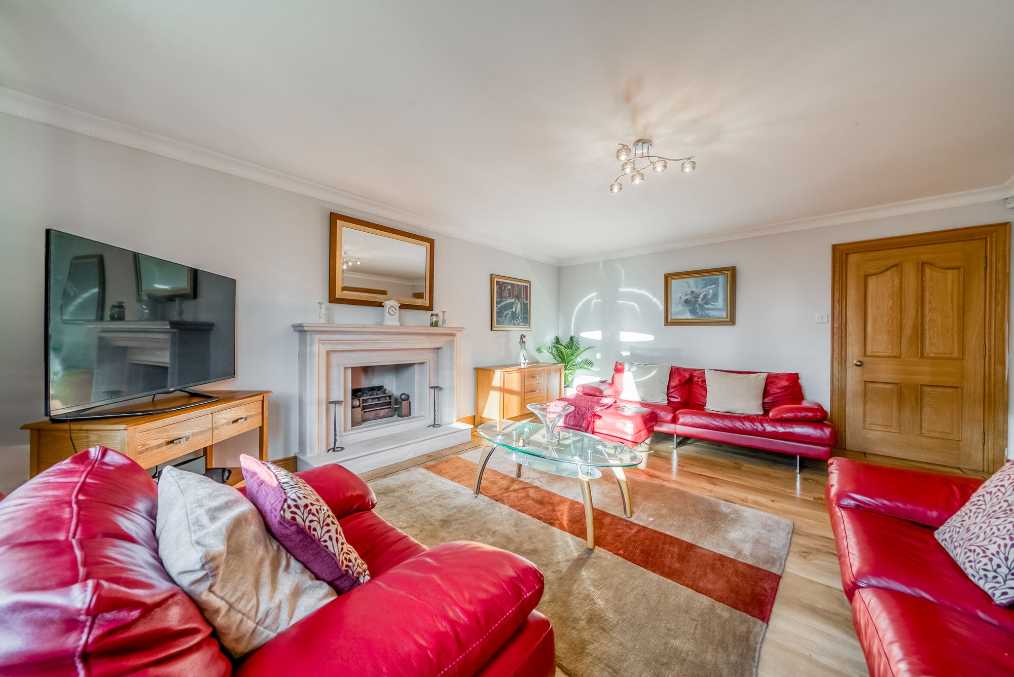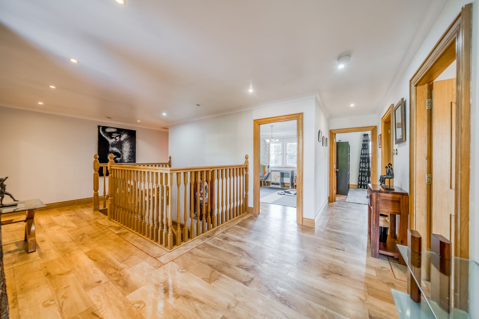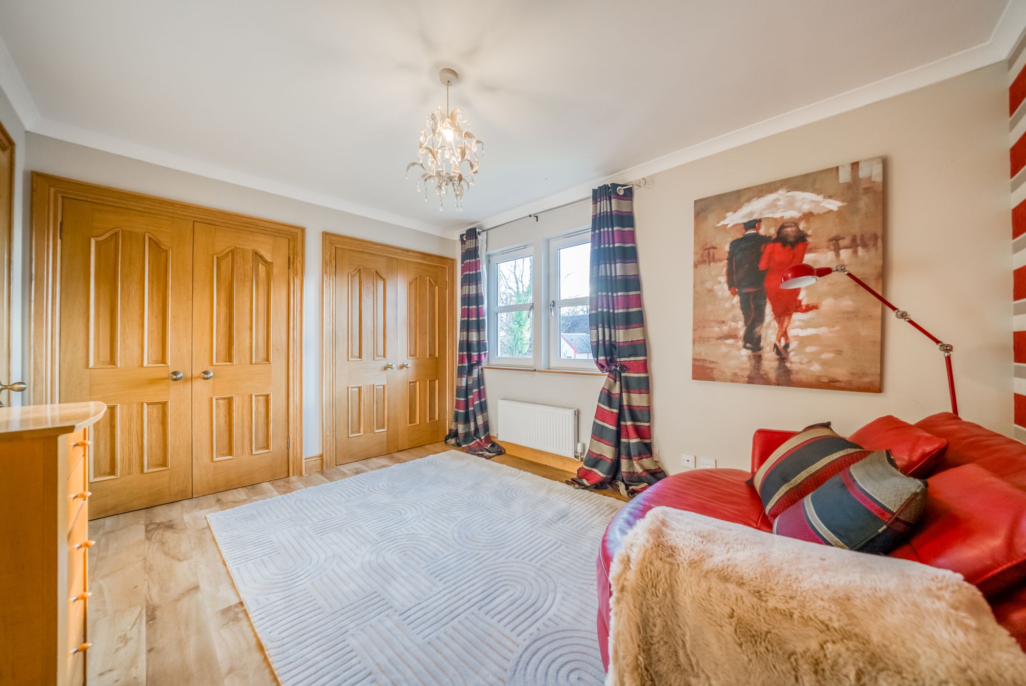 The first floor offers outstanding bedroom accommodation, centred around an impressive principal suite. Accessed via a dressing hallway lined with built-in wardrobes, the bedroom itself is generously proportioned and enjoys elevated views across the town, with dual-aspect windows allowing an abundance of natural light. The luxurious ensuite bathroom is finished to a high standard and includes a bath, separate shower enclosure, wc and vanity wash hand basin. Three further spacious double bedrooms are located on this level, all benefiting from built-in wardrobes, with one enjoying the added luxury of an ensuite shower room. A further snug provides excellent flexibility and could be utilised as a playroom, home office, or additional bedroom if required. Completing the upper floor is a stylish family bathroom featuring a bath, separate shower enclosure, wc and vanity wash hand basin.
