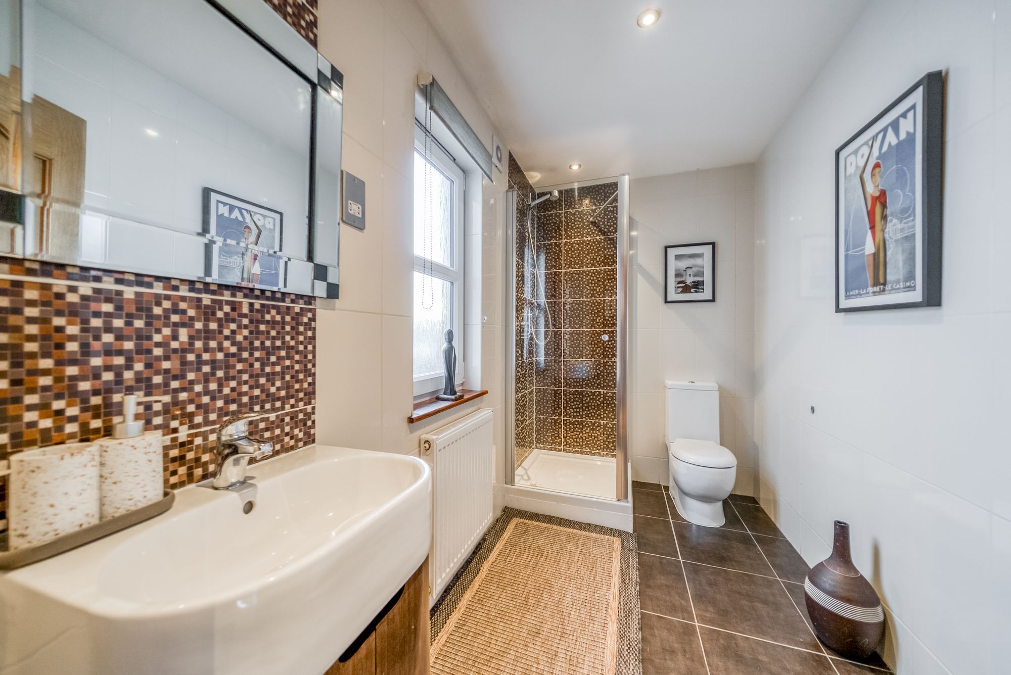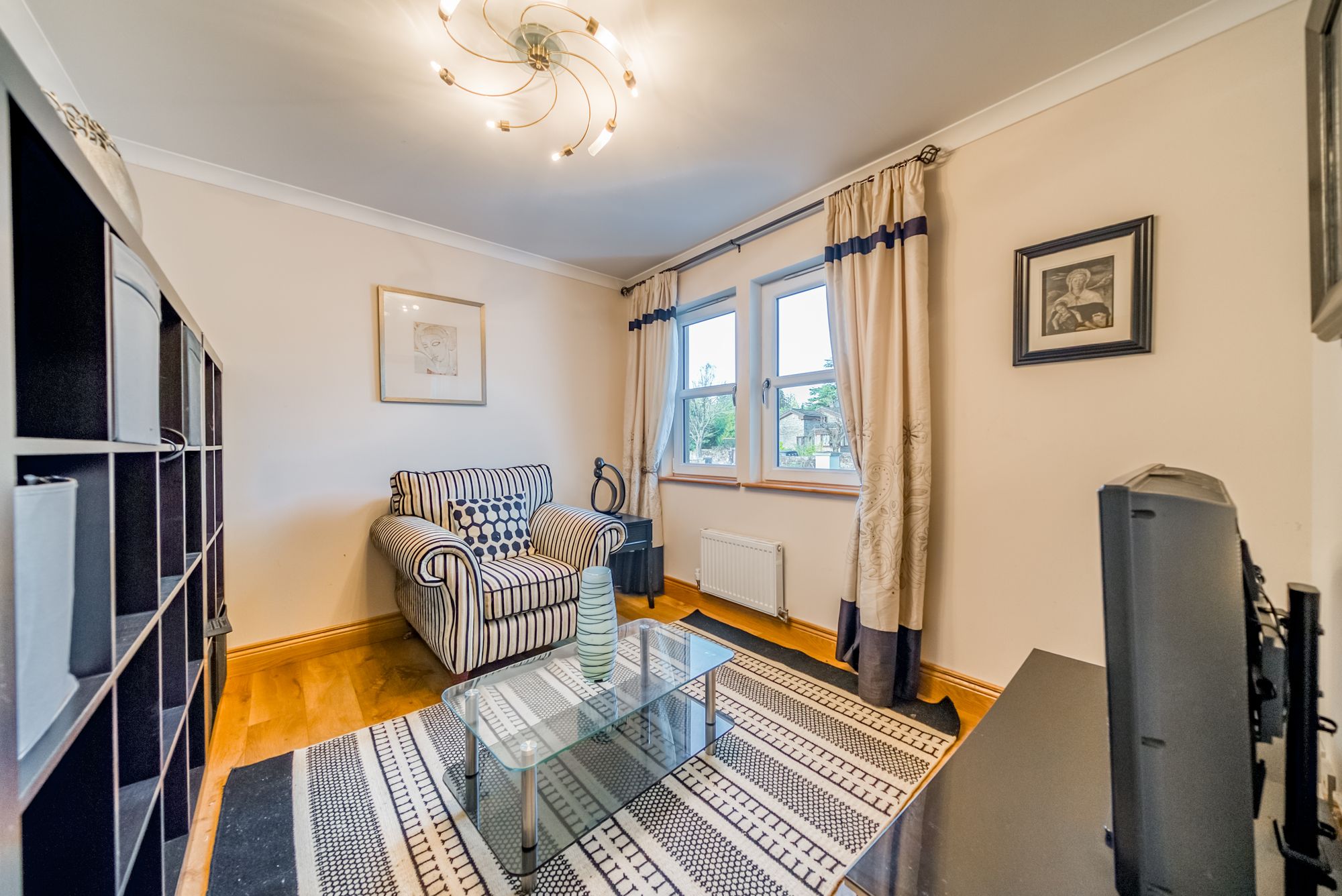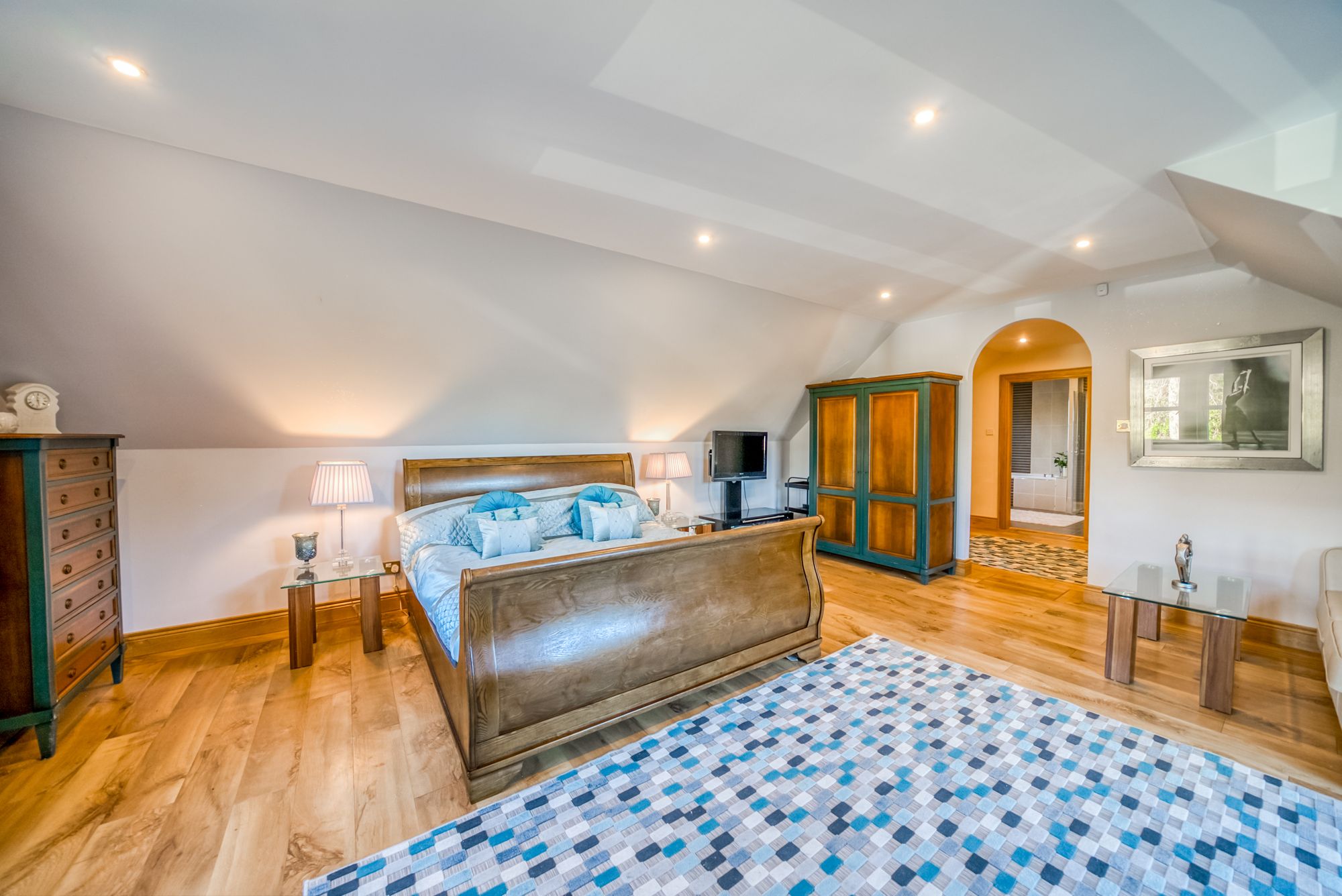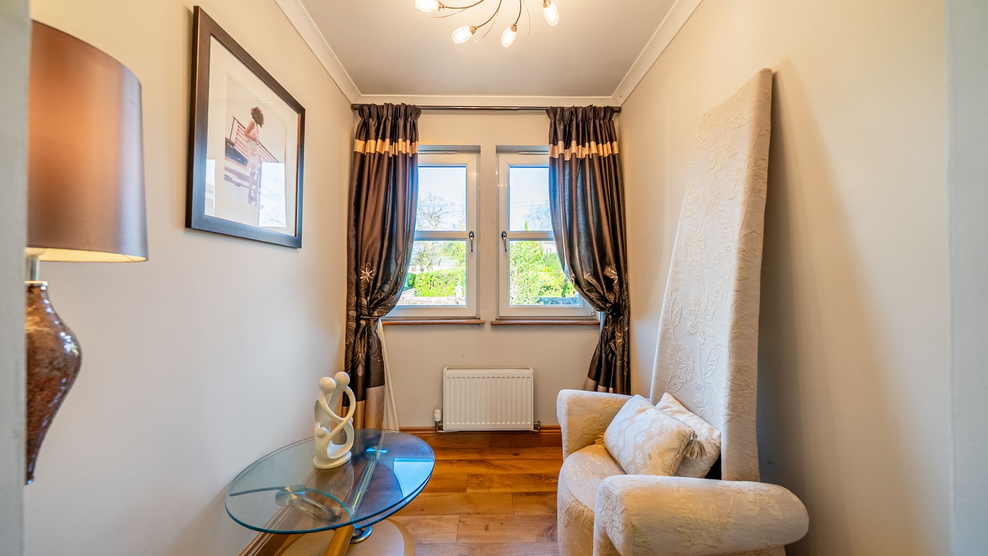 The first floor offers outstanding bedroom accommodation, centred around an impressive principal suite. Accessed via a dressing hallway lined with built-in wardrobes, the bedroom itself is generously proportioned and enjoys elevated views across the town, with dual-aspect windows allowing an abundance of natural light. The luxurious ensuite bathroom is finished to a high standard and includes a bath, separate shower enclosure, wc and vanity wash hand basin. Three further spacious double bedrooms are located on this level, all benefiting from built-in wardrobes, with one enjoying the added luxury of an ensuite shower room. A further snug provides excellent flexibility and could be utilised as a playroom, home office, or additional bedroom if required. Completing the upper floor is a stylish family bathroom featuring a bath, separate shower enclosure, wc and vanity wash hand basin.