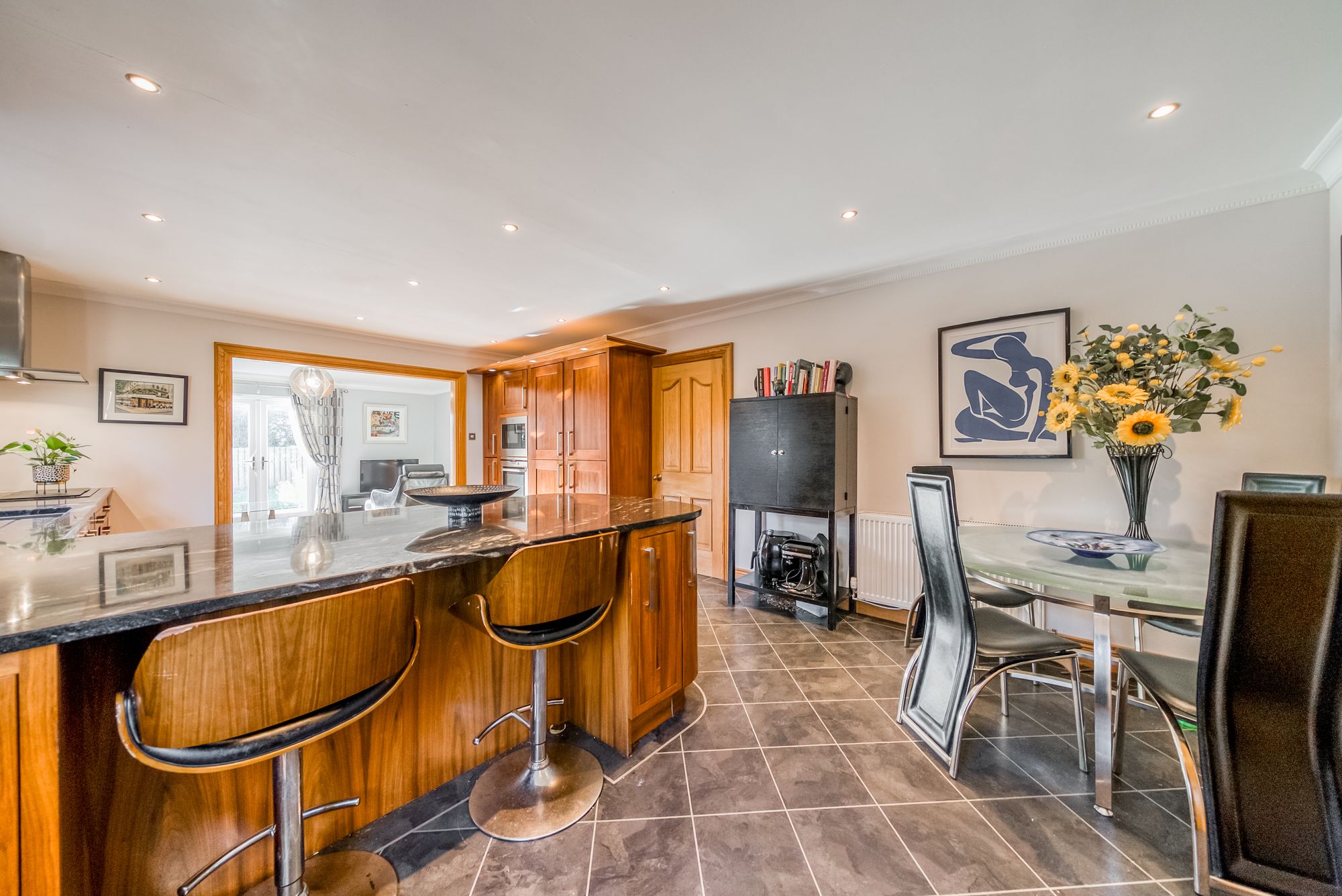 At the heart of the home lies an outstanding open-plan kitchen, sitting and family area, designed to meet the demands of modern luxury living. The sitting area provides a comfortable secondary living space with seamless access to the rear garden, while the contemporary kitchen is both spacious and beautifully appointed, featuring an extensive range of high-quality units, premium integrated appliances, a substantial breakfast bar, and additional space for casual dining. Doors from both the kitchen and sitting area lead directly to the garden, enhancing the connection between indoor and outdoor living.