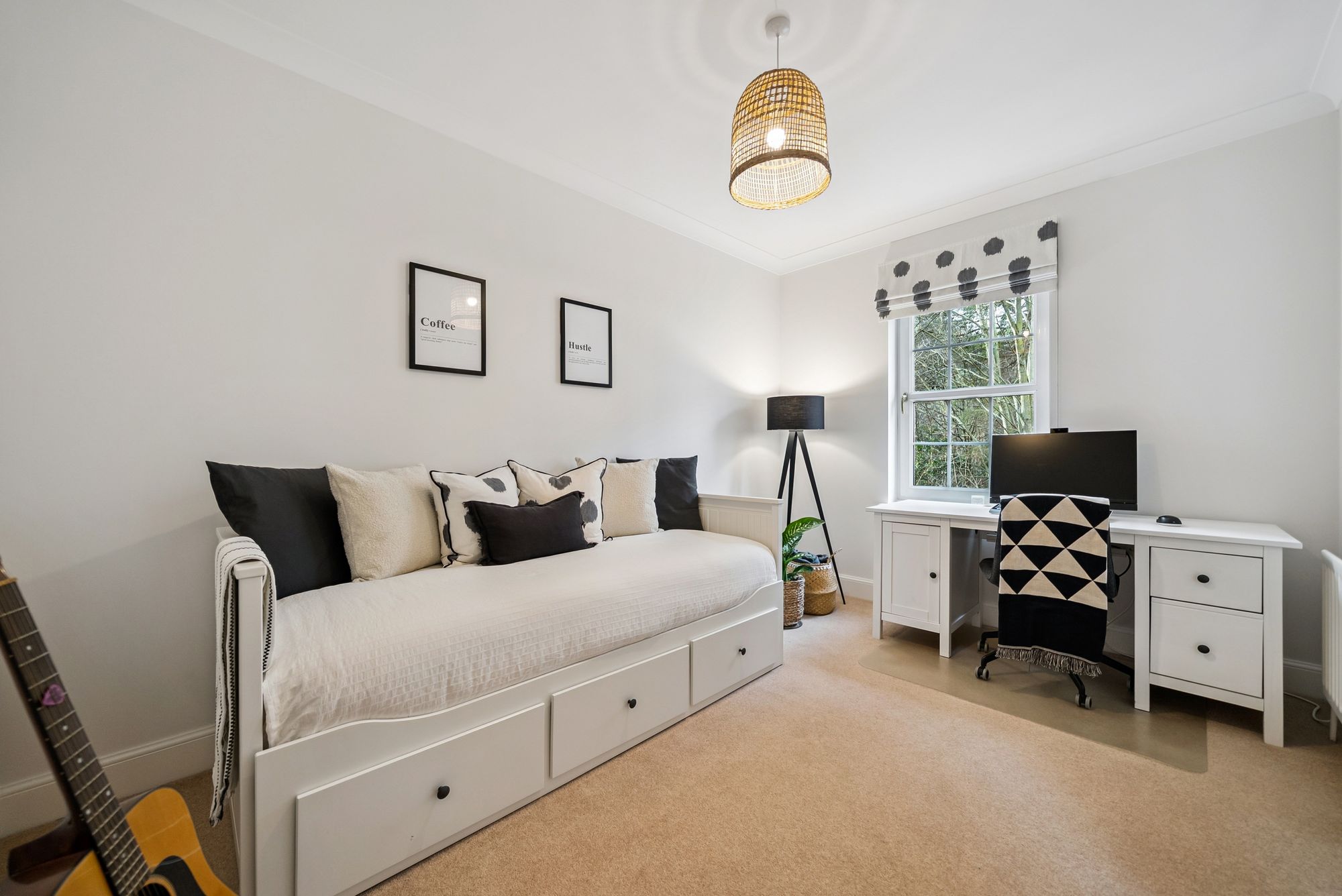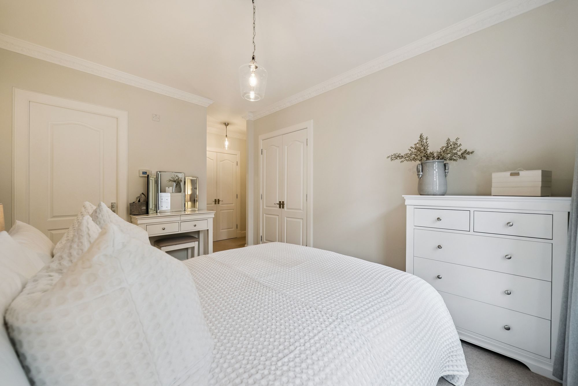 The property offers three generous double bedrooms. The principal bedroom benefits from two fitted wardrobes and a stylish en-suite shower room. The second bedroom also enjoys built-in wardrobes and its own well-appointed en-suite, ideal for guests or family members seeking privacy. The third bedroom, currently arranged as a study, is equally spacious and would serve perfectly as a bedroom, nursery or cosy snug.