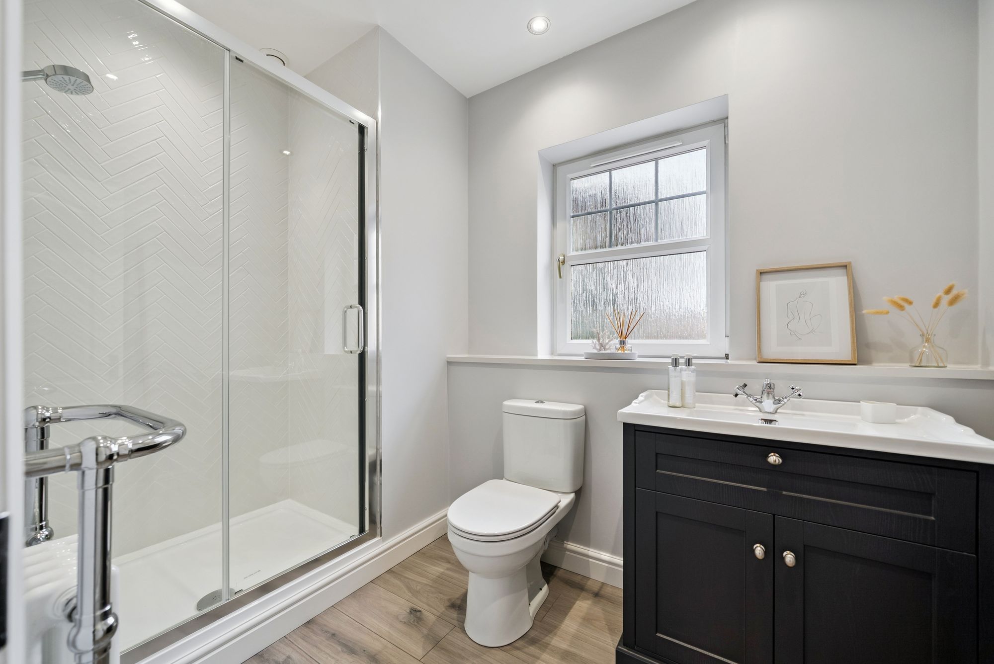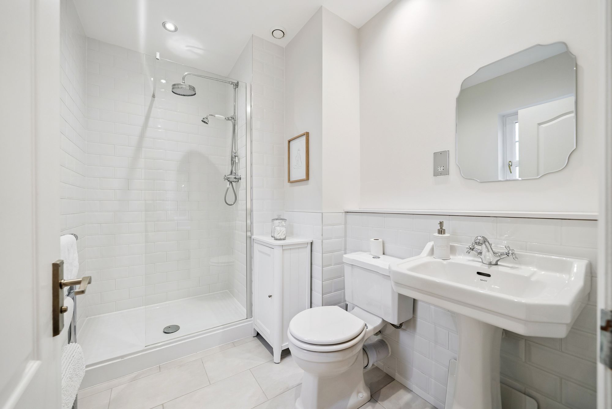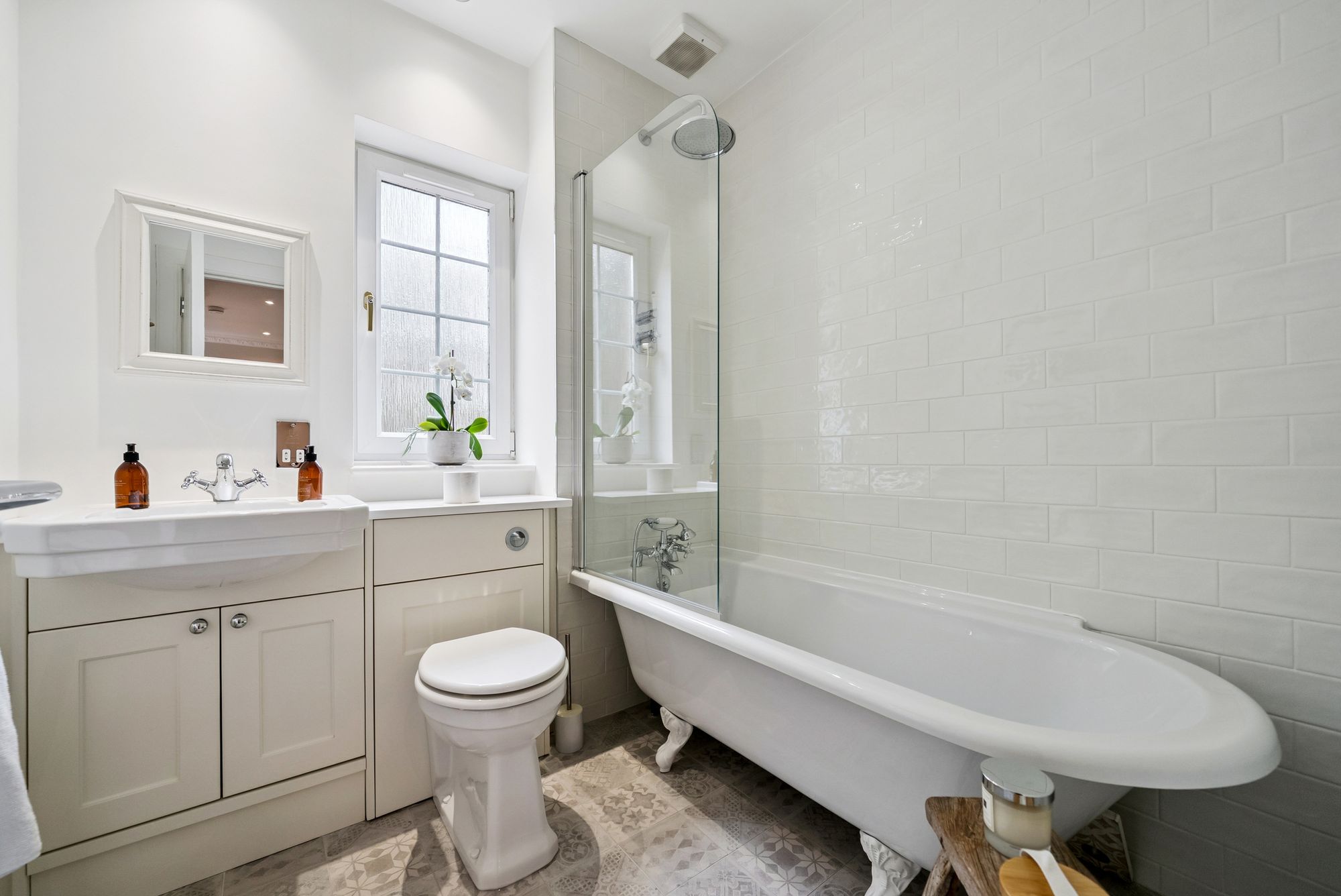 The family bathroom is finished to a high standard and feels light and airy, comprising a shower over bath with floor-to-ceiling tiling, mosaic tiled flooring, a heated chrome towel rail and useful under-sink storage.
