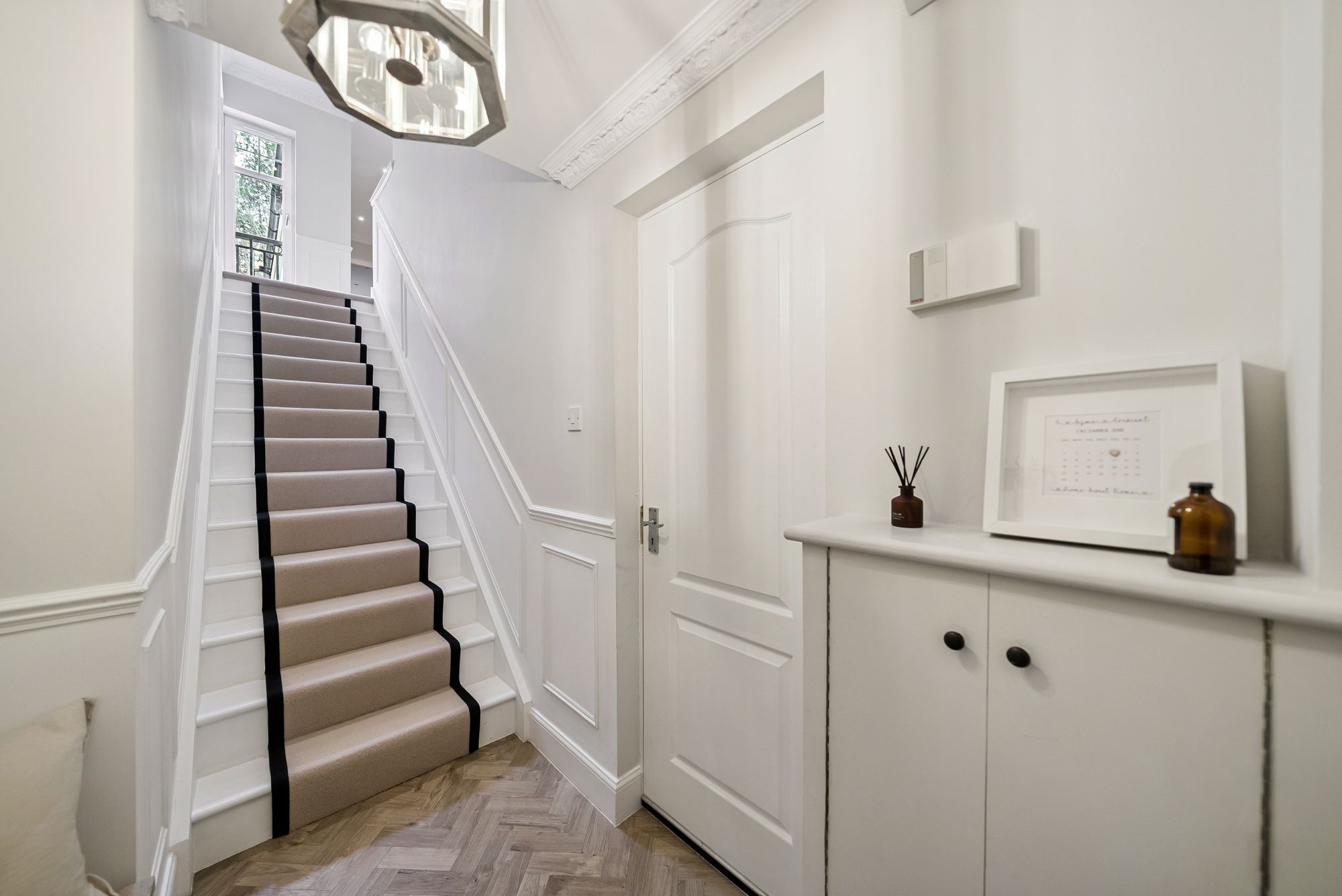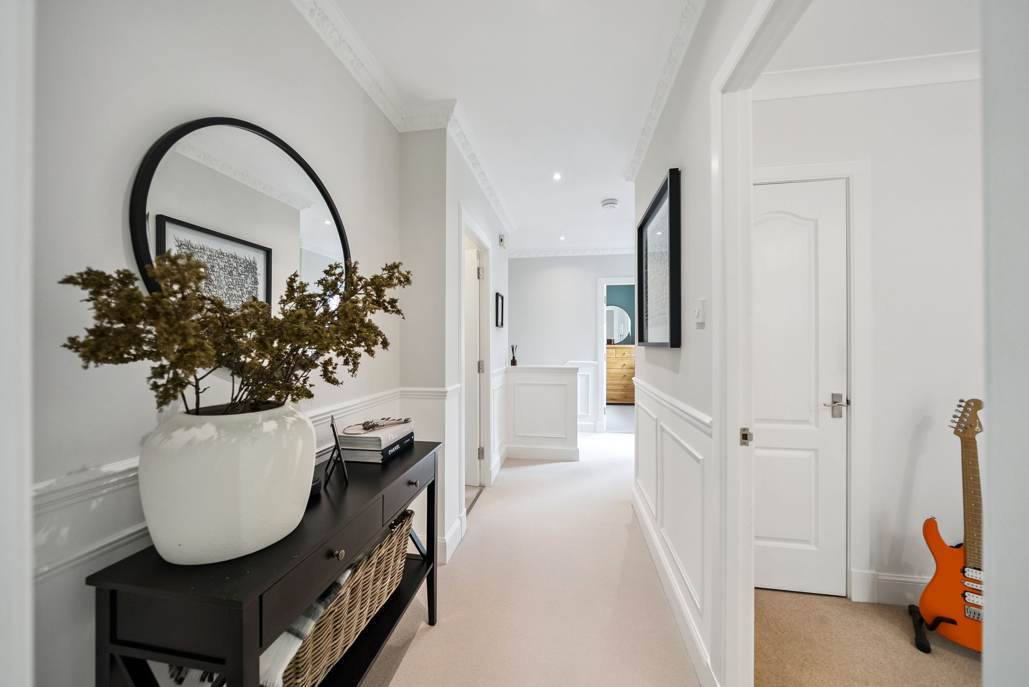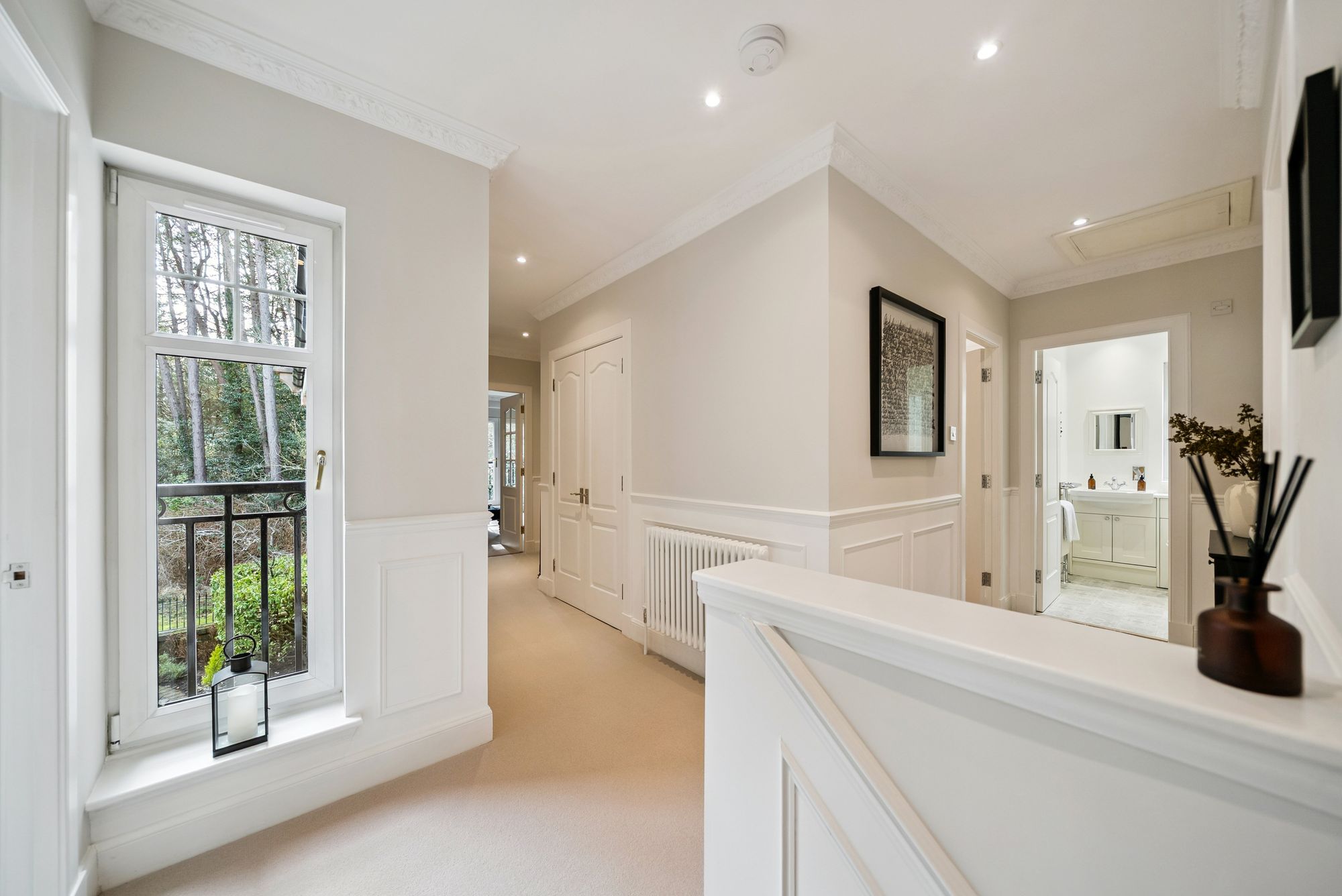 A staircase leads to a bright and spacious upper hallway, finished with plush carpeting, a designer radiator, stylish wall paneling and decorative cornicing. A generous storage cupboard is also located off the hall.