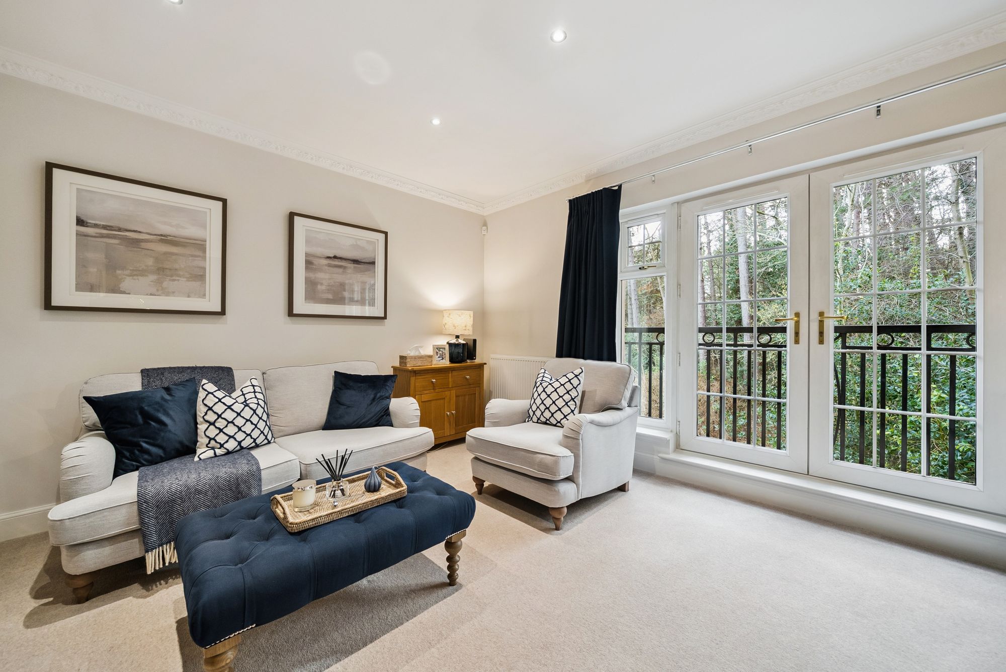 Double doors open into the impressive living room - a wonderfully light and comfortable space. A Juliet balcony overlooks tranquil woodland, flooding the room with natural light and creating a peaceful outlook. There is ample space for both relaxing and dining, making this an ideal setting for entertaining or unwinding at the end of the day.