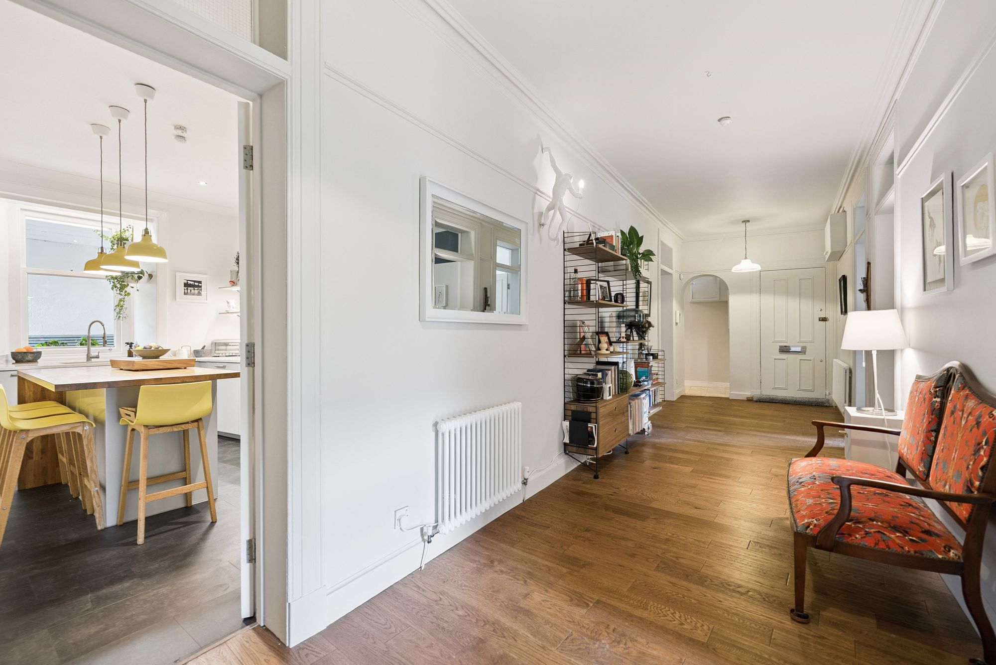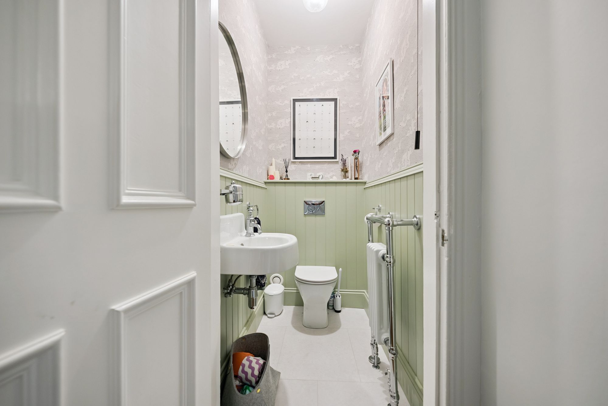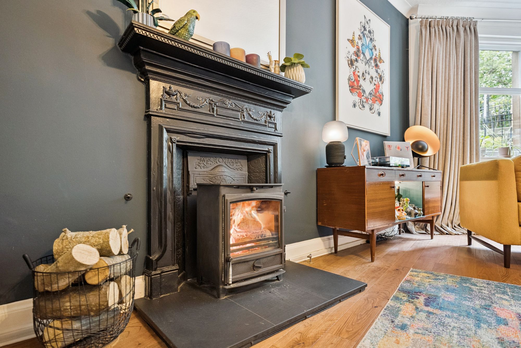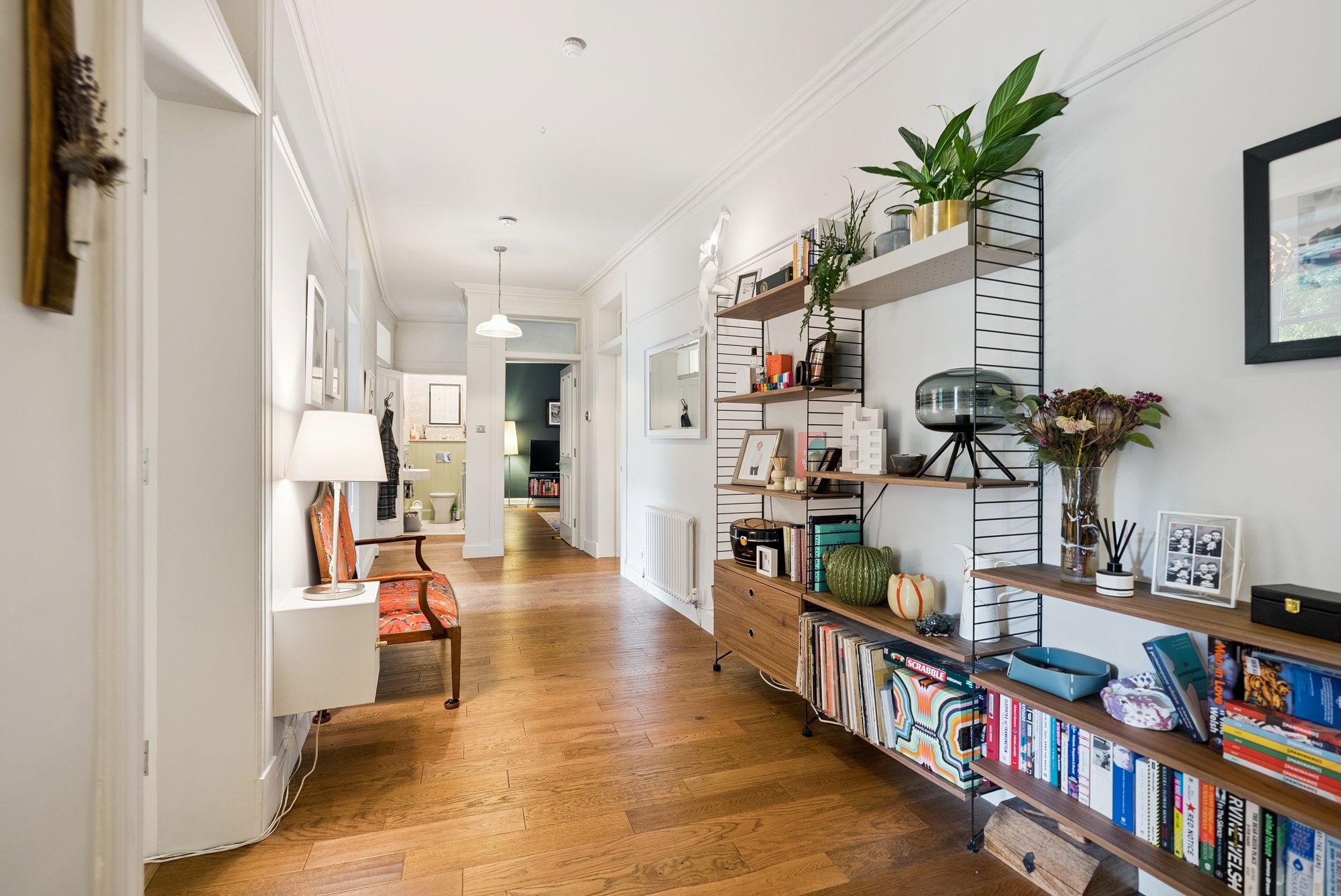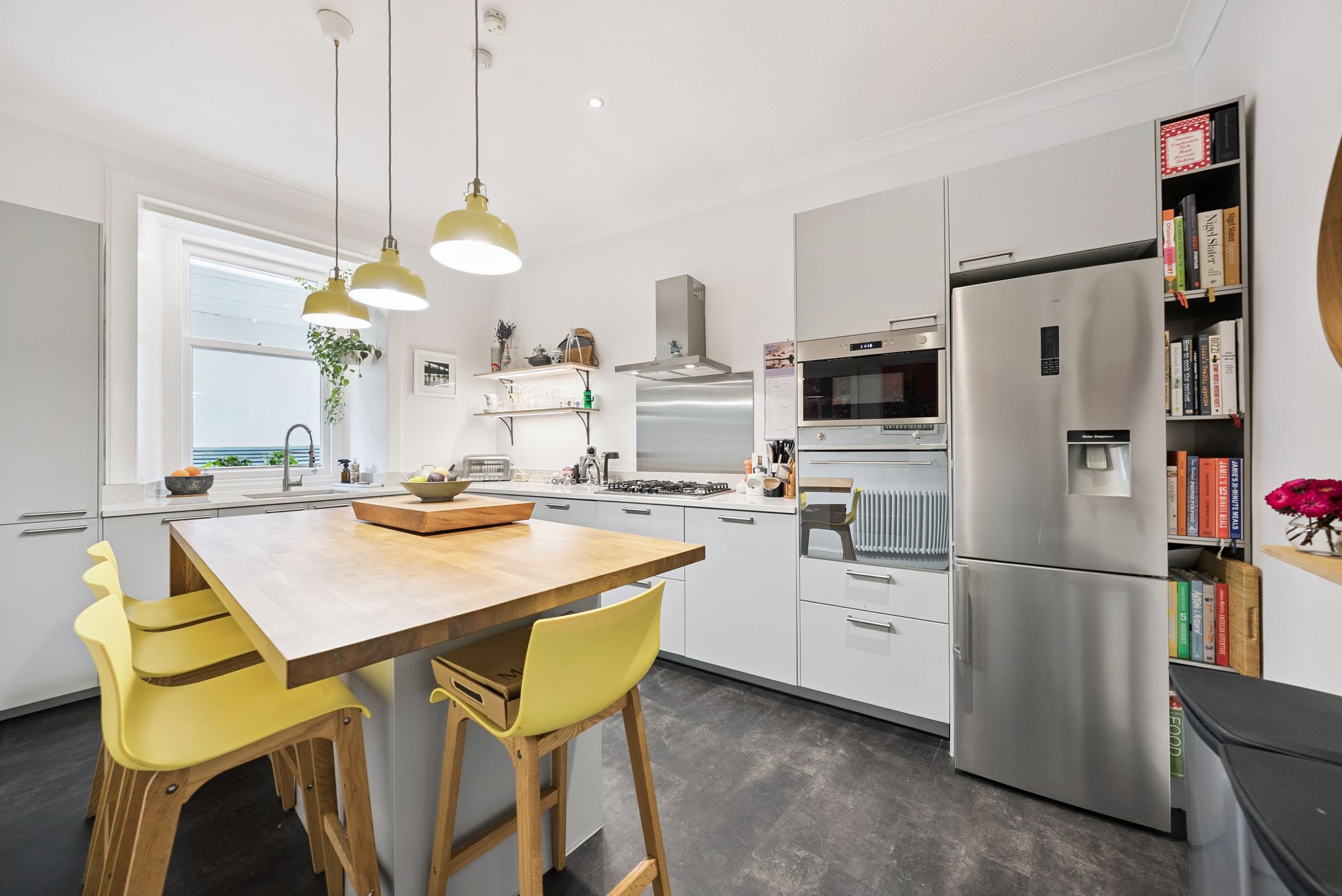 However, in brief the accommodation extends to; welcoming entrance hallway with w/c off, beautiful bay windowed living room with log burner, walk in cupboard and double doors leading to a dining kitchen. The kitchen itself has base and wall mounted units with a full range of integrated appliances and an island/breakfast bar. There are four bedrooms including a bay windowed principal room and the accommodation is completed by a fully tiled main bathroom with three piece suite and shower over the bath. From the hallway, there is a door leading into the communal hallway with storage room off, and a door leading to the leafy communal rear gardens. The gardens are made up of a large section of lawn bound by mature trees and shrubs and are completely South facing.