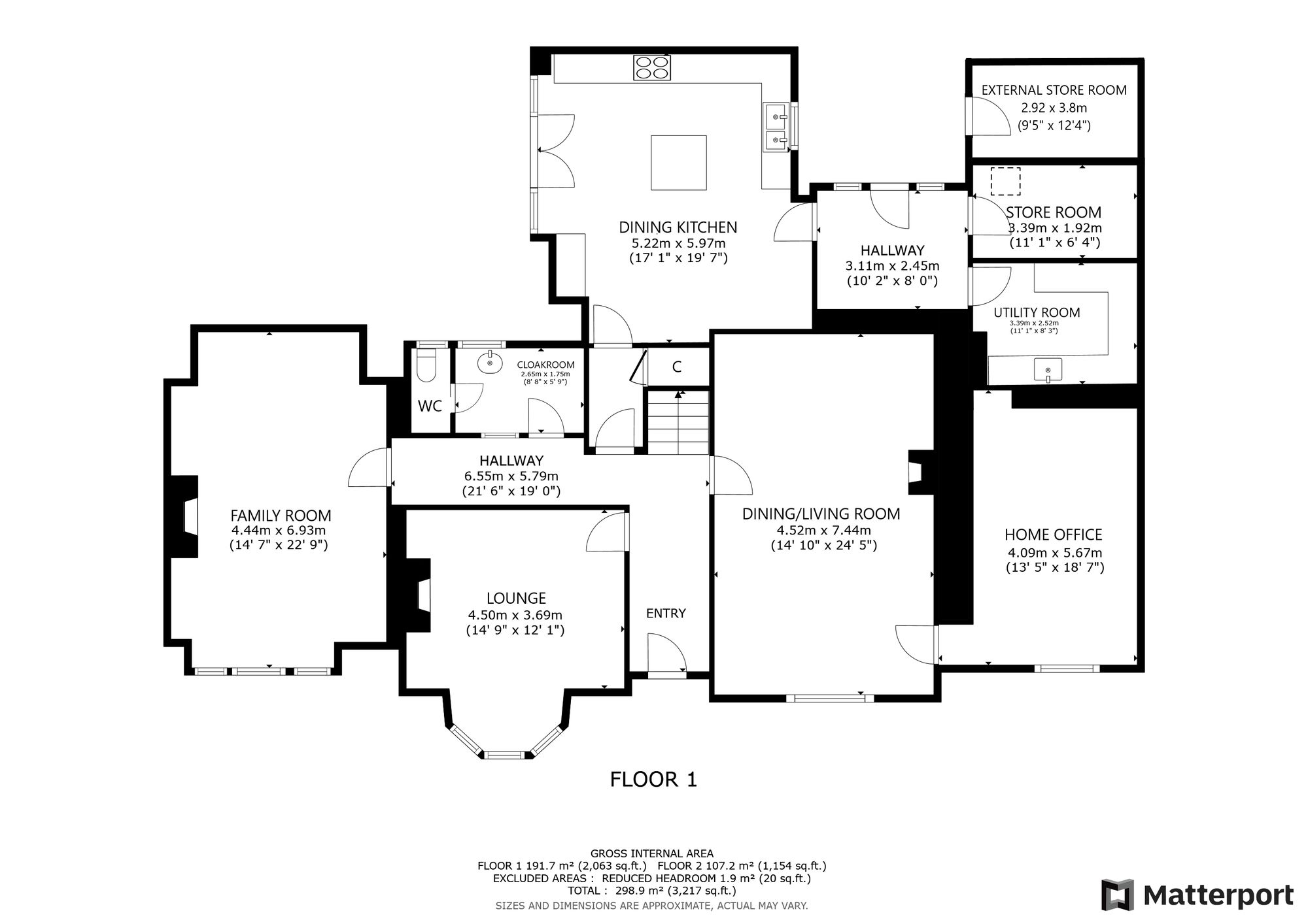 To the rear of the house there is a traditional cloakroom with wash hand basin and hanging space, with a separate WC next to it. Another passageway from the reception hall, with under-stair storage, leads to a bespoke Loxley kitchen. The kitchen has traditional wall and base units, granite worktops, a central island, breakfast bar and high-quality appliances including a range cooker and Belfast sink. Full-height windows and French doors provide plenty of natural light and open onto the rear garden. A rear hallway off the kitchen provides additional storage and access to the garden. From here there is a large walk-in storage room and a utility room with Belfast sink, washing machine plumbing and built-in storage. The kitchen, rear hallway and utility room all benefit from underfloor heating.