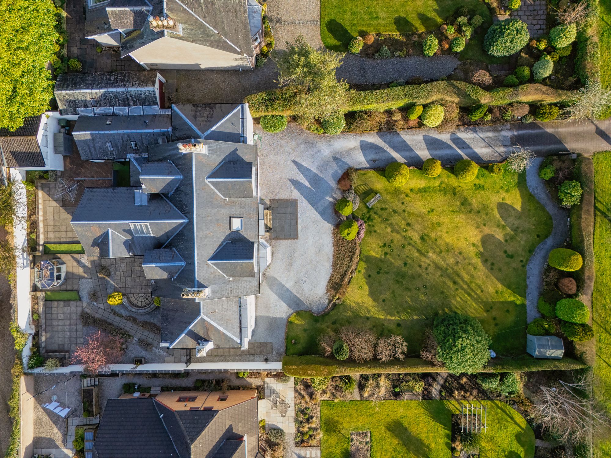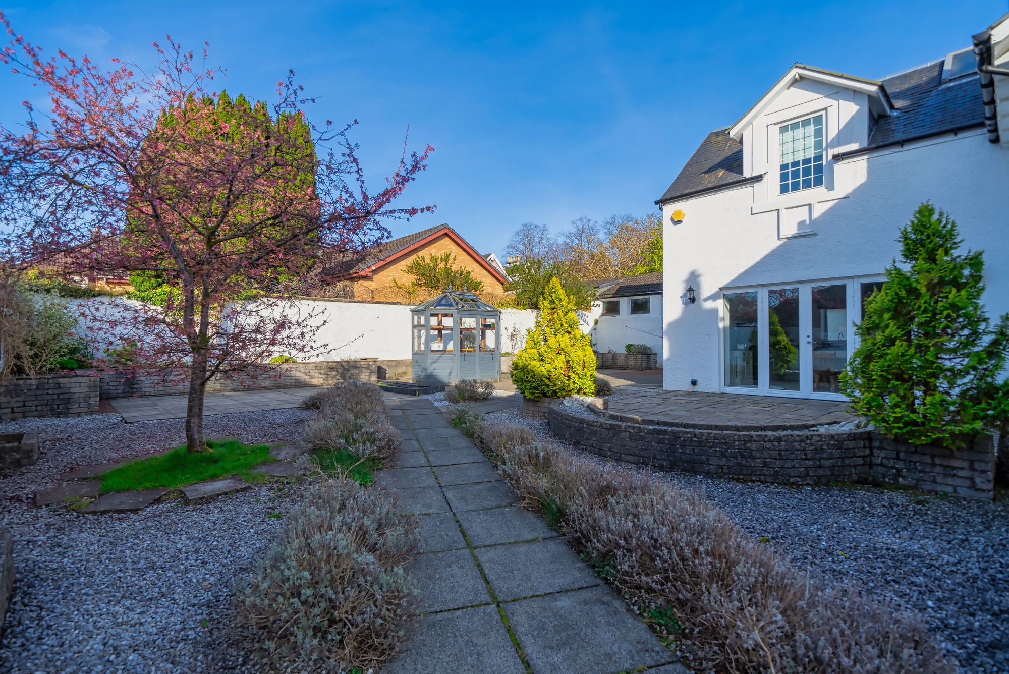 The gardens are a major feature of the property. Twin wrought-iron gates open to a monoblock area, leading to a sweeping gravel driveway that provides parking for several cars at the front of the house. The front garden is mainly lawn with established borders of plants, shrubs and trees, enclosed by hedging around the boundary. A gate at the side leads to the rear garden, which includes large, paved patio and terrace areas suitable for outdoor dining and entertaining. There are also gravelled sections with planted areas throughout. Painted stone boundary walls provide additional privacy. Near the back door there is a large outhouse store, a further wooden store and a greenhouse.