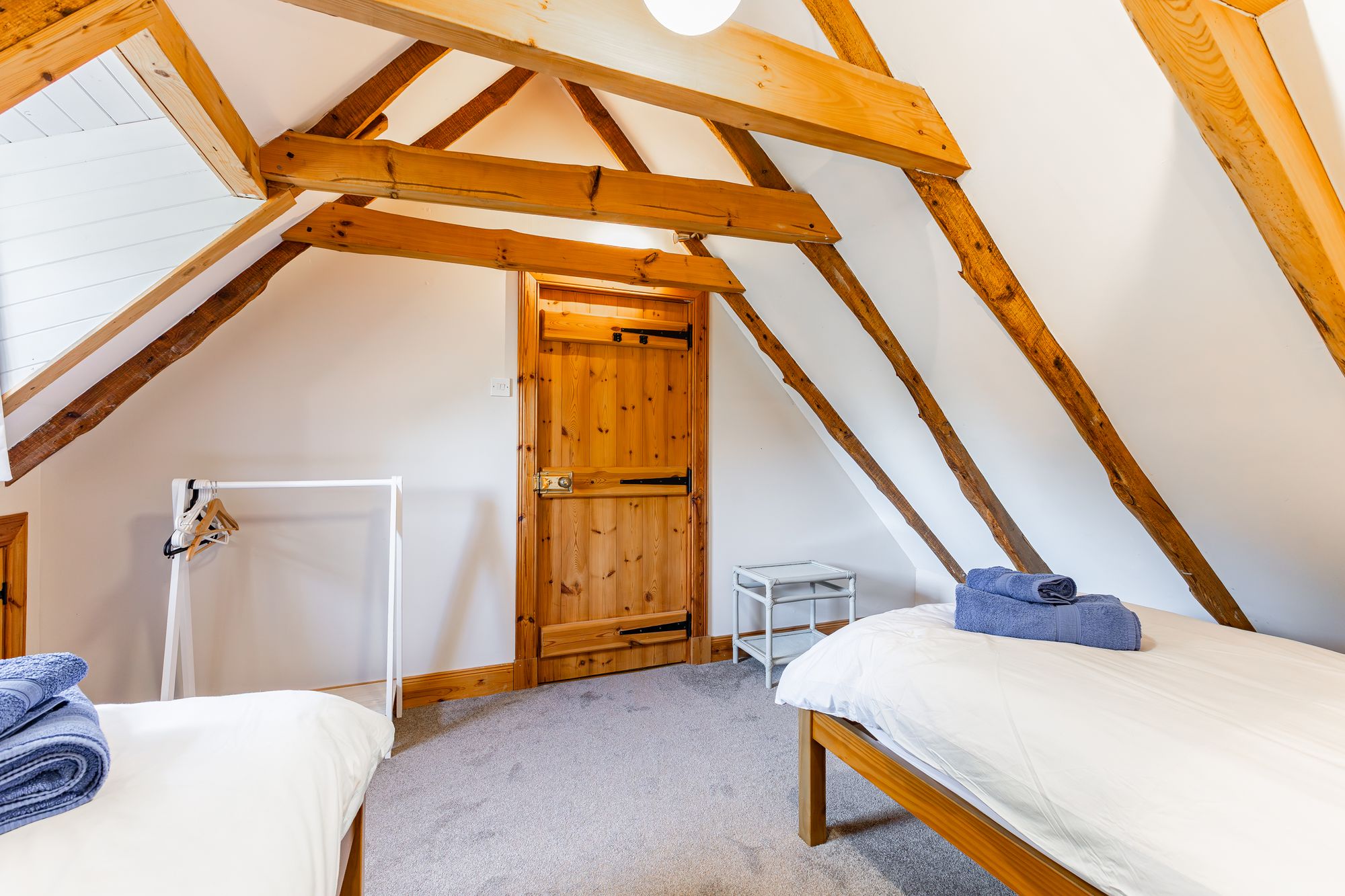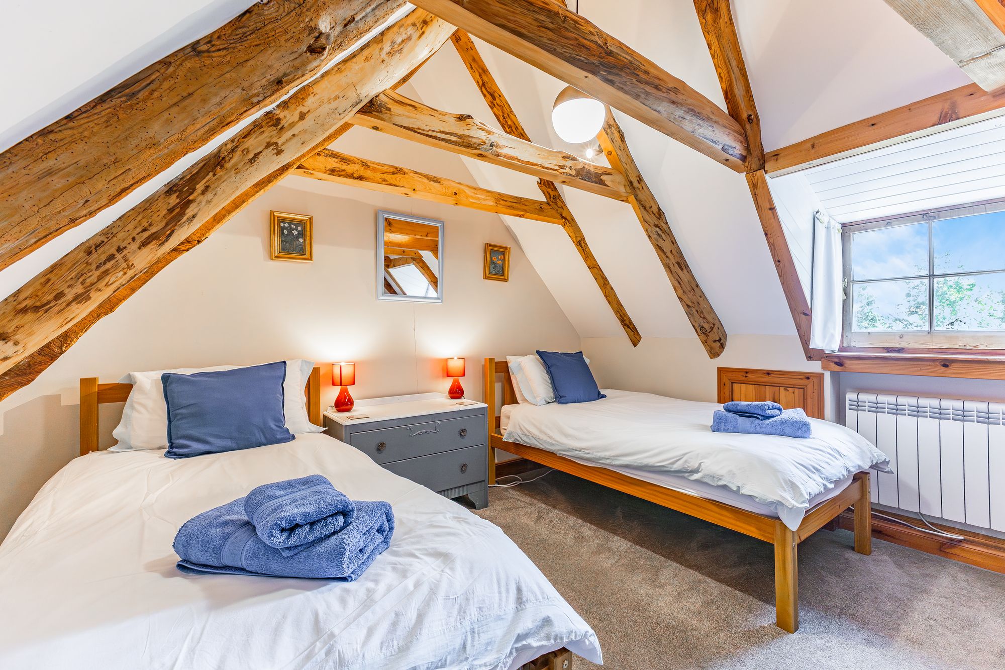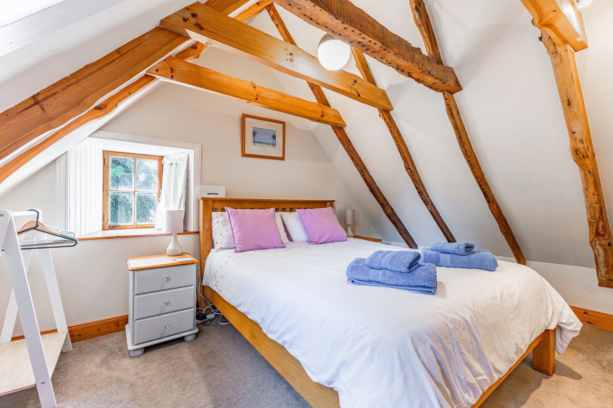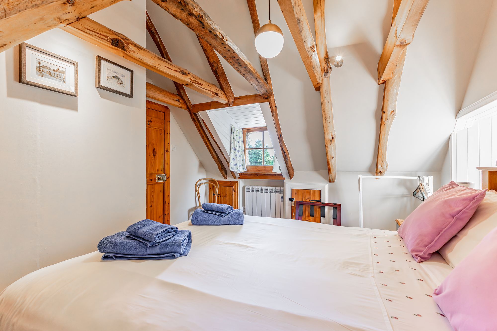 Upstairs, the first floor comprises two comfortable and well-proportioned bedrooms, both enjoying charming views and retaining a traditional cottage ambiance with their sloped ceilings and characterful finishes.