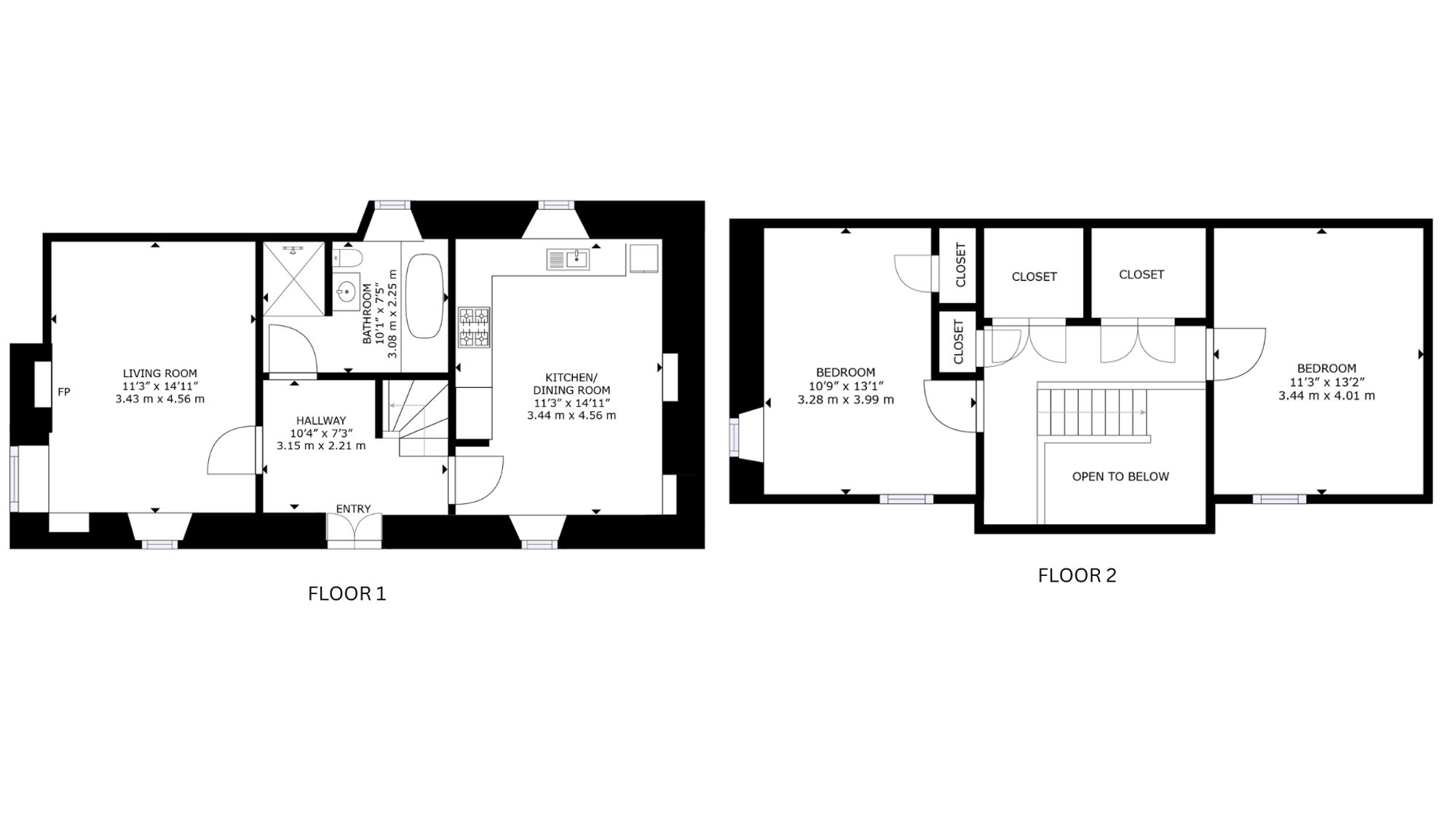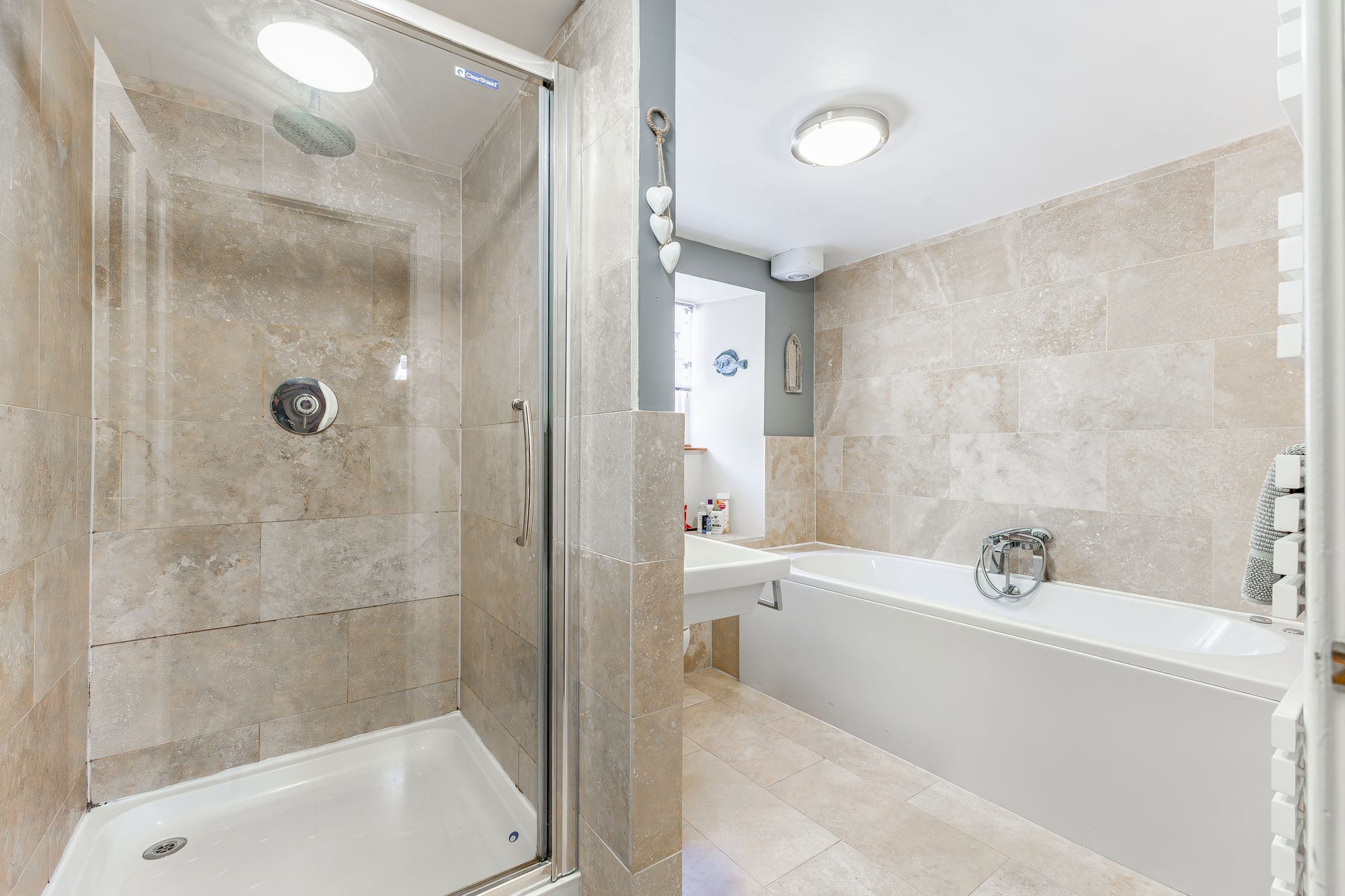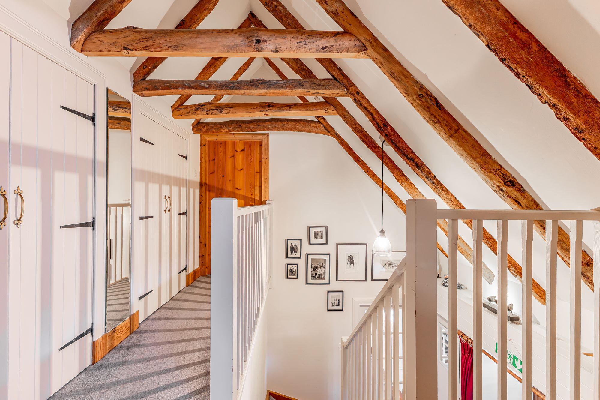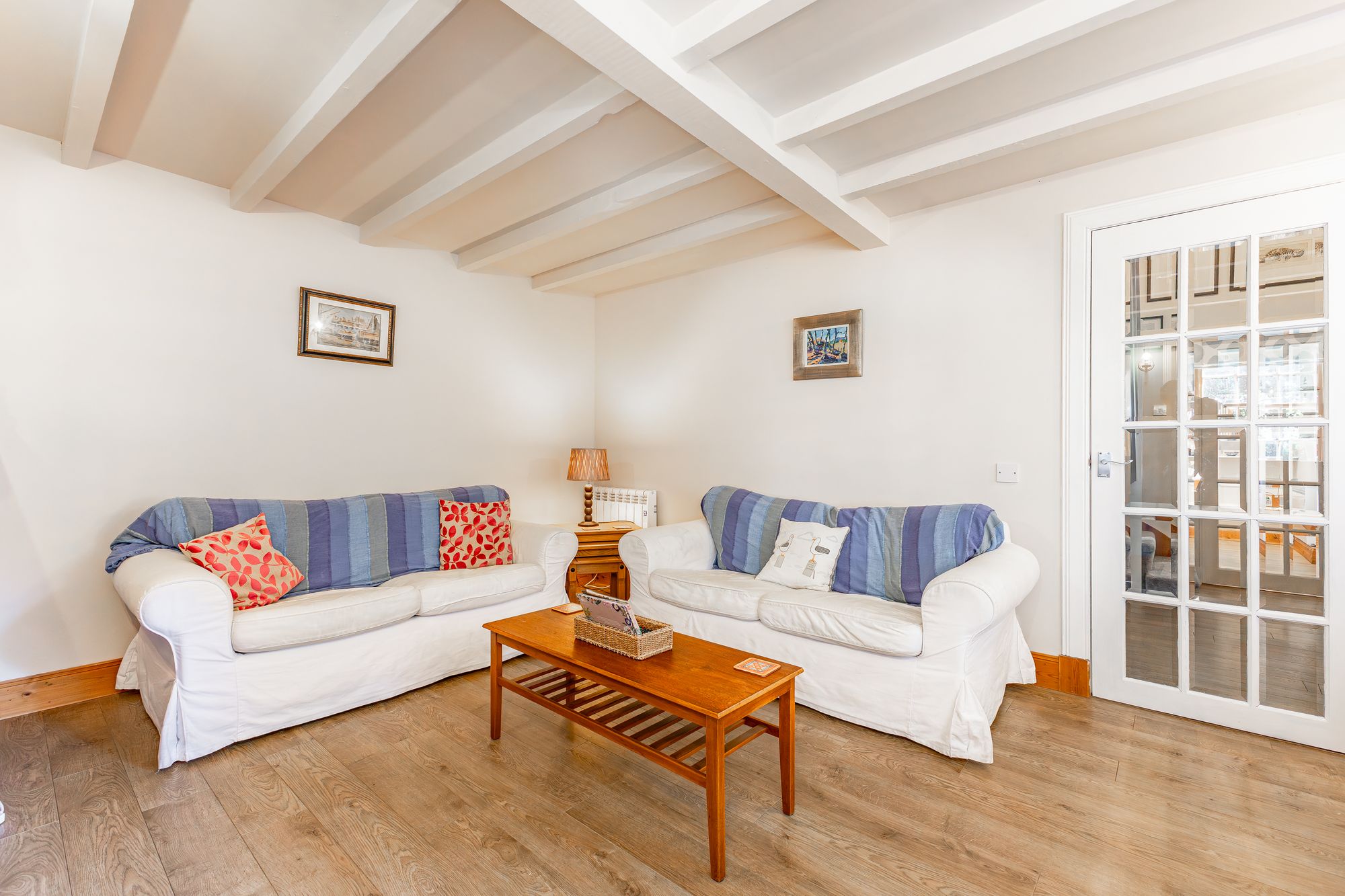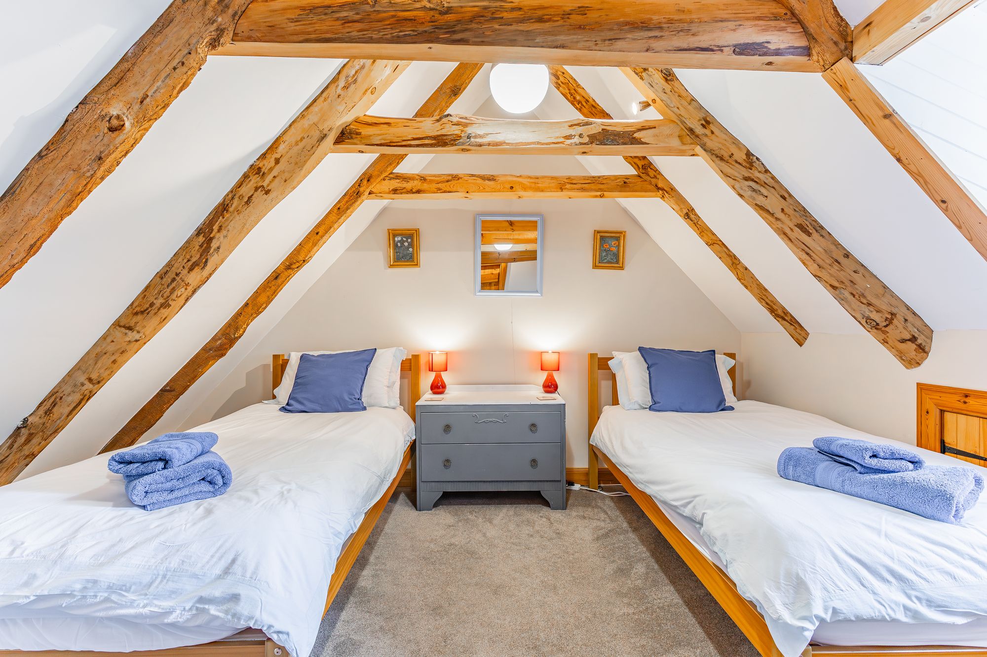 Upstairs, the first floor comprises two comfortable and well-proportioned bedrooms, both enjoying charming views and retaining a traditional cottage ambiance with their sloped ceilings and characterful finishes.
