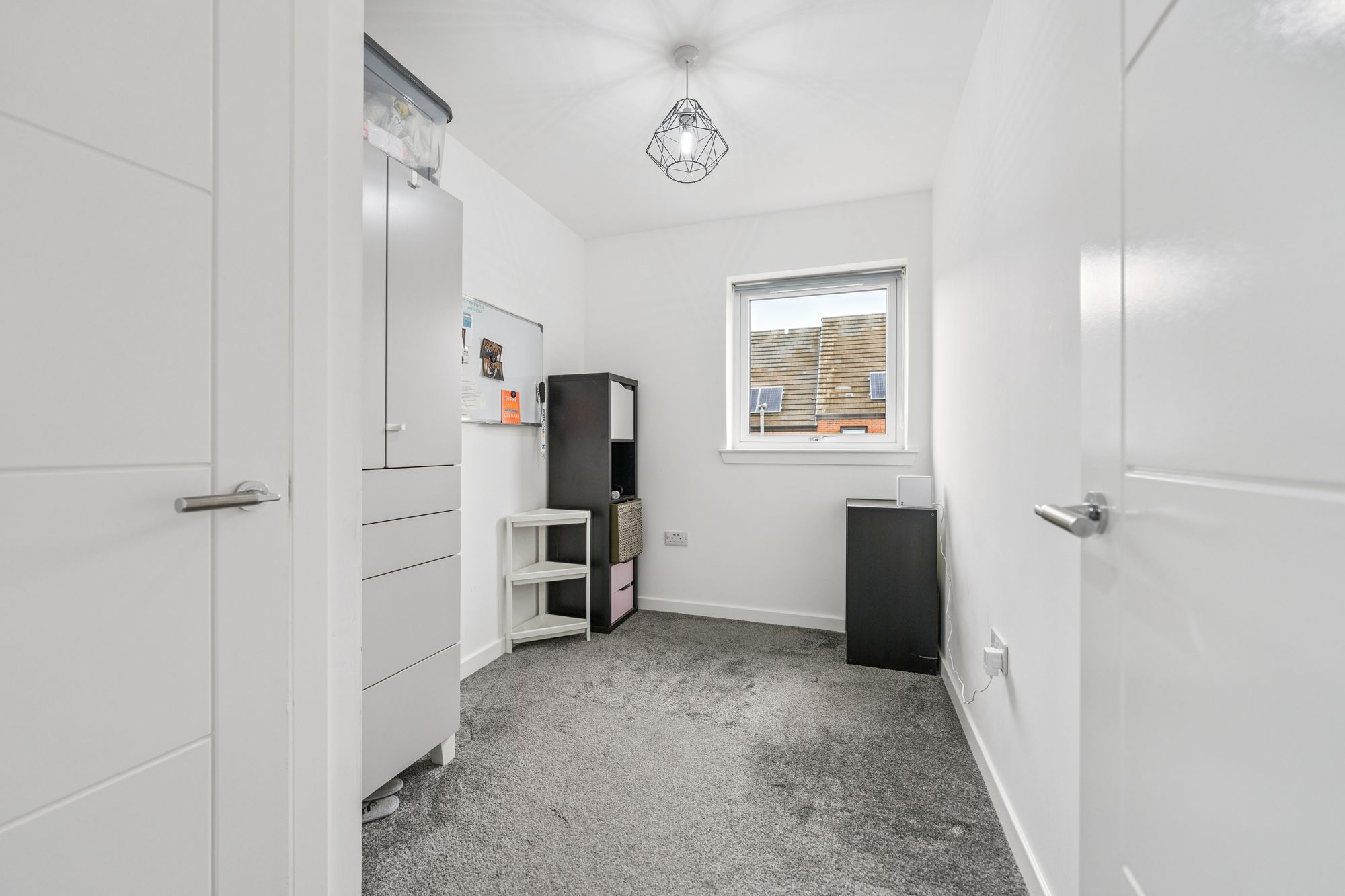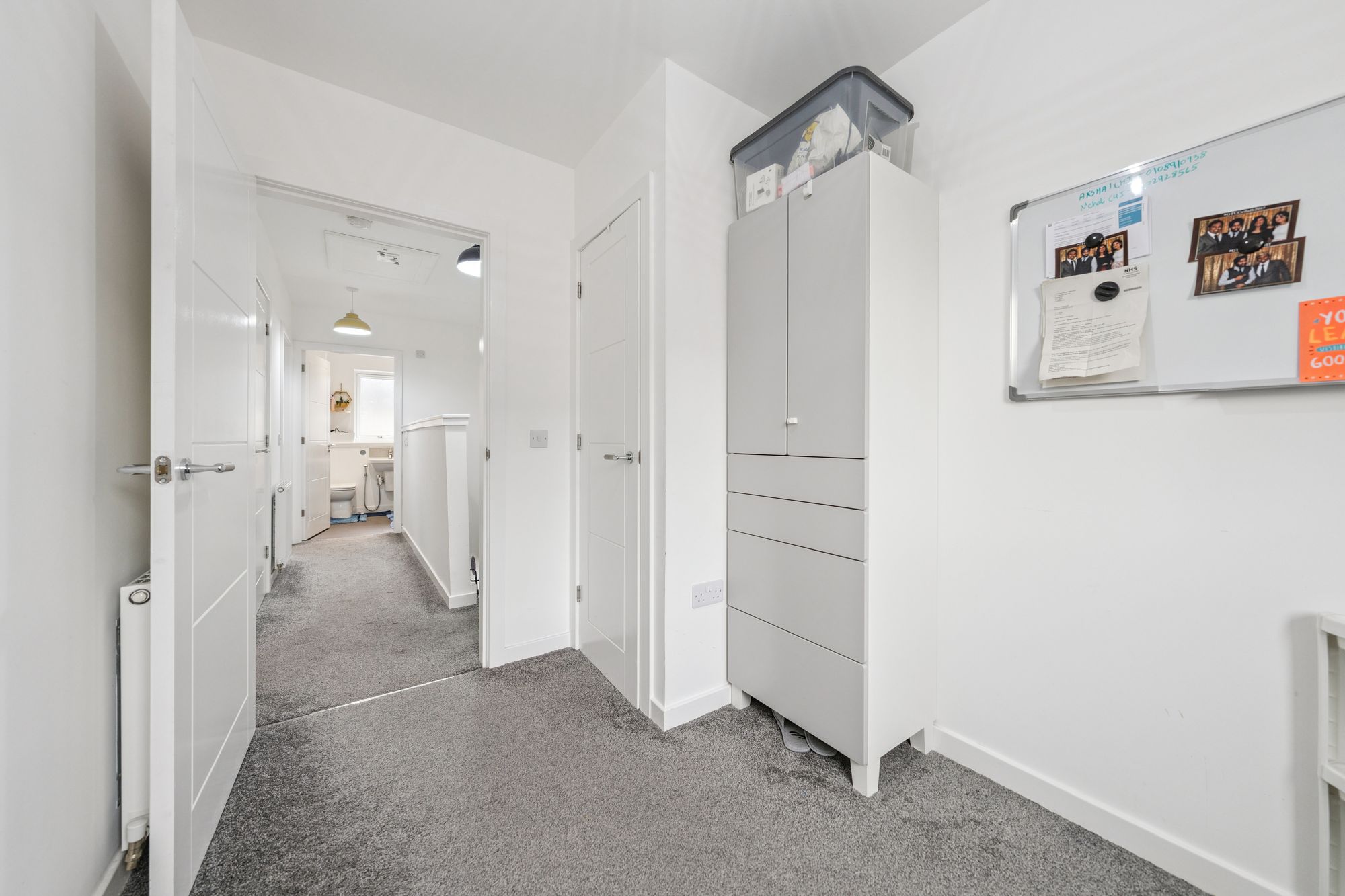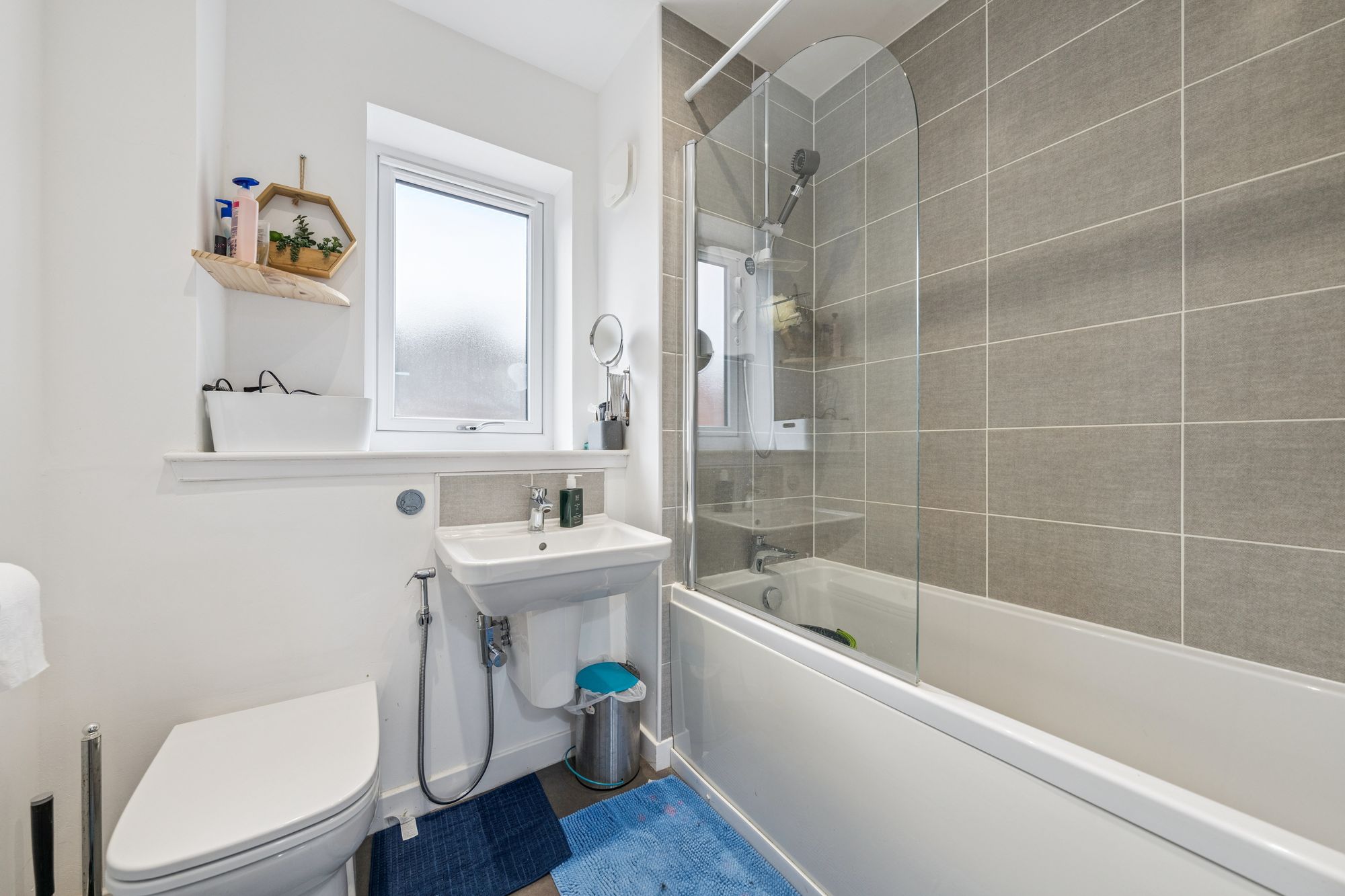 Upstairs, the property offers three well-proportioned bedrooms. The principal bedroom benefits from fitted storage and a sleek en-suite shower room, while the second double bedroom also features in-built storage. The third bedroom, likewise with storage, offers flexibility as a guest room, nursery, or home office. A modern family bathroom with a three-piece suite and shower over bath completes the upper level.