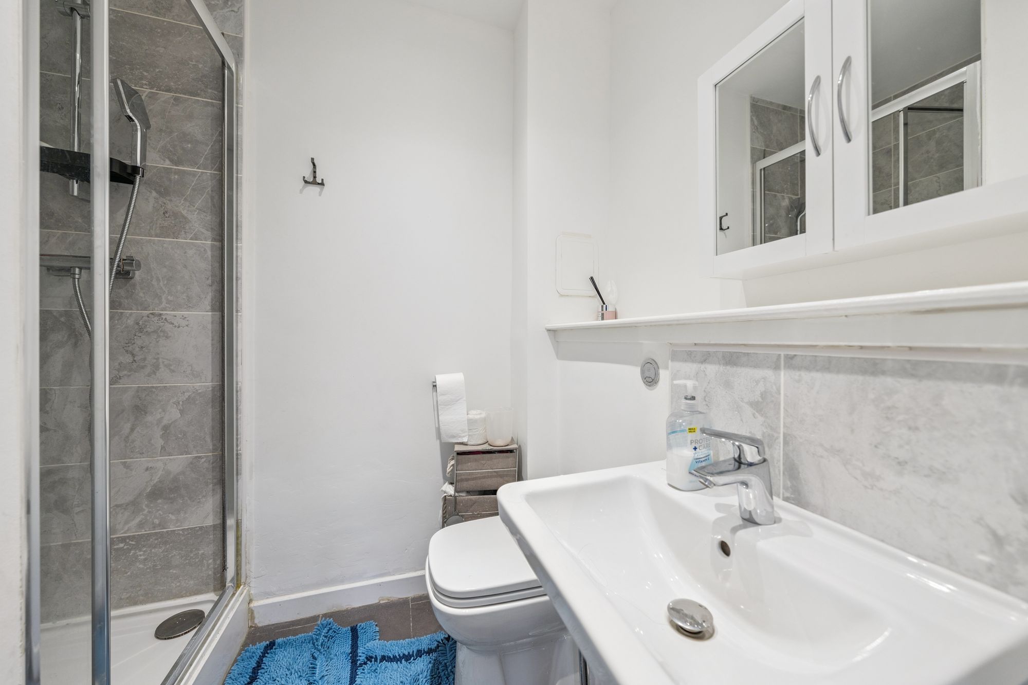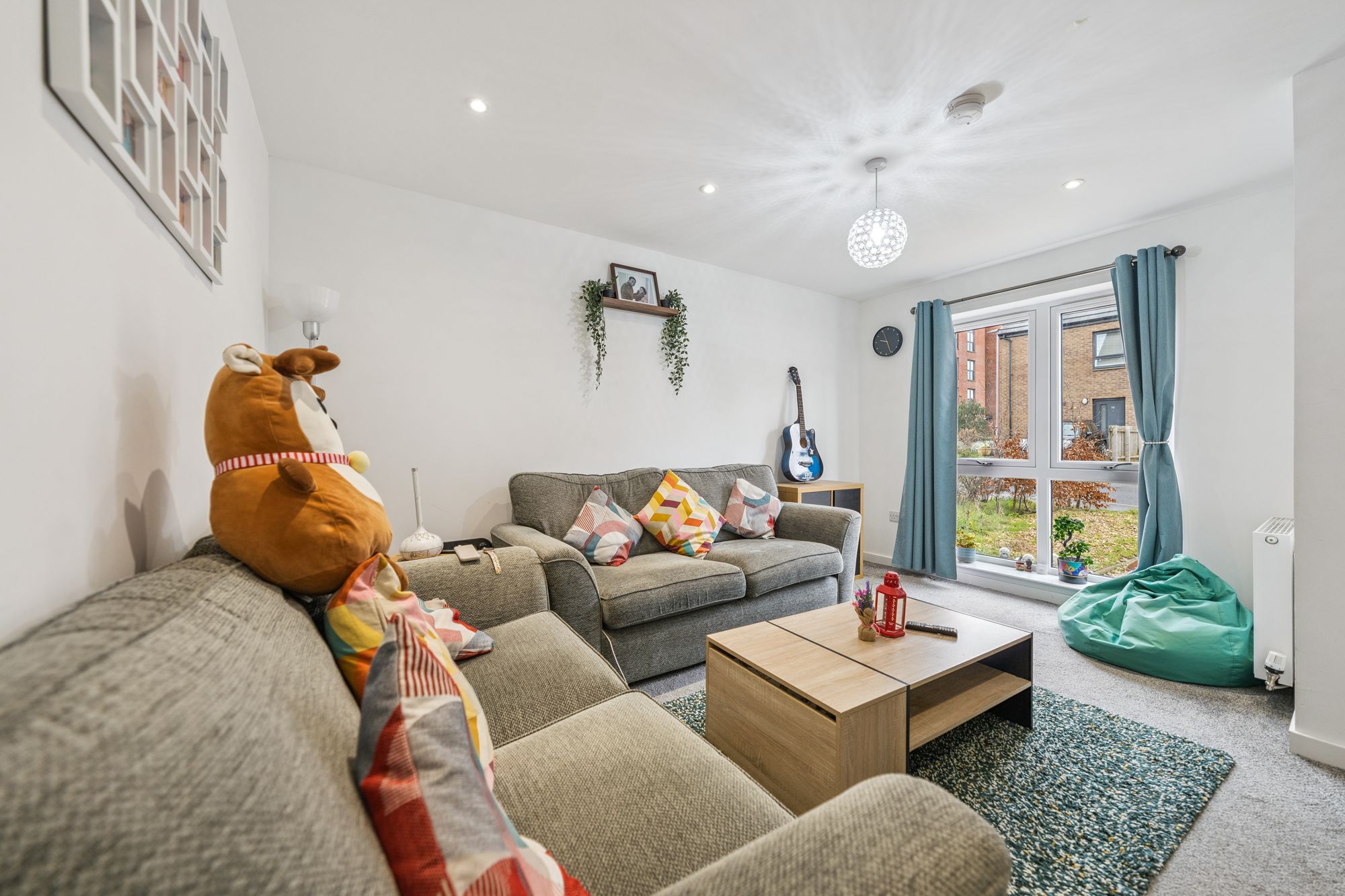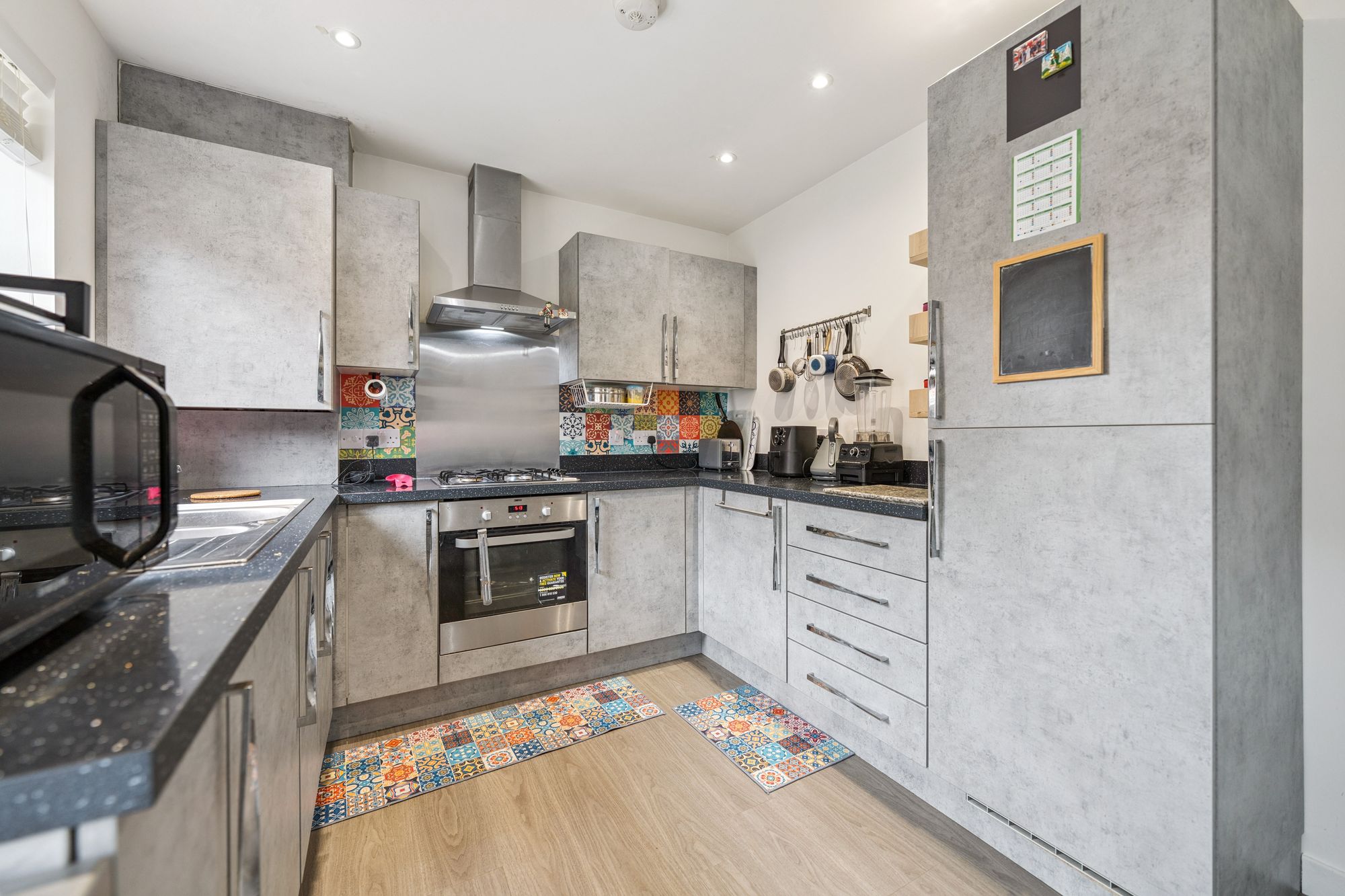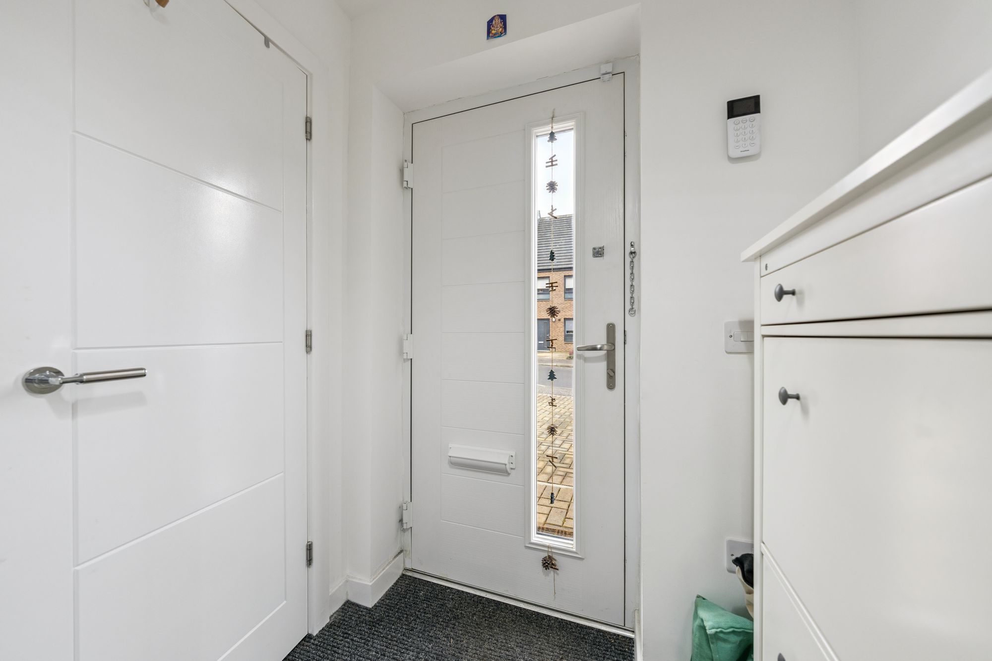 Upstairs, the property offers three well-proportioned bedrooms. The principal bedroom benefits from fitted storage and a sleek en-suite shower room, while the second double bedroom also features in-built storage. The third bedroom, likewise with storage, offers flexibility as a guest room, nursery, or home office. A modern family bathroom with a three-piece suite and shower over bath completes the upper level.