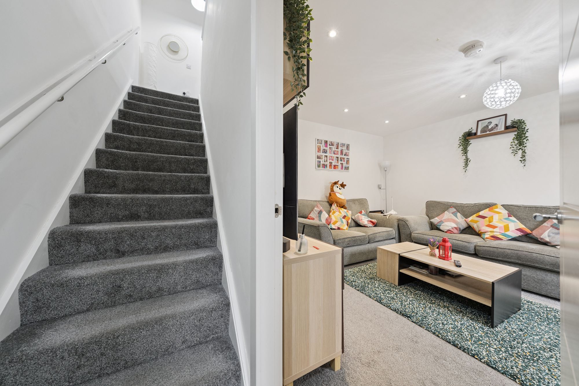 The accommodation opens with a welcoming reception hallway, complete with useful storage, leading through to a bright and spacious lounge, perfect for relaxing or entertaining. To the rear, a contemporary dining-sized kitchen is fitted with integrated appliances and provides direct access to the enclosed private garden. A convenient downstairs WC and additional storage cupboard complete the ground floor.