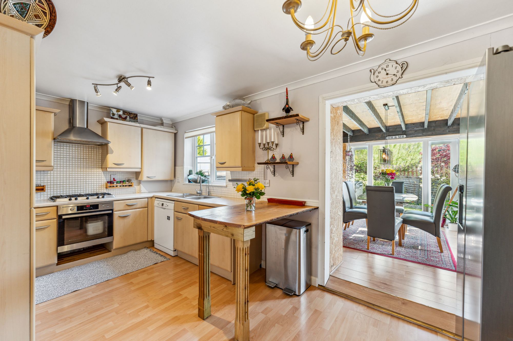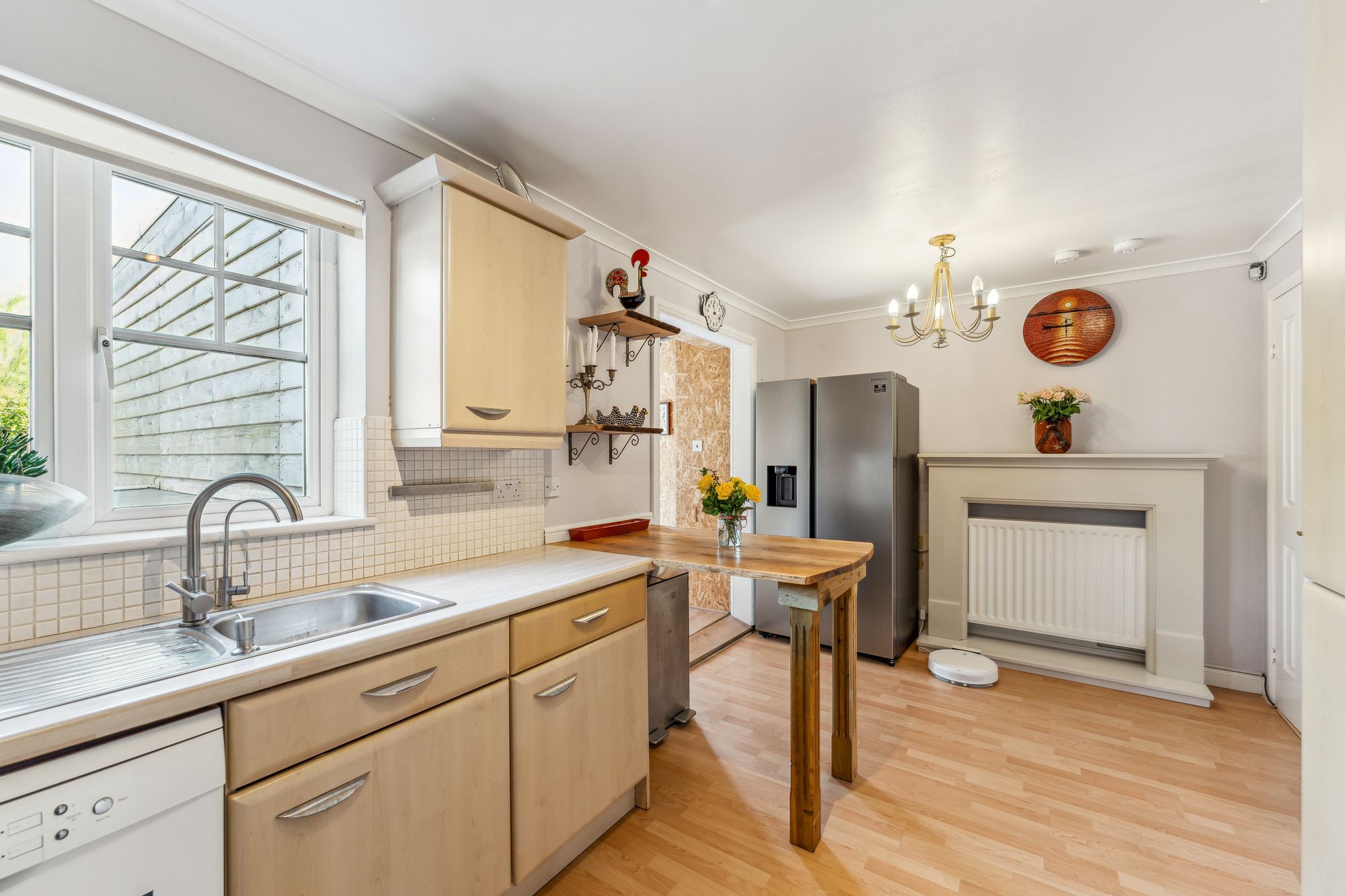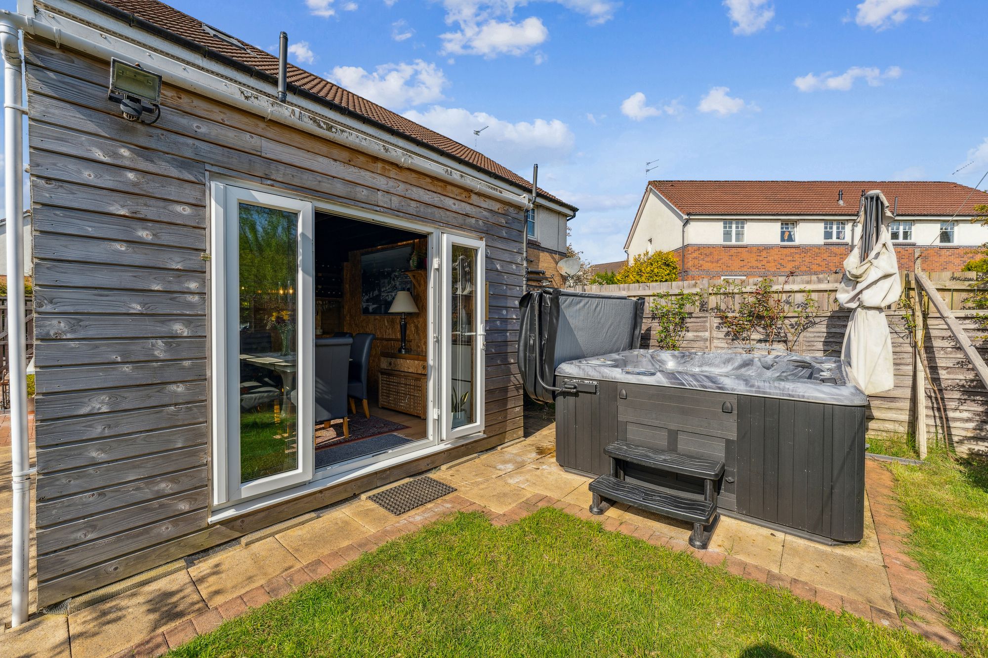 On arrival at the property, you are welcomed by a neat front lawn and a Monoblock driveway accessed via gates allowing off-street parking for two vehicles. Internally, the property offers bright and spacious accommodation over two levels and will appeal to a broad spectrum of buyers. In brief, the accommodation extends to; entrance hallway with w/c off, front facing living room which is semi-open to the dining sized kitchen. The kitchen itself has base and wall mounted units with appliances. There is also a lean-to off the kitchen which is being utilised as a dining room and has double doors leading to the garden. On the upper level there are two bedrooms, both of which have built in storage and a fully tiled bathroom with three piece suite and shower over the bath.