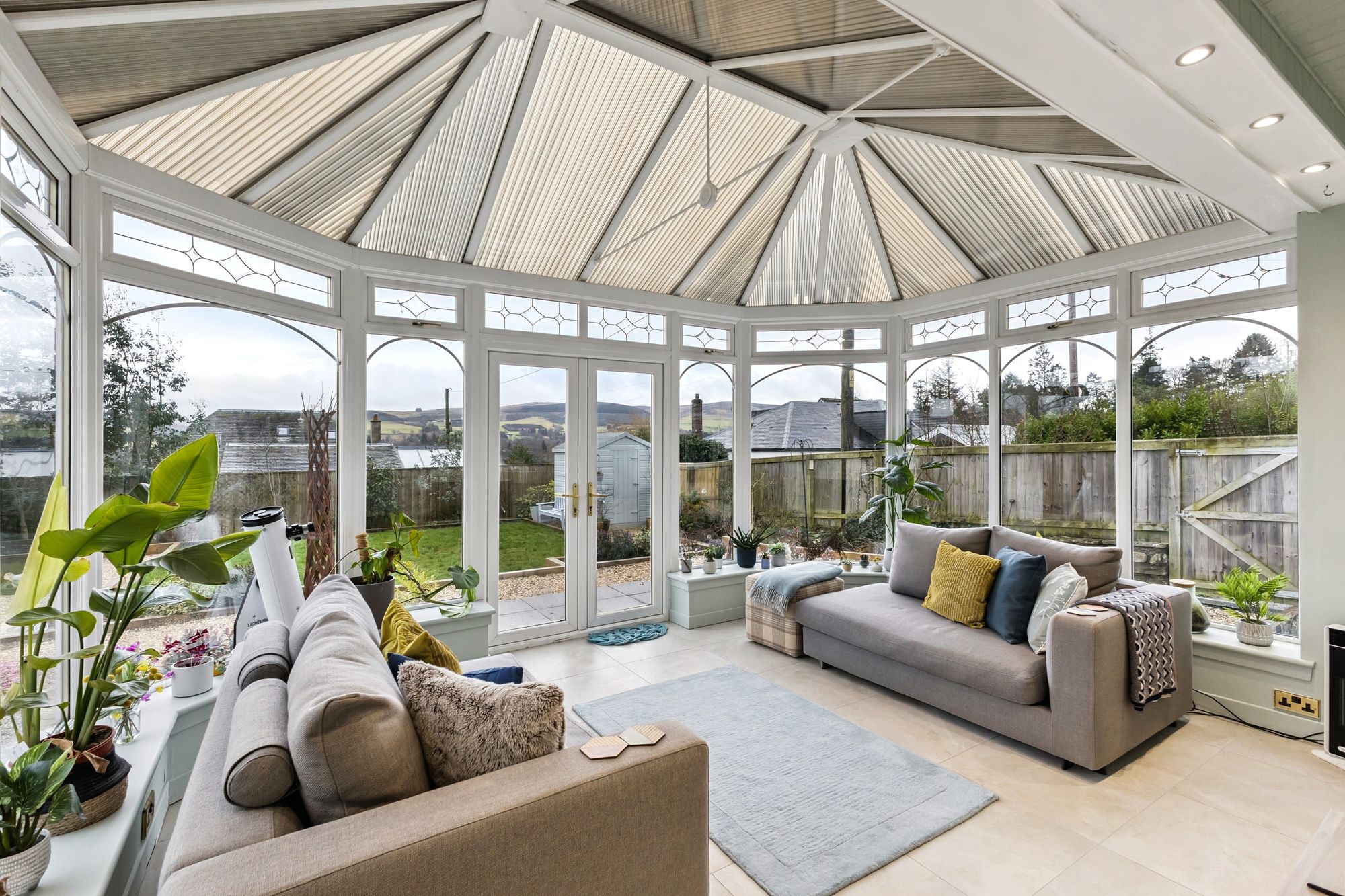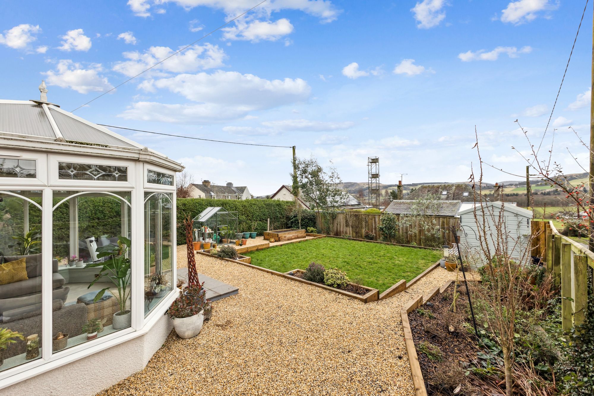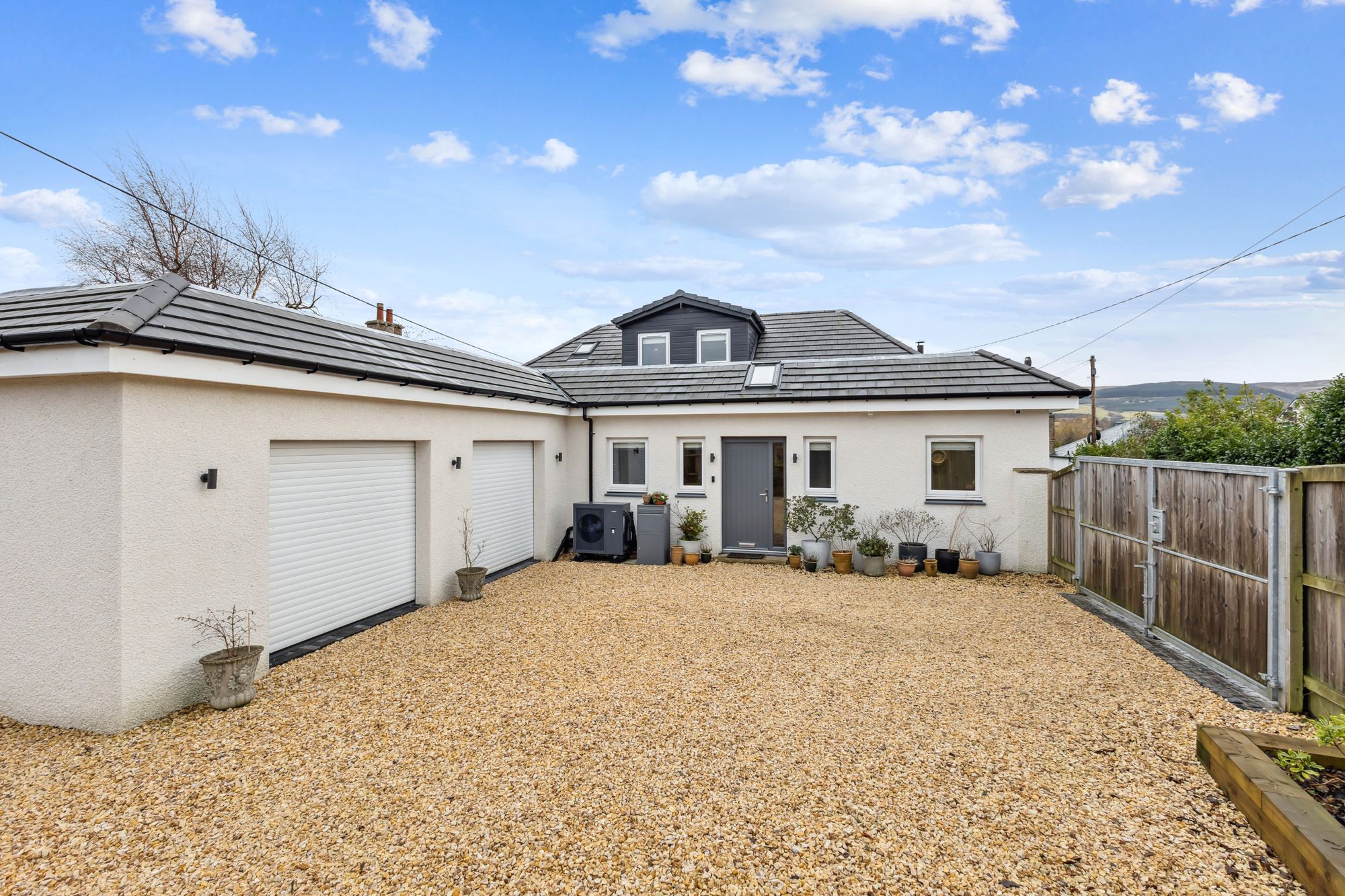 Externally, the villa occupies a large plot with a well-maintained and private rear garden. To the front, there is a courtyard area providing ample parking along with a double garage. Situated on a quiet lane, the property also offers direct access to the nearby field, with scenic views extending over to the Ochils.
