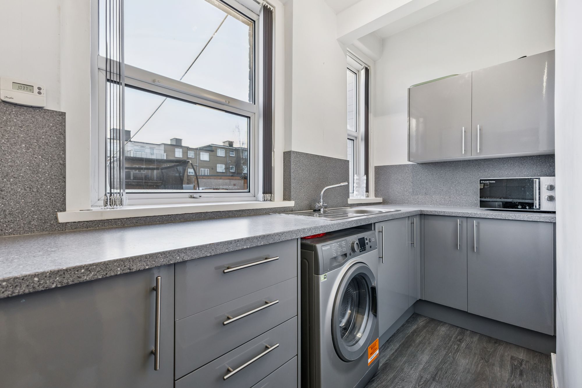 The modern kitchen is fitted with an excellent range of base and wall units, complemented by stylish work surfaces and contemporary appliances. A pleasant outlook over the private rear garden completes the space. Both bedrooms are generously sized doubles, finished in neutral tones and featuring durable LVT flooring for ease of maintenance.
