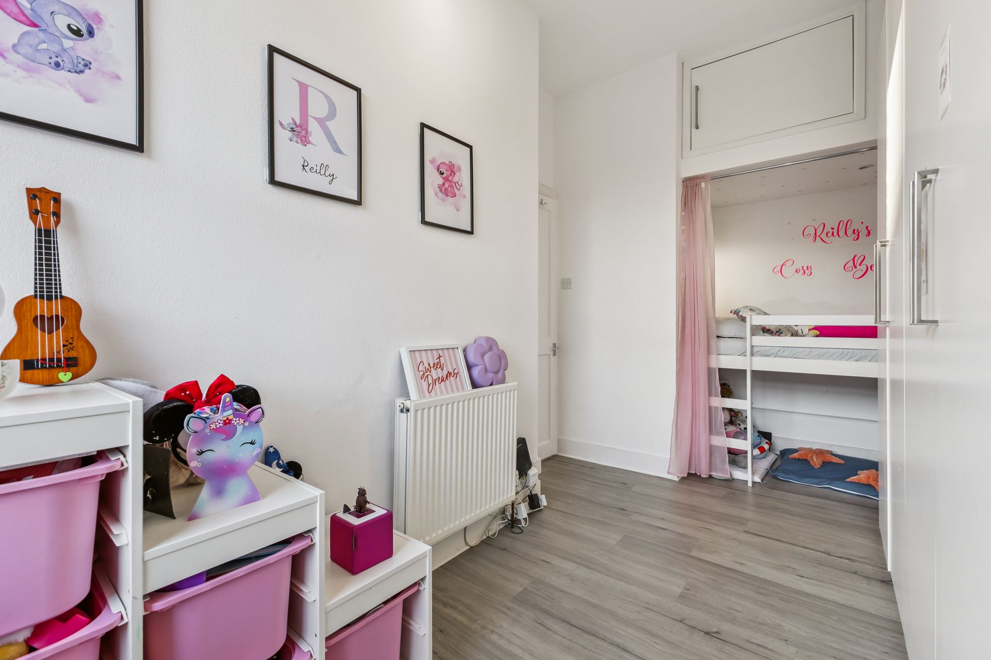 On entering the property, you are welcomed by a bright and well-presented entrance hallway, finished in a tasteful neutral décor that flows seamlessly throughout the home. The spacious reception room benefits from high ceilings and a large window, allowing an abundance of natural light to fill the space. Decorated in fresh white tones, it provides a blank canvas for the new owner and offers ample room for both living and dining furniture.