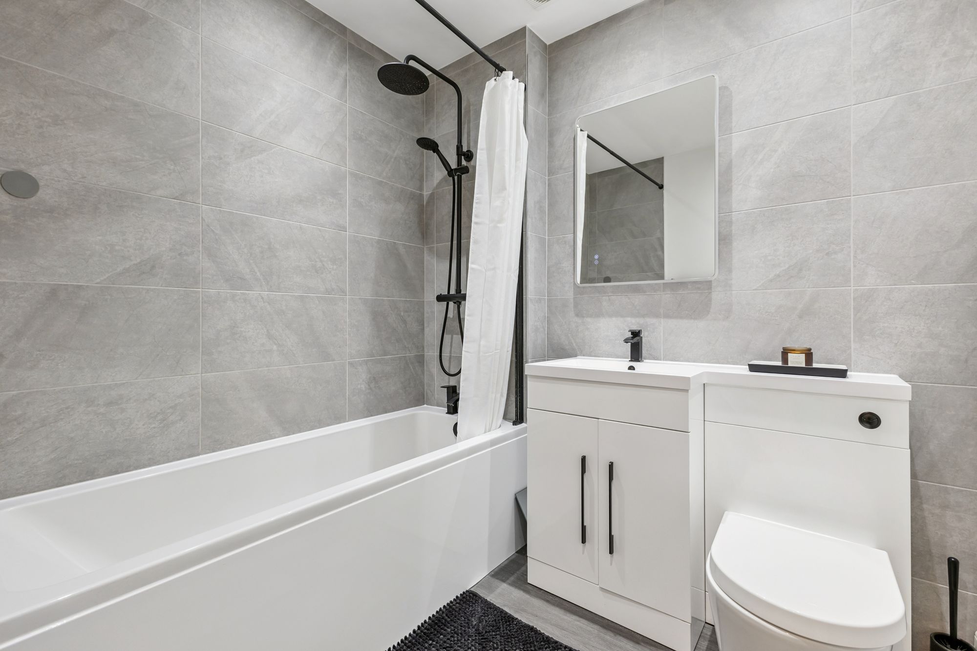 A standout feature of the property is the fully renovated bathroom, beautifully finished with a shower over bath, floor-to-ceiling neutral grey tiling, under-unit storage, LED spotlights, a demister mirror and a striking black heated towel rail.