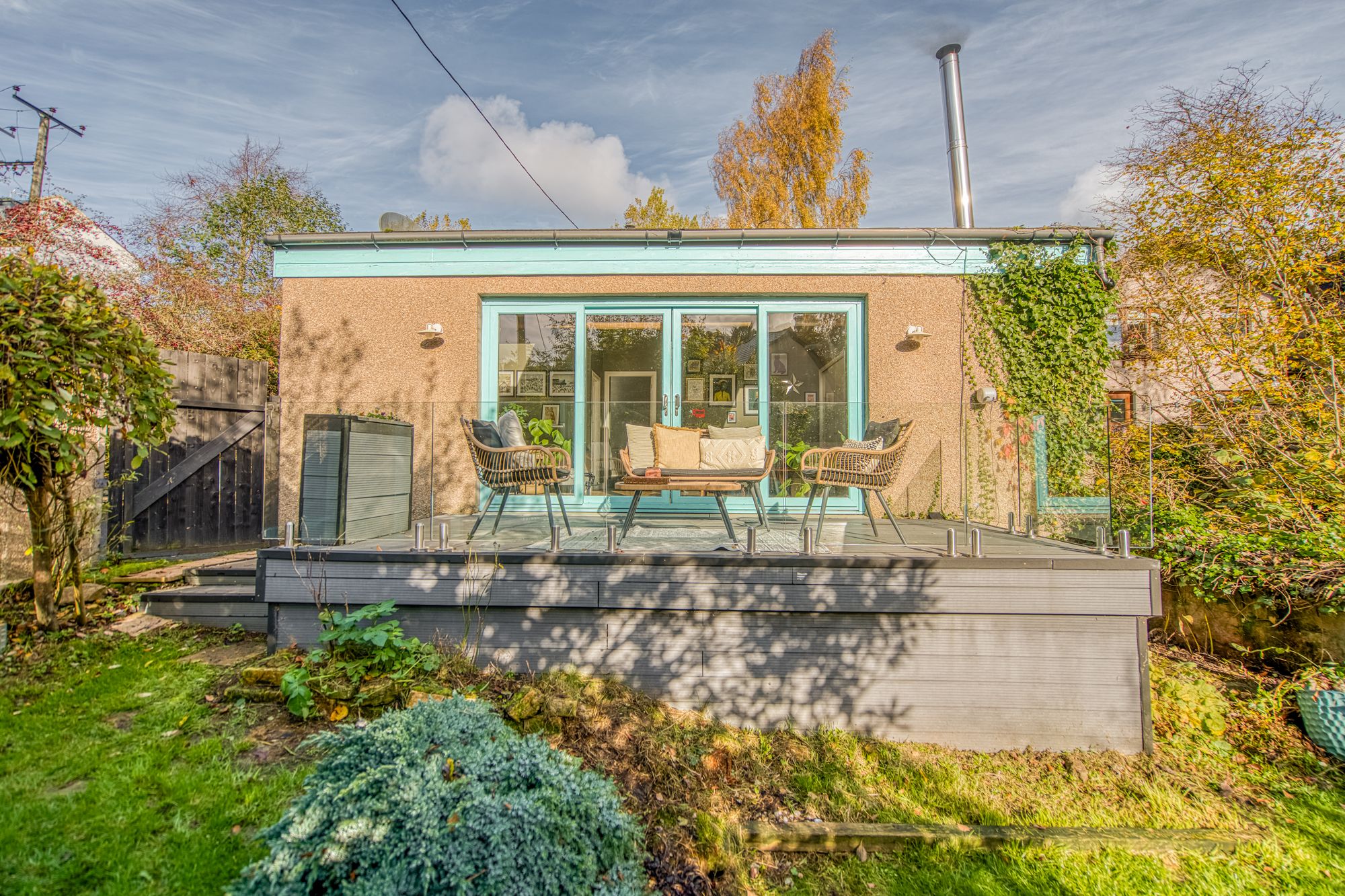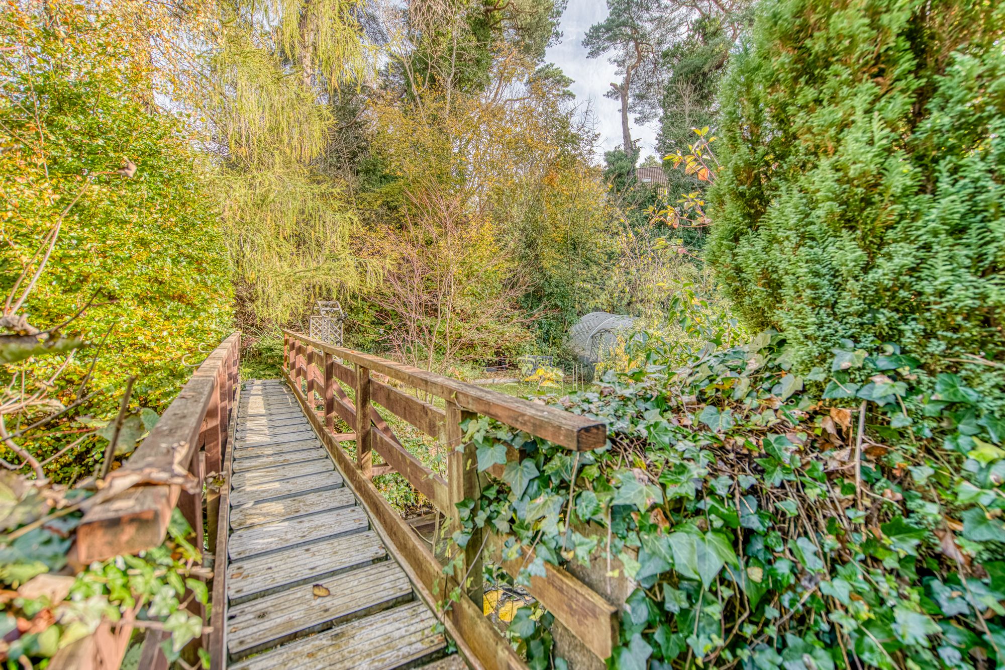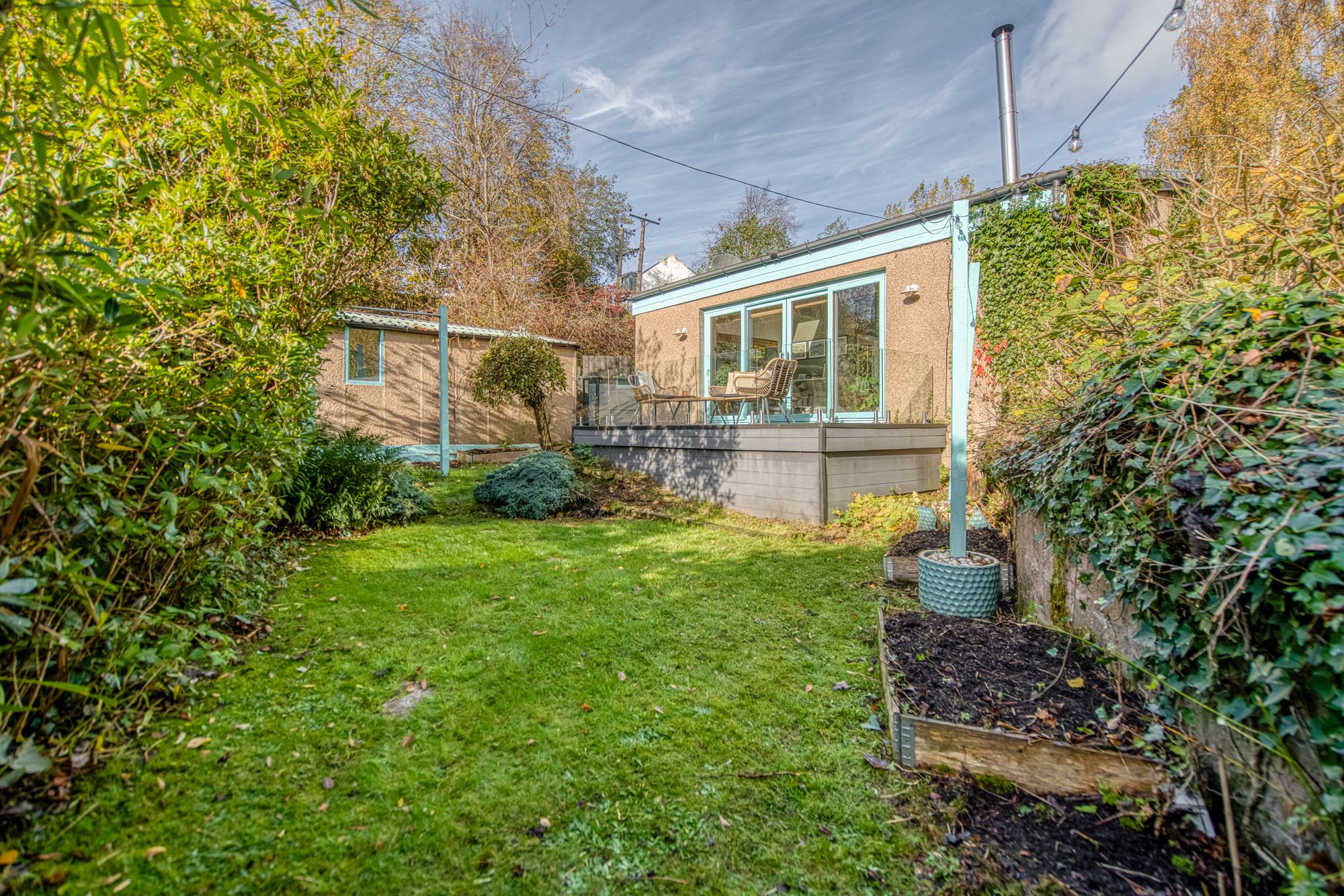 The property sits on the banks of the Kittoch Water which splits the garden and features a wonderful, private bridge adjoining both sides. On one side there is a large decking area adjacent to the lounge over looking a manicured lawn whilst the other features a patio and further planting beds and mature trees and shrubs. Extensive driveway offers ample off street parking opportunities and leads to a detached double garage.