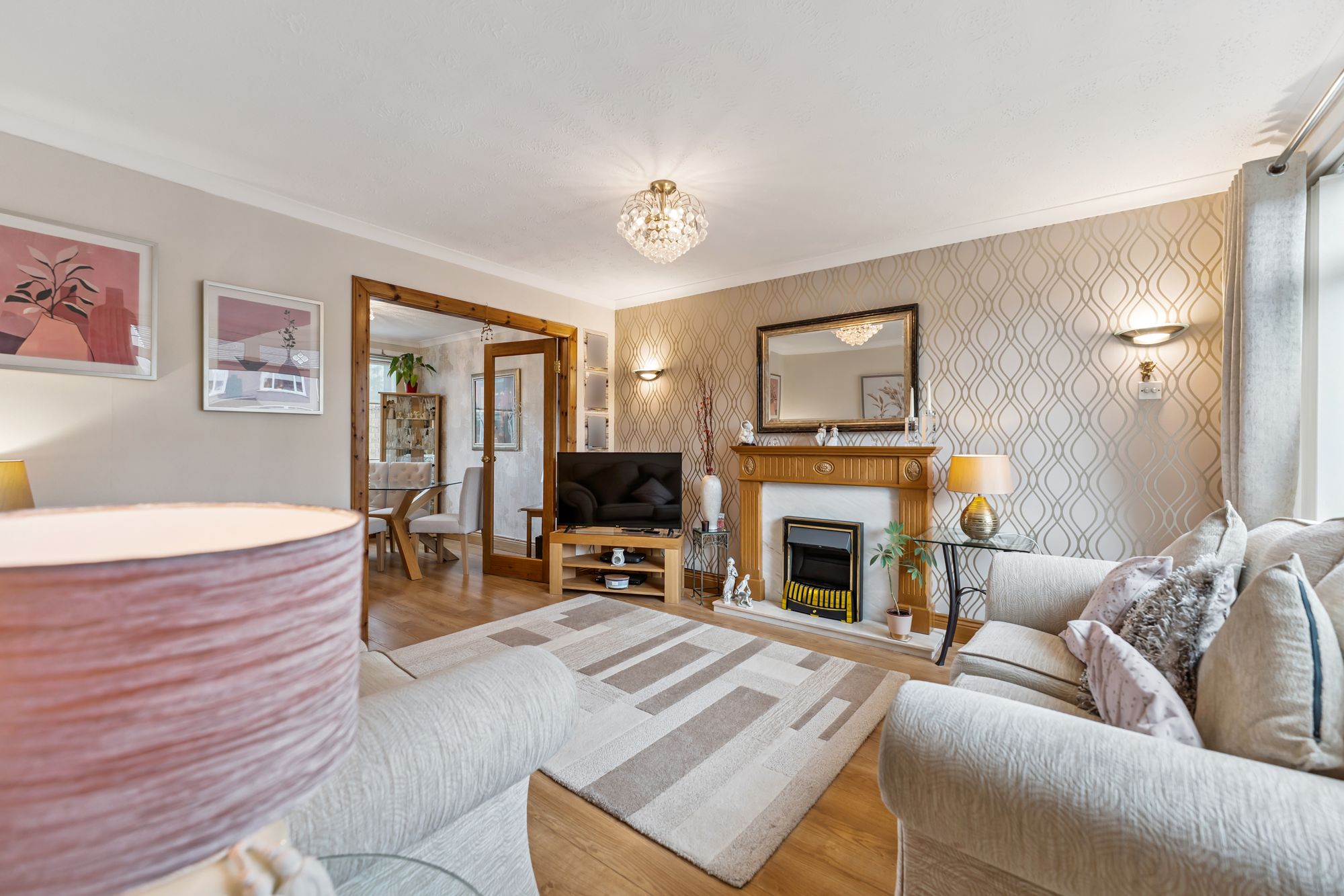 53 Orchy Crescent is a well presented, three bedroom semi-detached villa offering spacious and versatile accommodation in a sought-after residential pocket of Bearsden. The property opens with a welcoming and spacious hallway that leads into a bright lounge featuring a large picture window, feature fireplace and double glass doors connecting to the dining room. The modern white fitted kitchen includes integrated appliances and provides direct access to a stunning sunroom, which is finished with a tiled floor and full-length windows that open out to the rear garden. A convenient downstairs WC completes the ground floor layout.