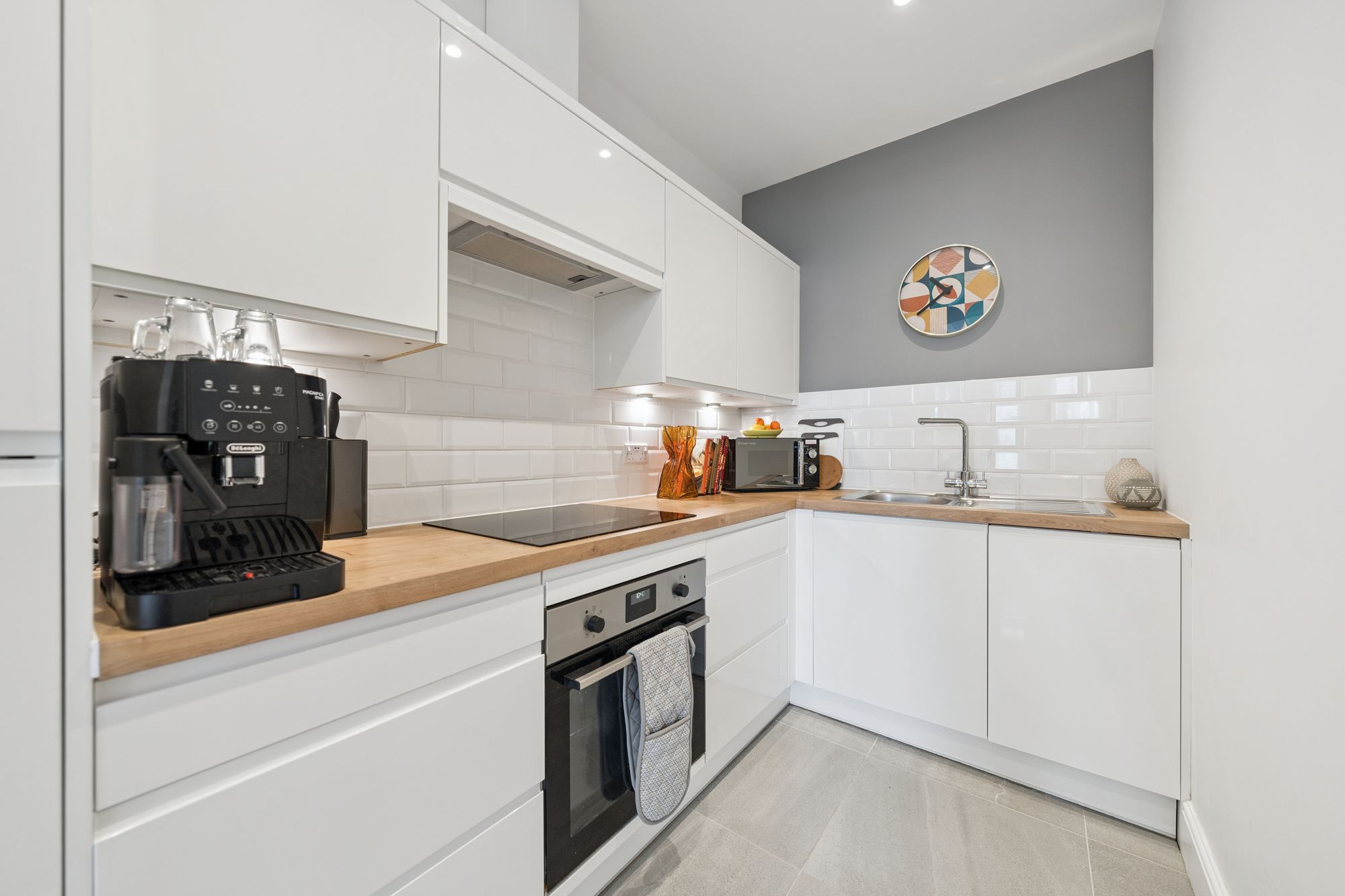 The accommodation is accessed via a welcoming entrance hallway and opens into a stunning bay-windowed lounge, creating an elegant focal point and the perfect space for relaxing or entertaining. The open-plan kitchen seamlessly connects to the living area and features a range of modern floor and wall-mounted units with integrated appliances, creating a sociable and highly functional layout.