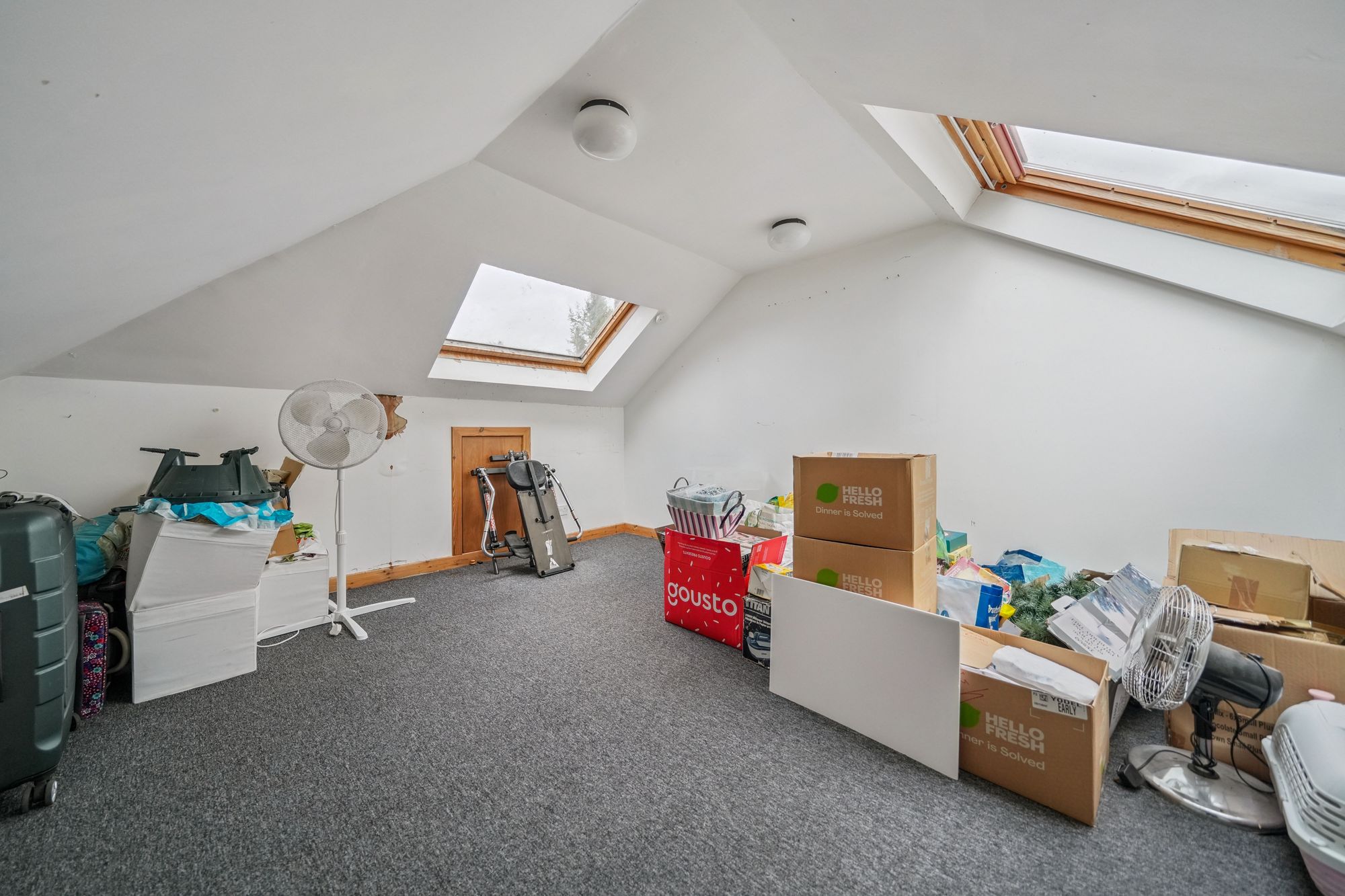 Upstairs, there are two well-proportioned bedrooms, a family bathroom, two storage cupboards, and access to a loft space, offering excellent additional flexibility for the new owner. Externally, the home enjoys extensive garden grounds to the front, side, and rear.