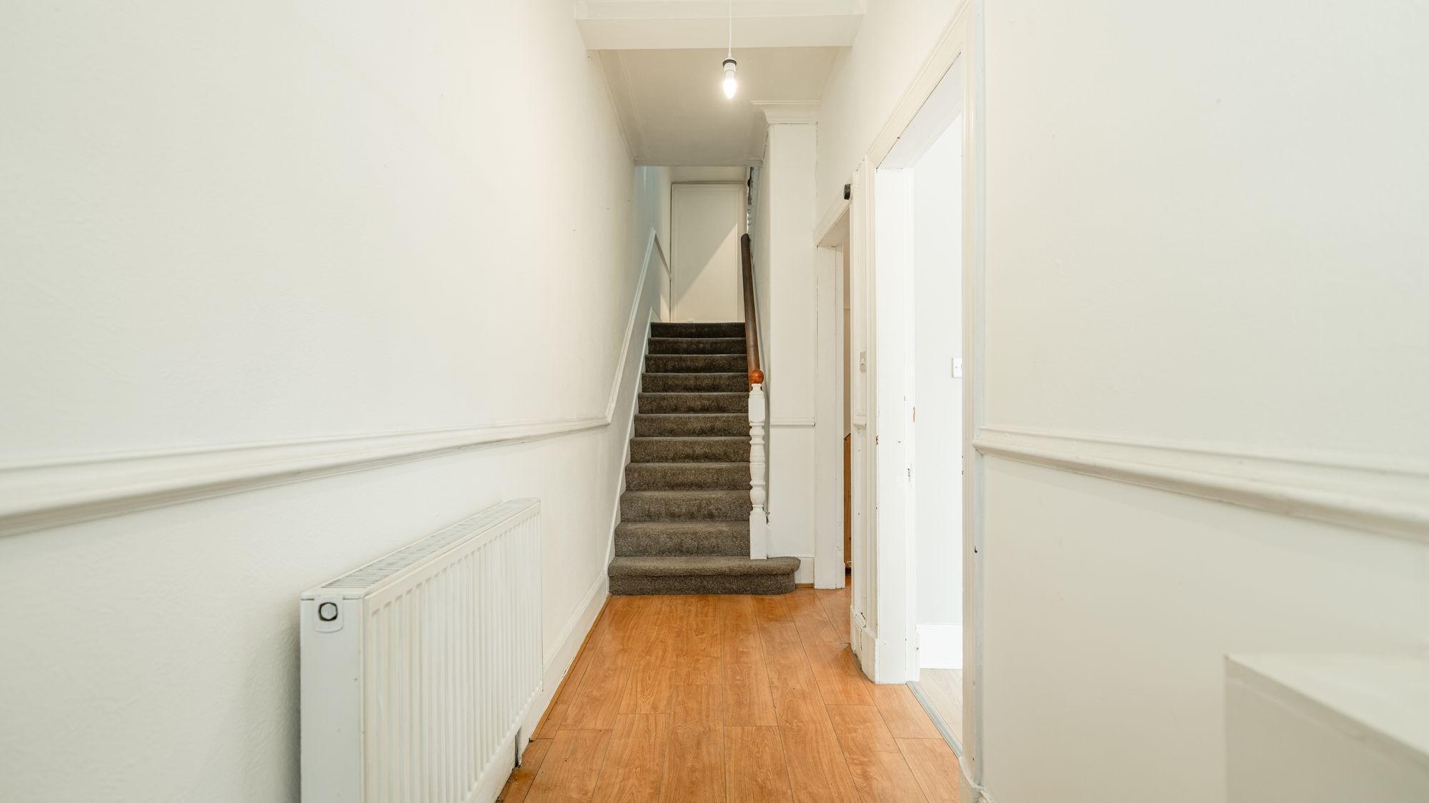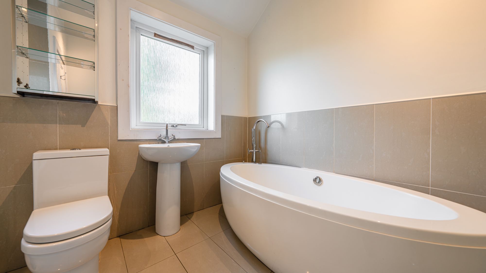 The staircase rises to the first floor, revealing a generously proportioned master bedroom with bay window to the front, a spacious second double bedroom to the rear, and a third bedroom. The family bathroom is complete with a walk in shower and separate bath