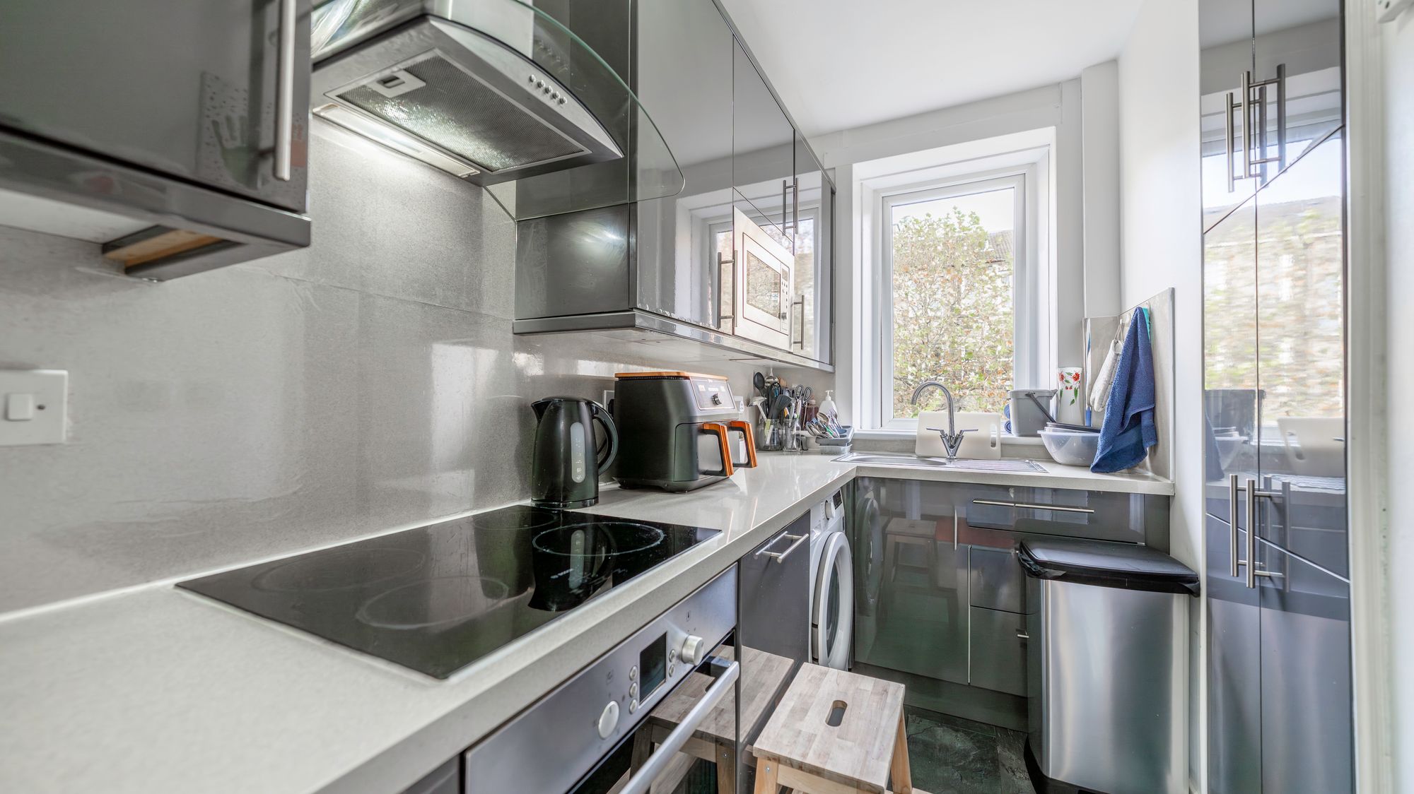 The property offers two generous double bedrooms, both flooded with natural light. The stylish galley-style kitchen features modern wall and floor-mounted units, integrated appliances, and ample worktop space. The bathroom completes the accommodation containing a three-piece suite with a walk-in shower.