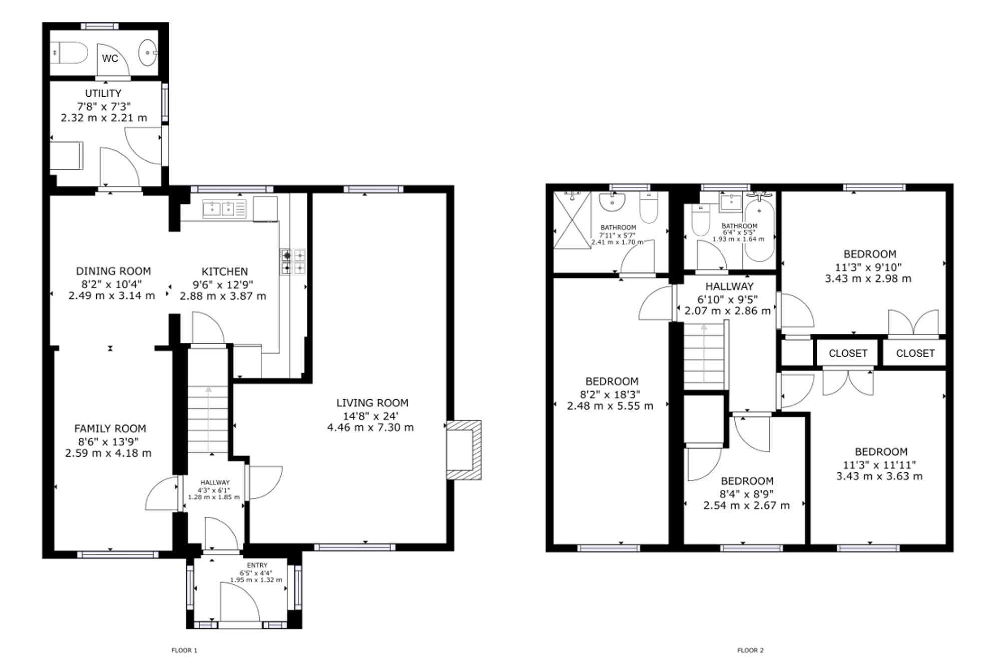 The ground floor opens with an entrance vestibule leading into a bright and comfortable lounge to the right. To the left, a second sitting room leads into an open-plan kitchen and dining area, creating a practical space suited to everyday living. A utility room provides additional storage and laundry space, while a ground floor WC adds convenience.