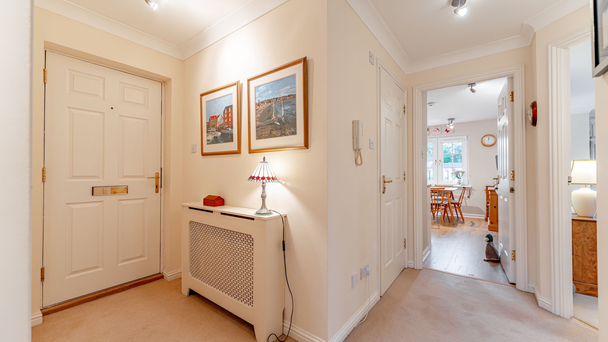 Access to the flat is through a secure entry system, leading into a well kept, carpeted communal hallway. The flat itself opens to a welcoming hallway with built in storage cupboards. The lounge is spacious and filled with natural light, comfortably accommodating both seating and dining areas. The modern kitchen is fitted with a range of wall and floor units, along with integrated appliances such as an oven, electric hob, microwave, and dishwasher. There is also space for a breakfast table and chairs.