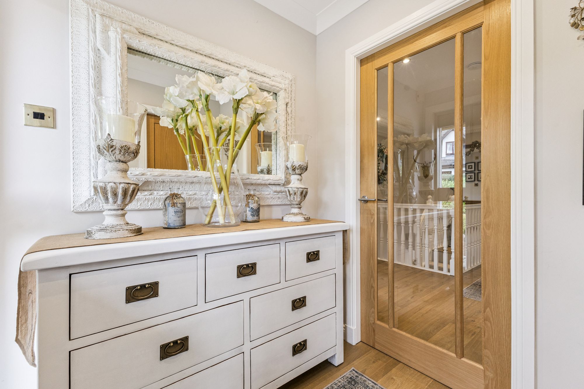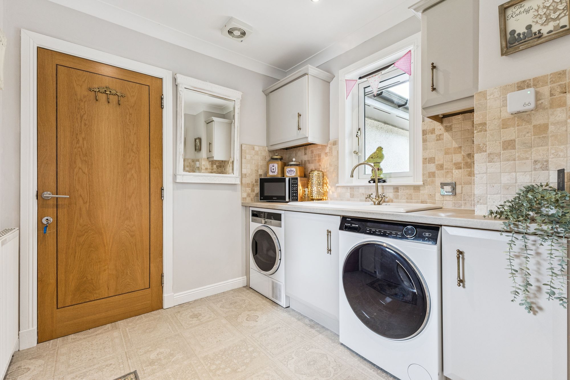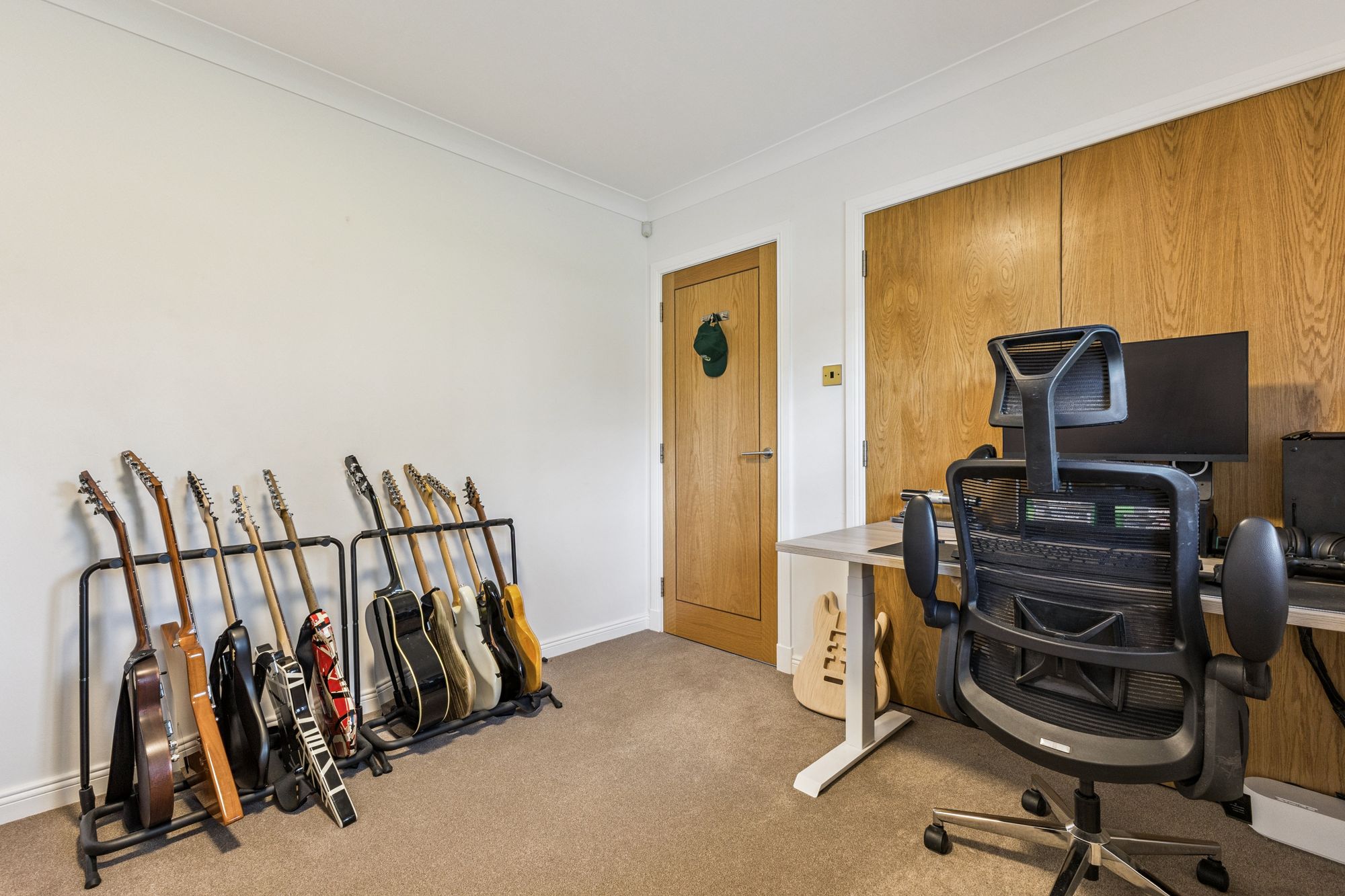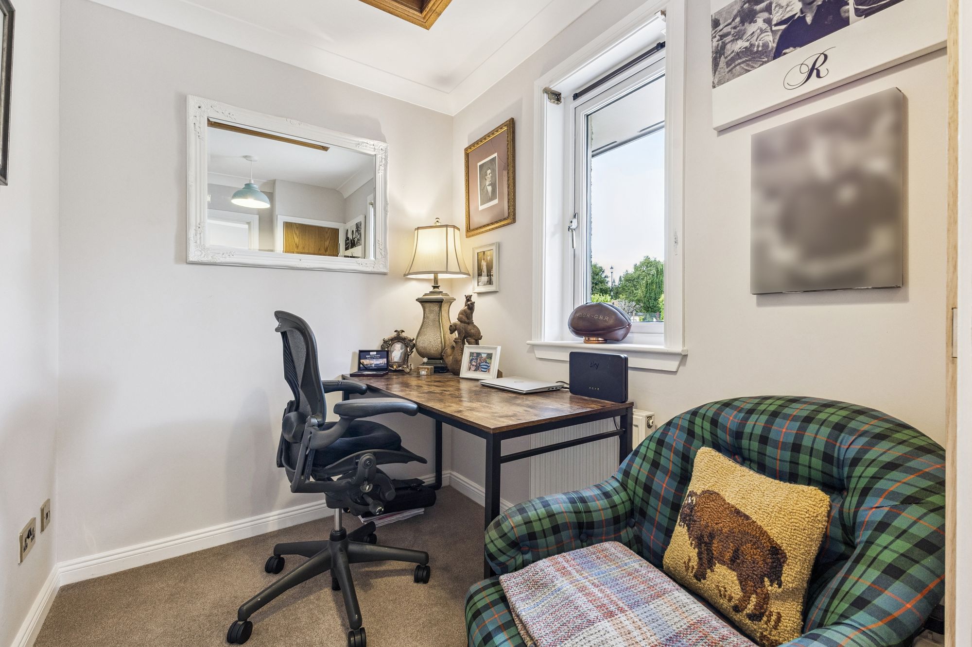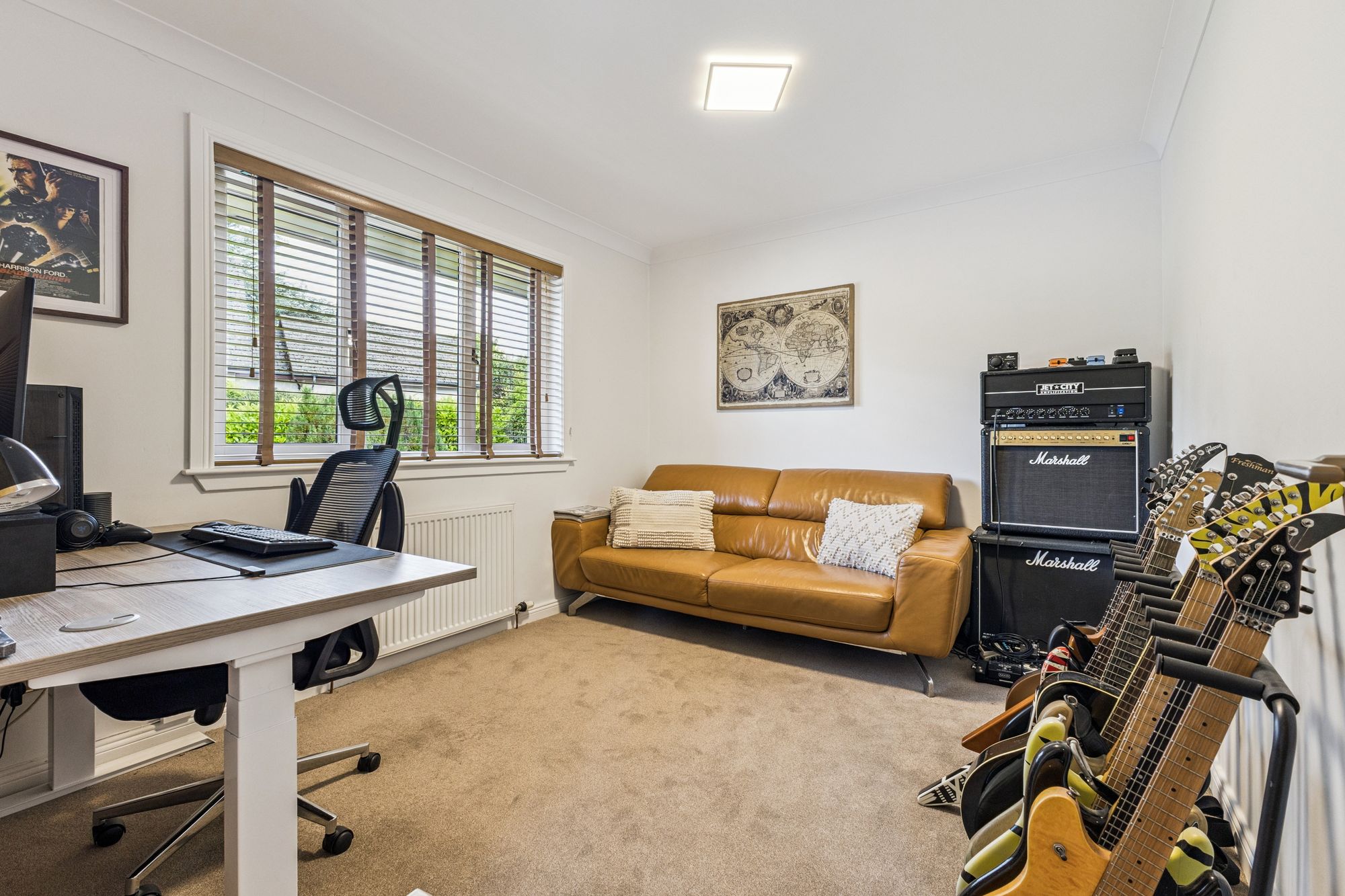 On the ground floor, the accommodation includes a welcoming entrance vestibule leading into the main hall, a bright and spacious lounge with an adjoining dining area, a separate study perfect for home working, a well-proportioned bedroom, a modern family bathroom, a well-equipped kitchen, and a practical utility room.