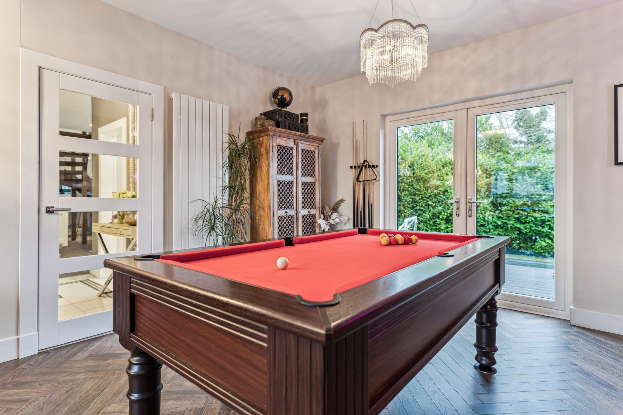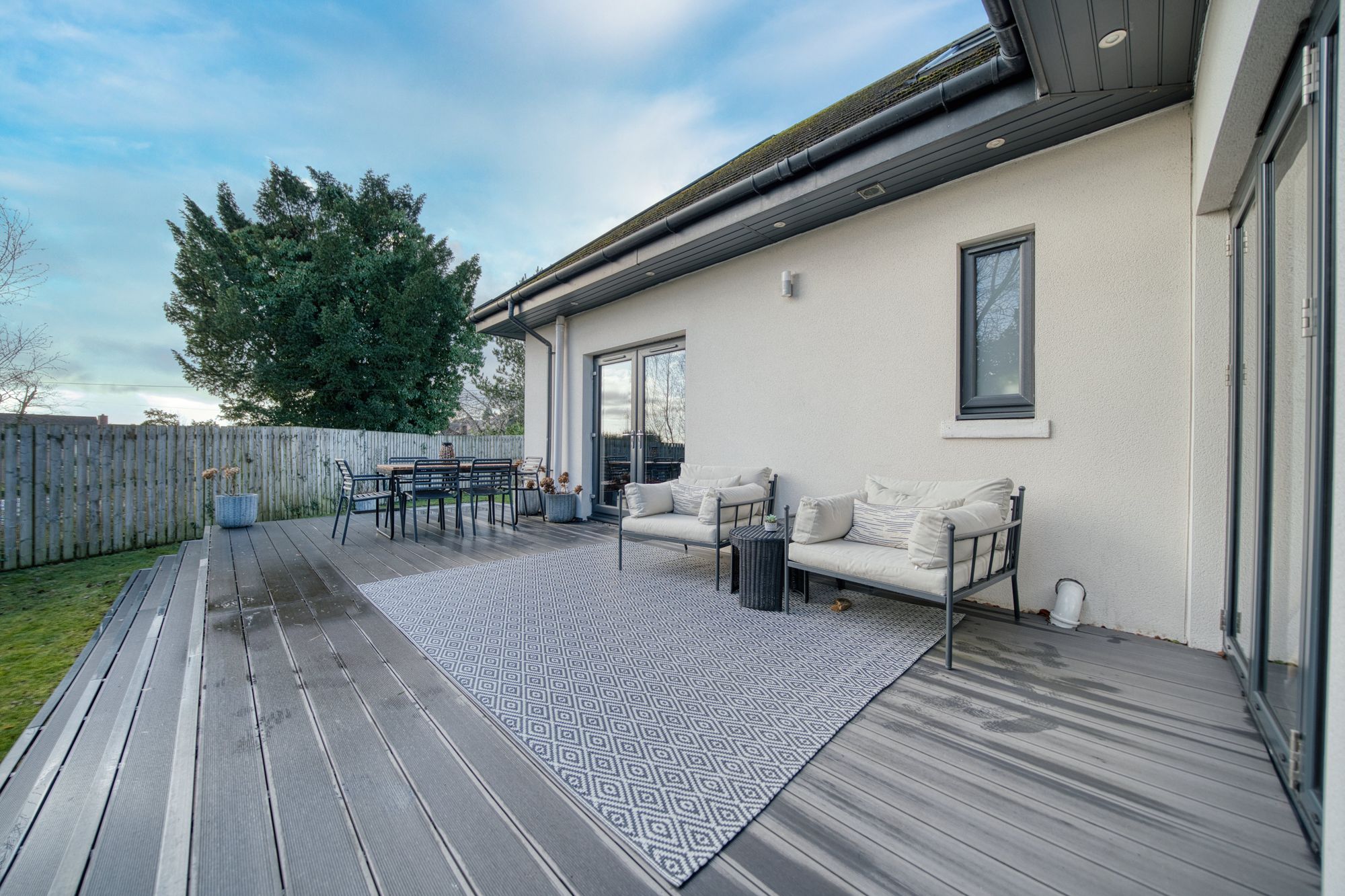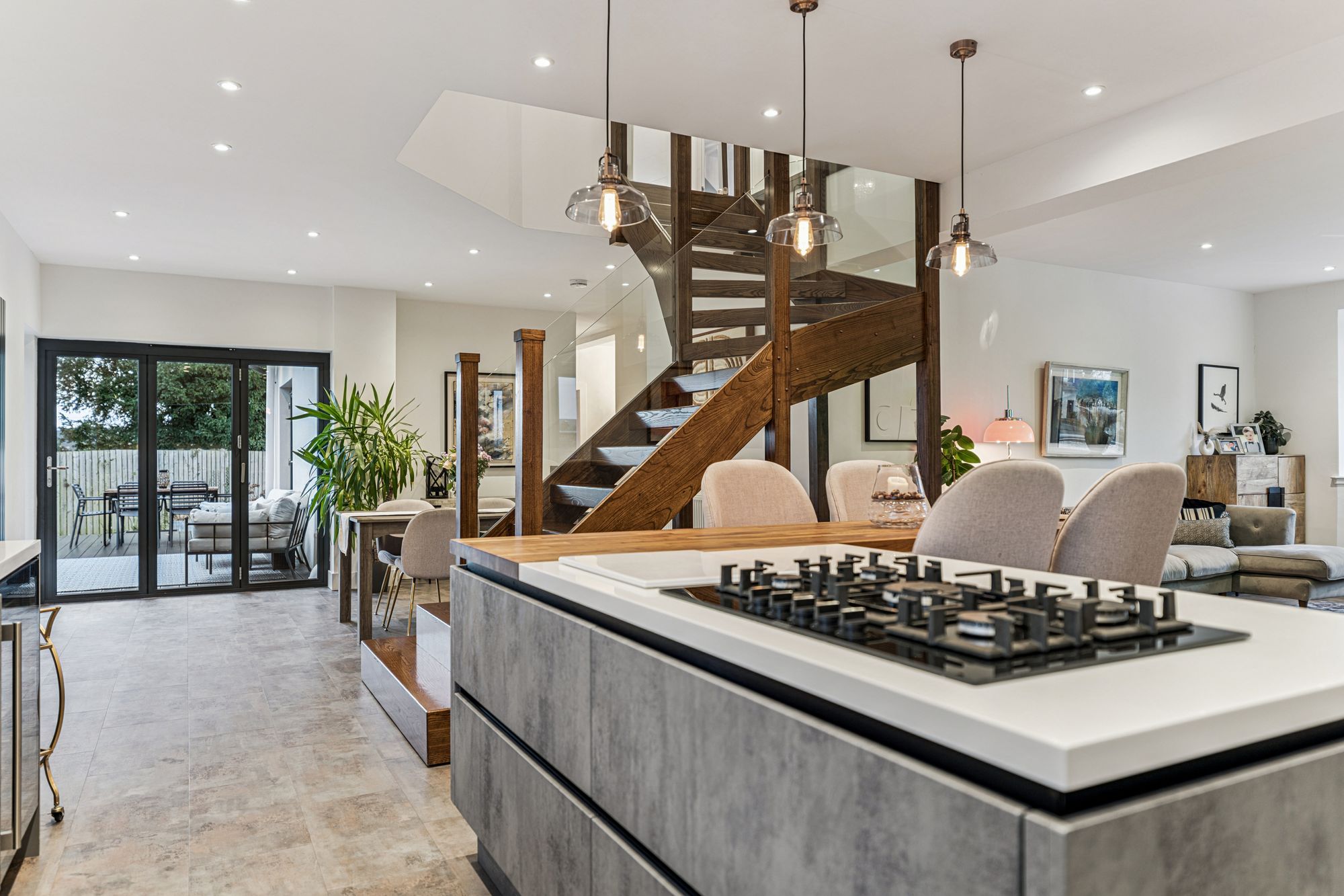 Commanding a spacious plot, the property is surrounded by sweeping garden grounds with extensive driveway parking to the front leading to a detached garage. There is a large area of lawn which wraps around the home and features a patio as well as a broad, composite decking area adjacent to the bifolding doors from the kitchen and a timber built garden room.
