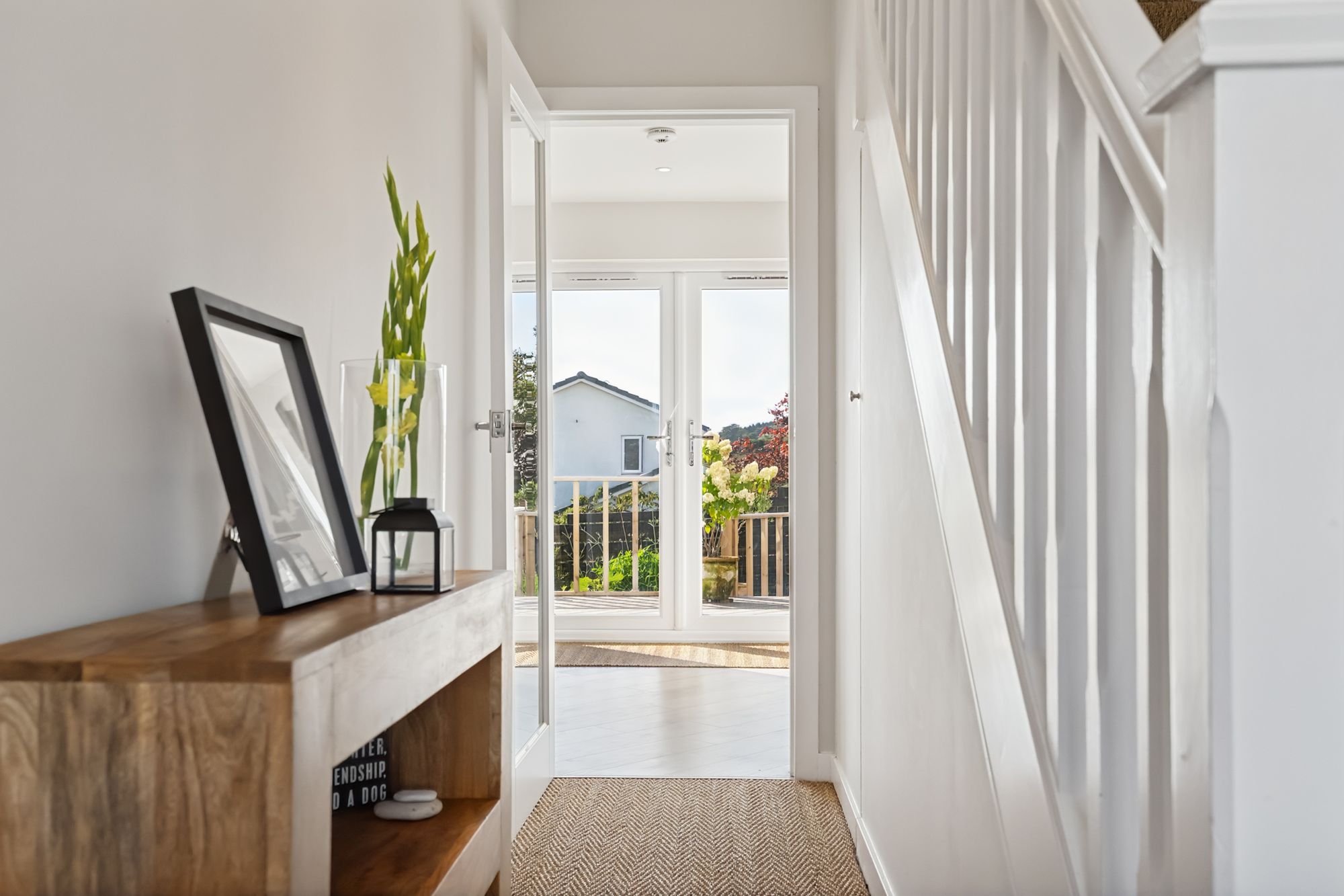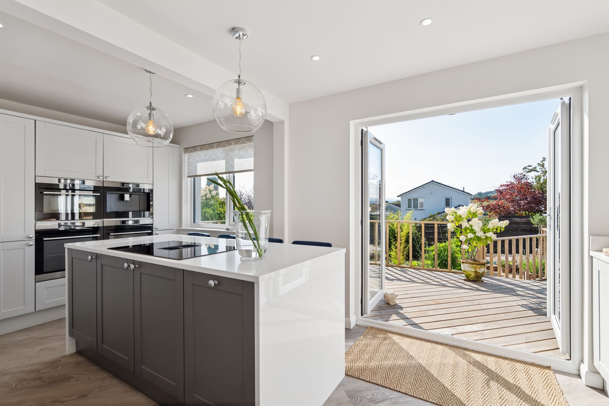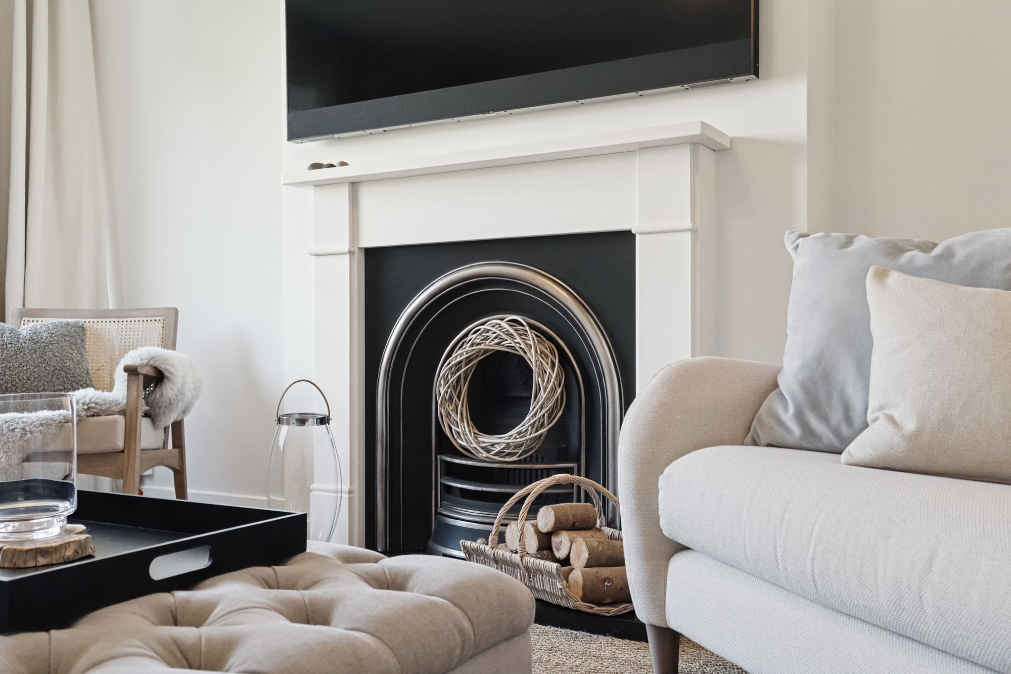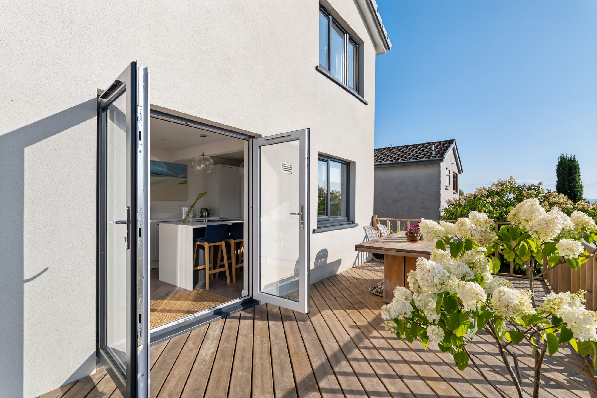 Upon entering the property, you are met with a bright and welcoming entrance hall which leads through to a beautifully modern dining kitchen. Crafted with high quality units, integrated appliances, quartz countertops, Belfast sink, and a large dining island with an integrated Faber hob and extractor. There are French doors, flooding the kitchen with natural light, opening out onto a large rear timber deck with dining table and sun loungers, making it the perfect place to socialise or a calming place to relax. Also on this floor is the bright and contemporary lounge with a decorative fireplace at its focal point overlooking the front garden. There is also a large storage cupboard under the stairs, perfect for family living.