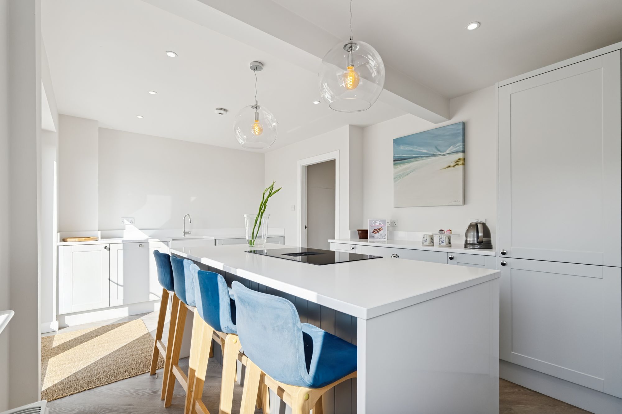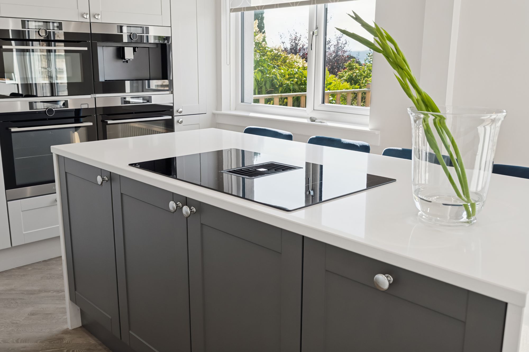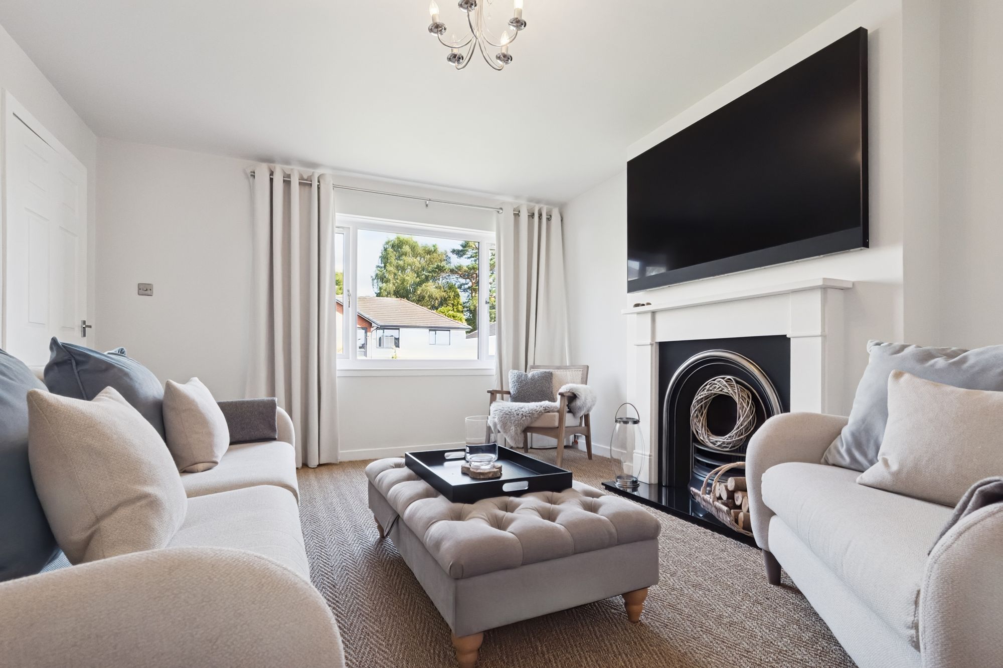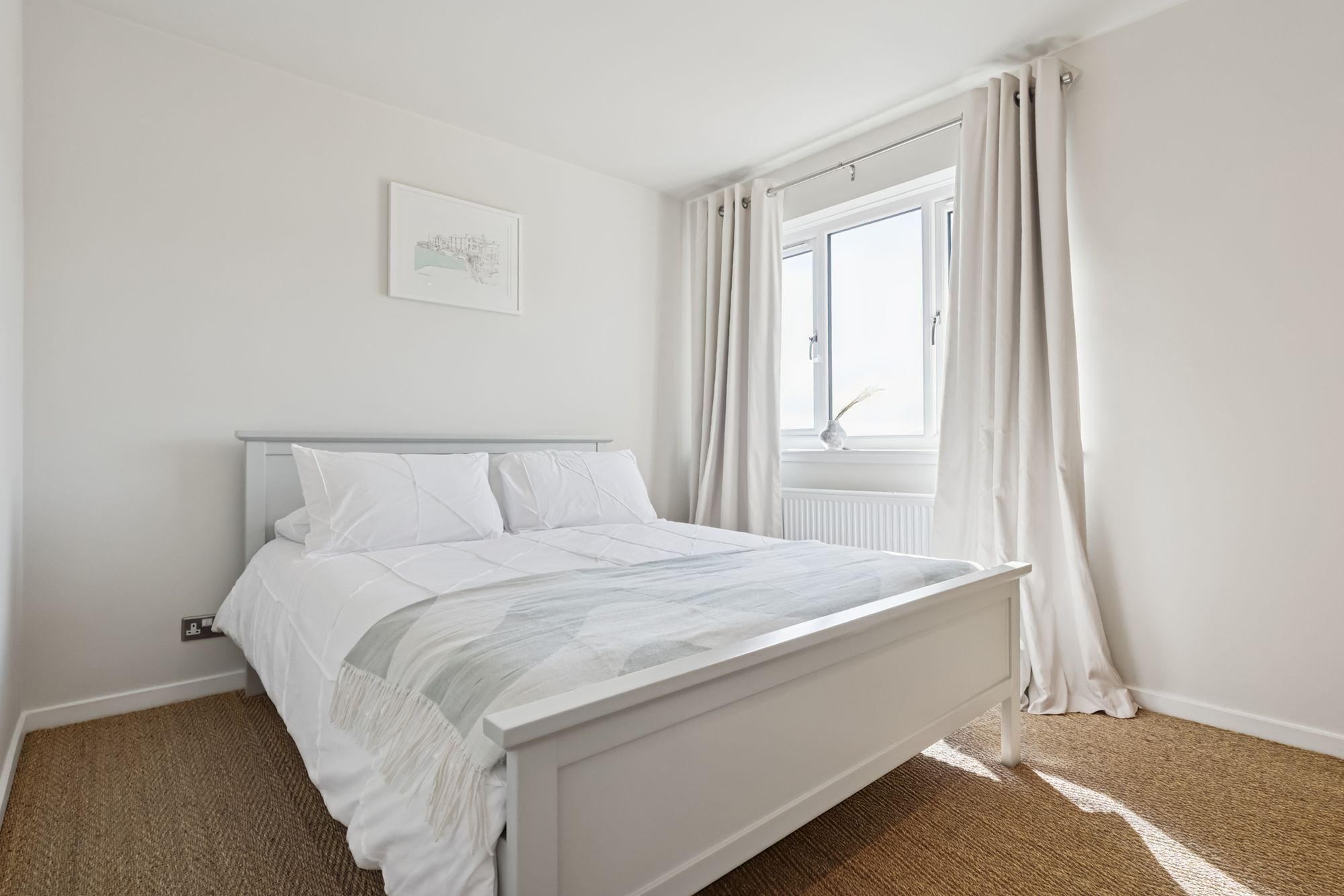 Upon entering the property, you are met with a bright and welcoming entrance hall which leads through to a beautifully modern dining kitchen. Crafted with high quality units, integrated appliances, quartz countertops, Belfast sink, and a large dining island with an integrated Faber hob and extractor. There are French doors, flooding the kitchen with natural light, opening out onto a large rear timber deck with dining table and sun loungers, making it the perfect place to socialise or a calming place to relax. Also on this floor is the bright and contemporary lounge with a decorative fireplace at its focal point overlooking the front garden. There is also a large storage cupboard under the stairs, perfect for family living.