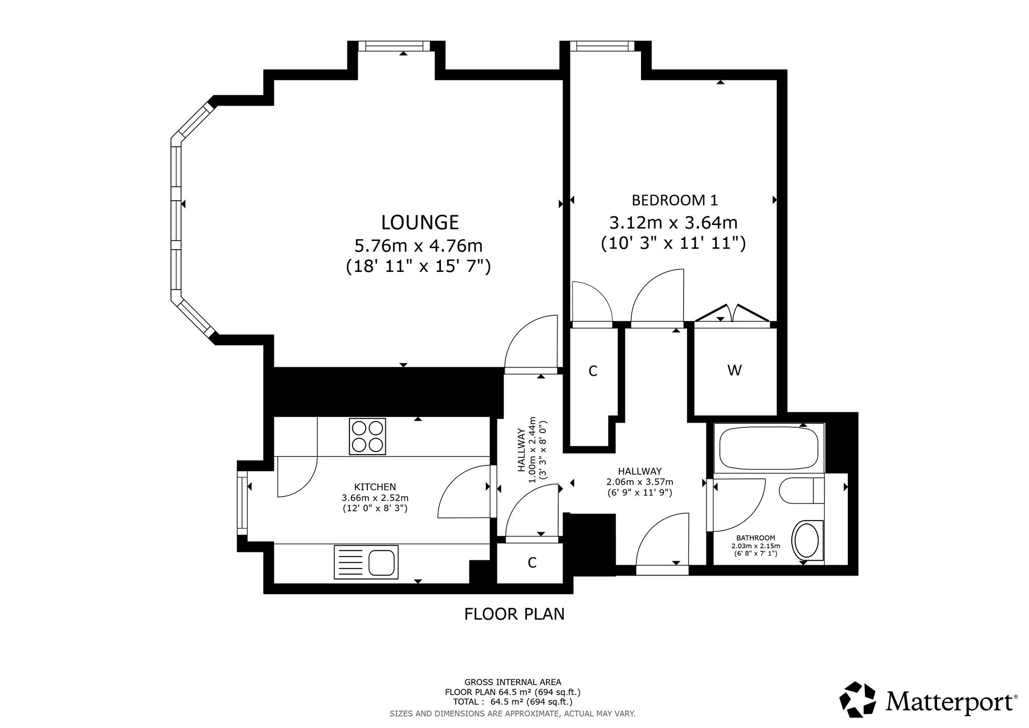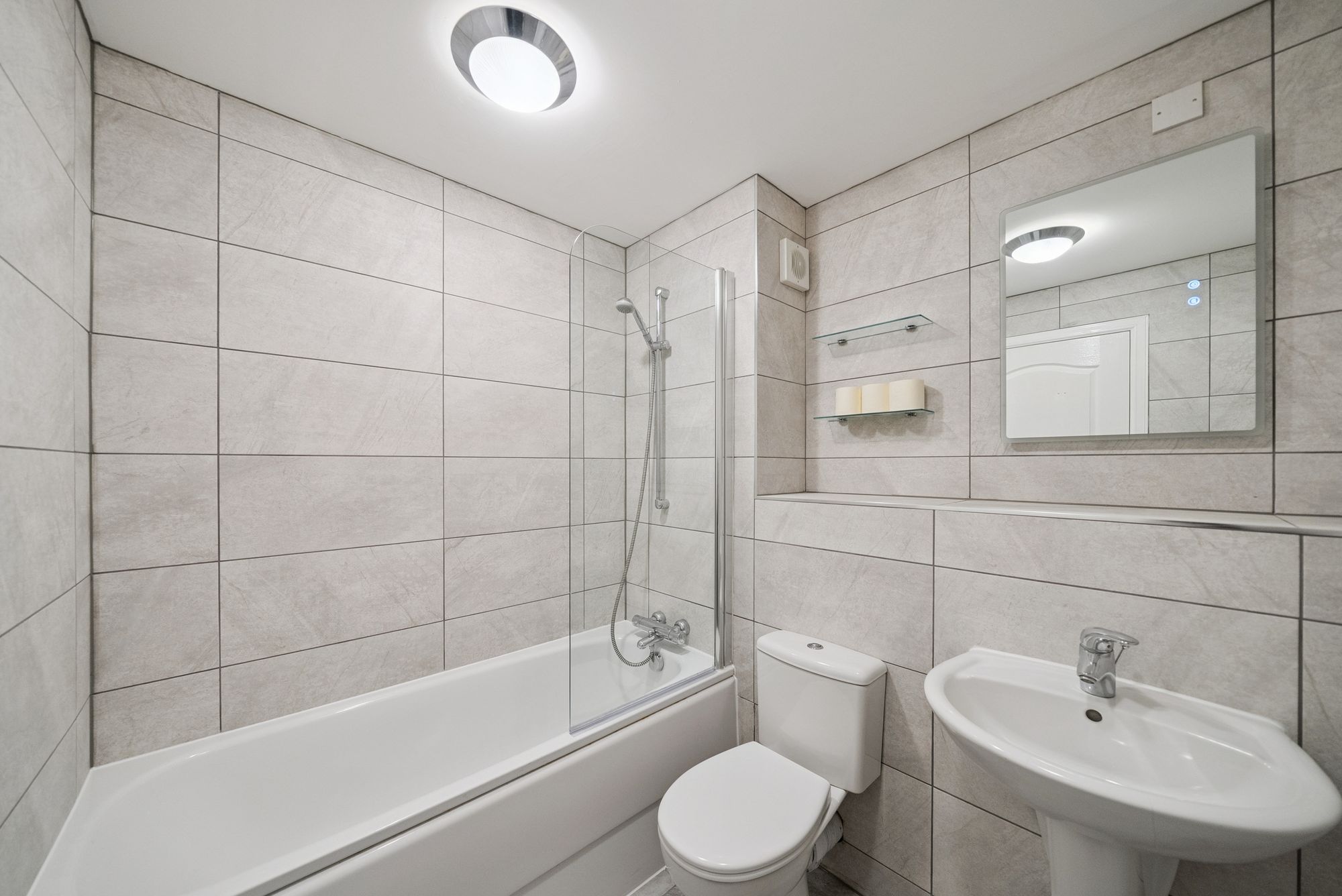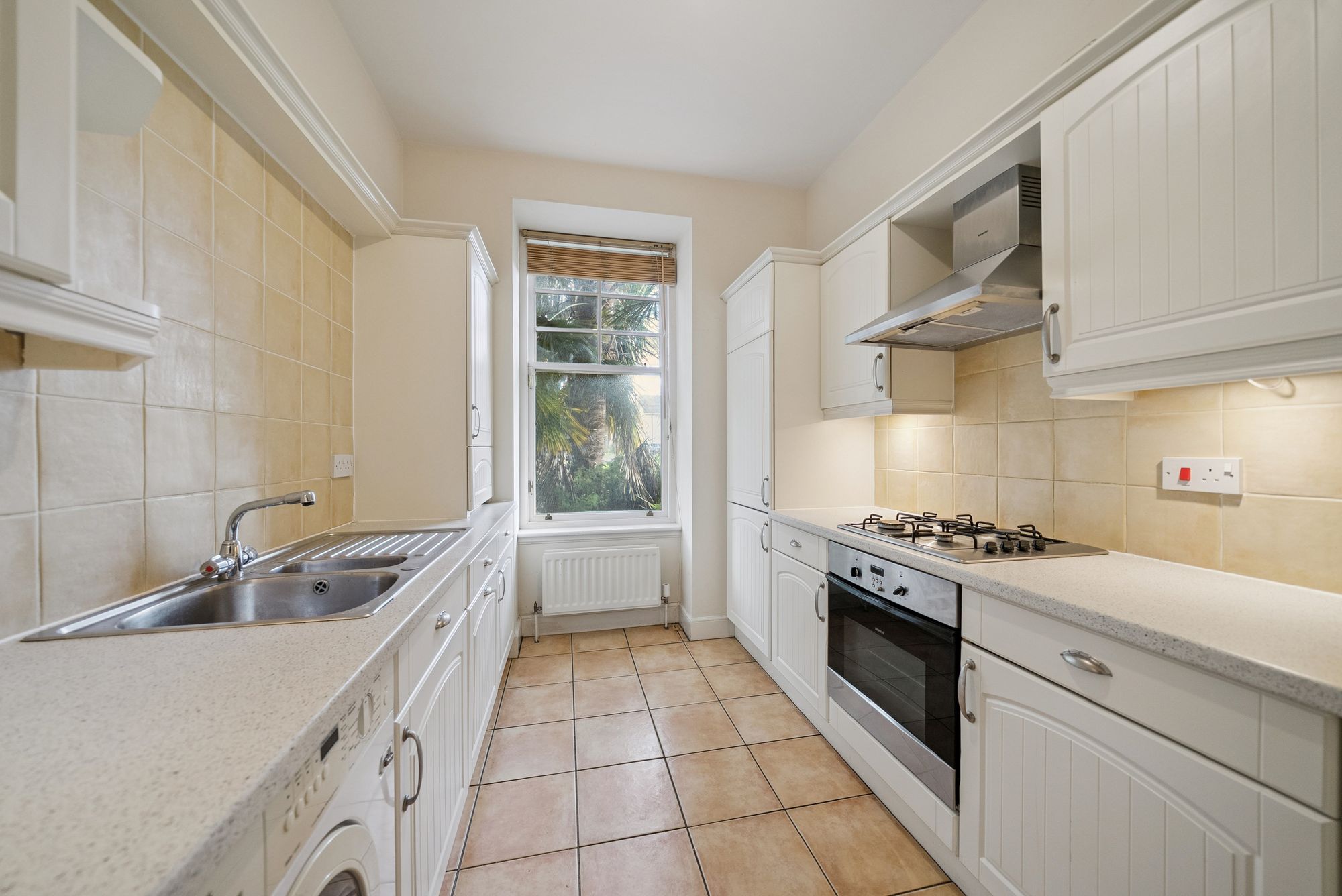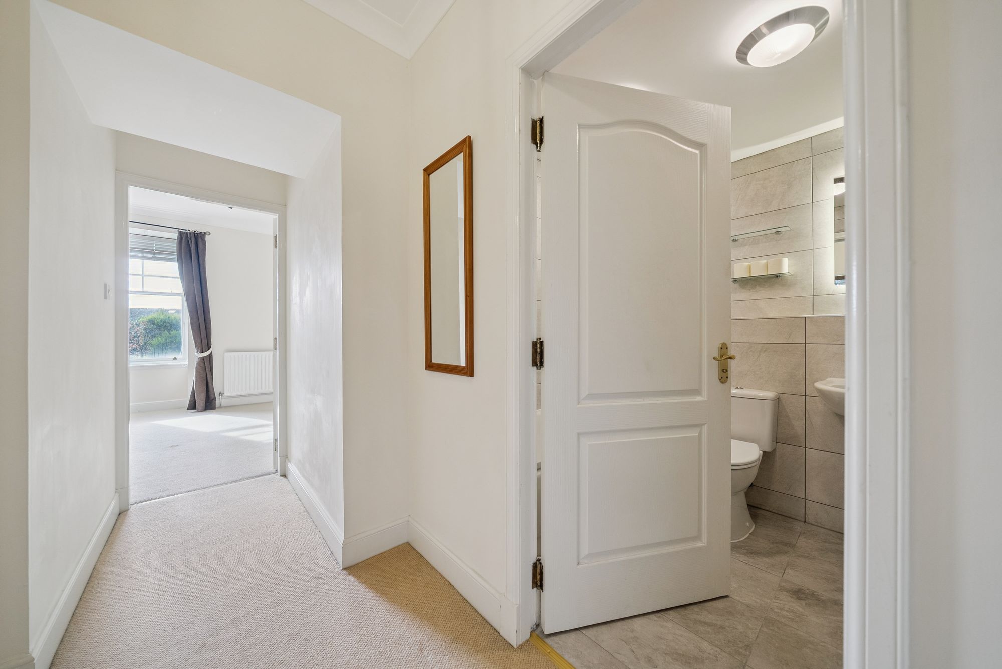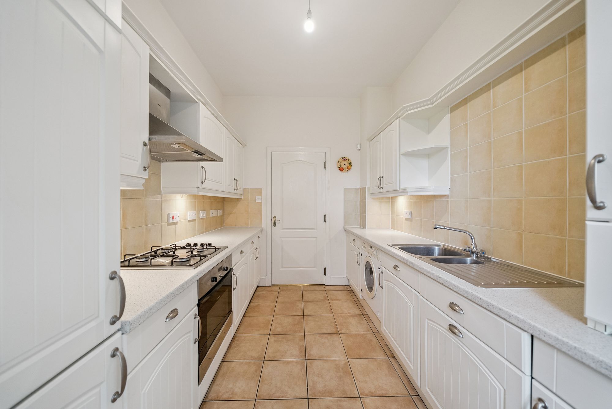 The kitchen is thoughtfully designed and fitted with a wide range of floor and wall-mounted units that offer excellent storage and workspace. A front-facing window provides natural light while integrated appliances include an oven, hob with hood, dishwasher, washing machine, fridge and freezer. There is a tiled floor, under-unit lighting and ample worktop space further enhance the practicality and finish of this well-equipped kitchen. The generously double bedroom easily accommodates a double bed and benefits from two built-in wardrobes, providing excellent storage space. The recently refitted bathroom is fully tiled and well finished with a modern three-piece white suite comprising a WC, wash hand basin and a panelled bath with mains shower above, delivering a stylish and functional bathing space.