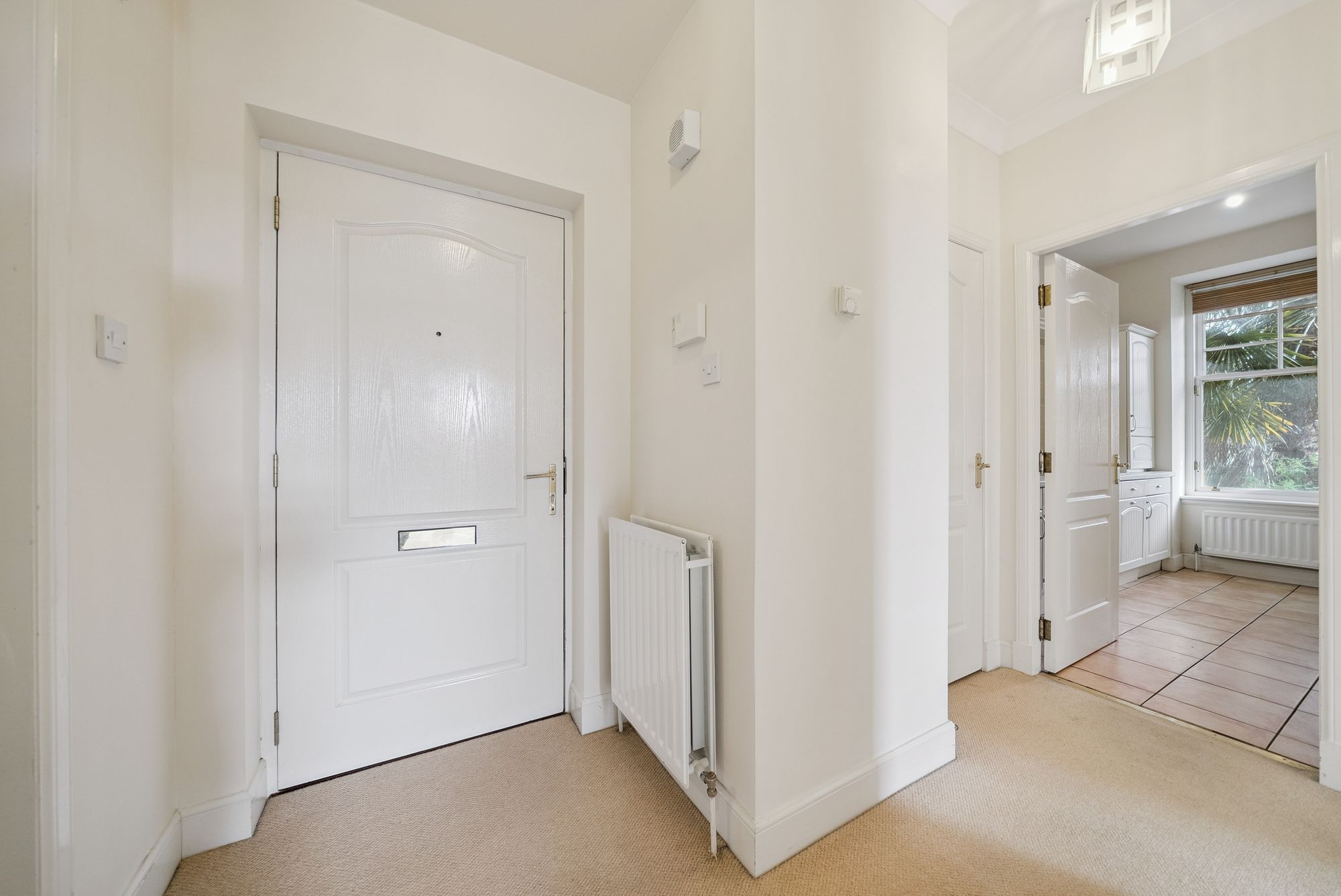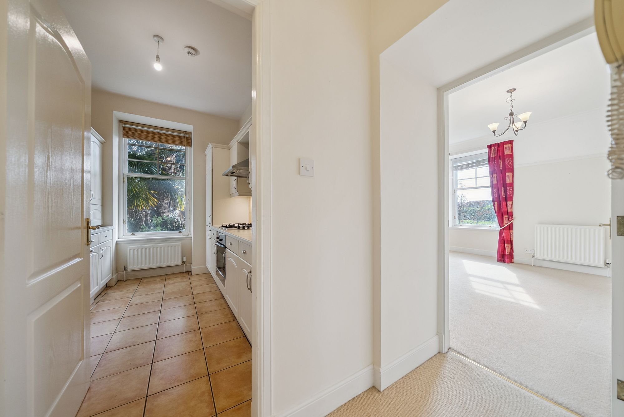 Positioned on the ground floor, this rarely available style of apartment provides bright, well-presented accommodation throughout. Upon entering, a welcoming hallway leads into a particularly spacious lounge with a charming bay window to the front. There is an additional side window with blinds covering which, when open, allow excellent natural light to pour into the room. From here, there are attractive outlooks through neighbouring properties towards the water, creating a light and airy living environment. The lounge comfortably accommodates both a three-piece suite and a dining table with chairs, making it a versatile space for relaxing and entertaining alike.
