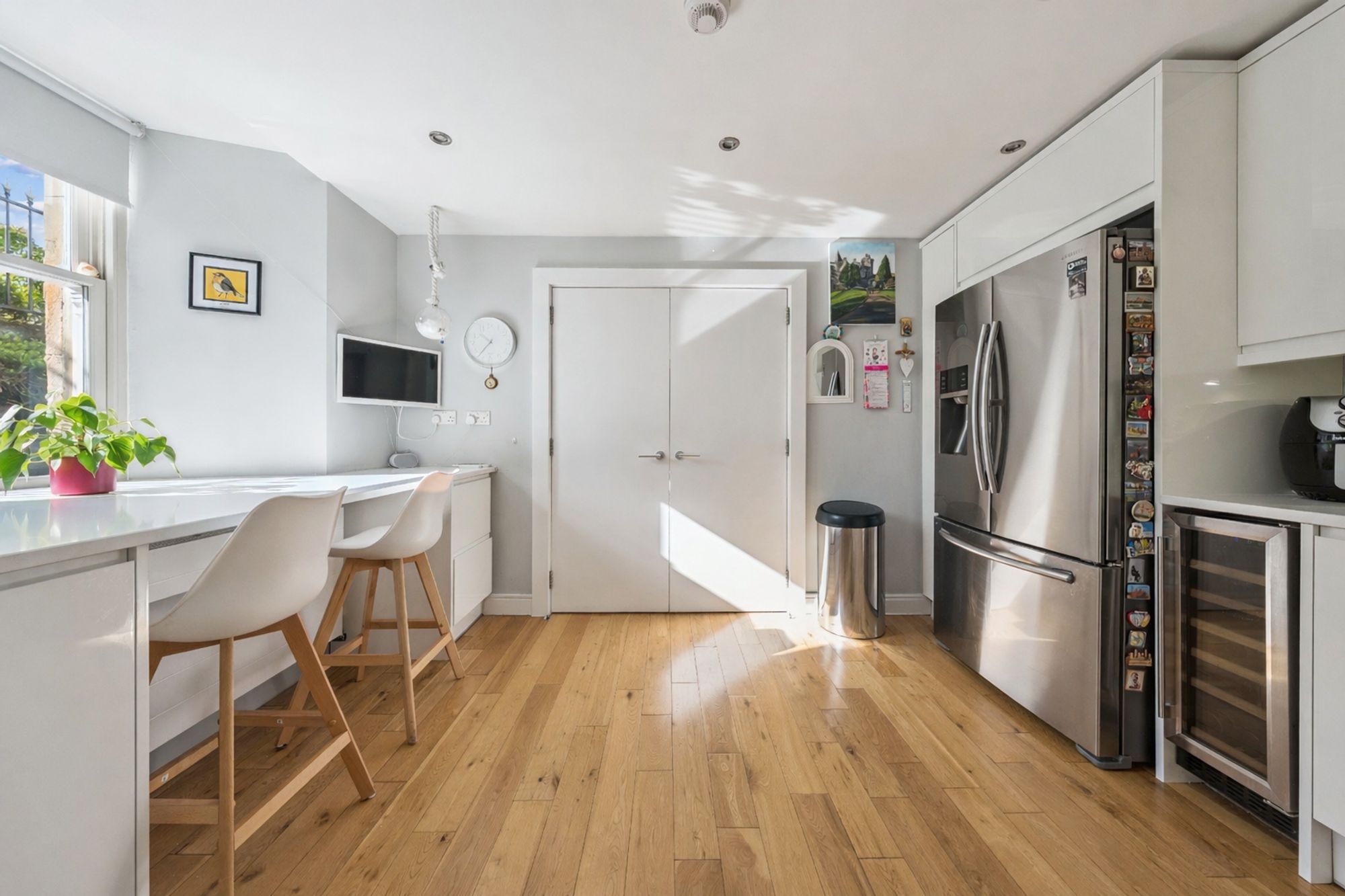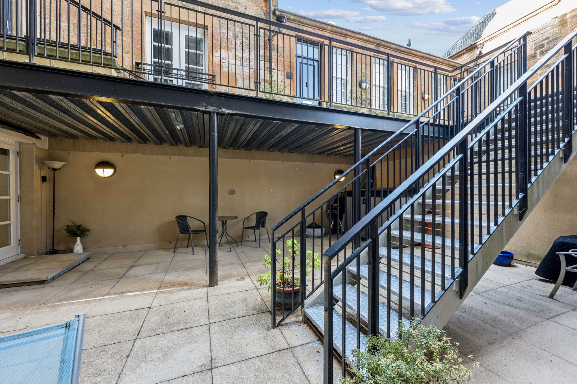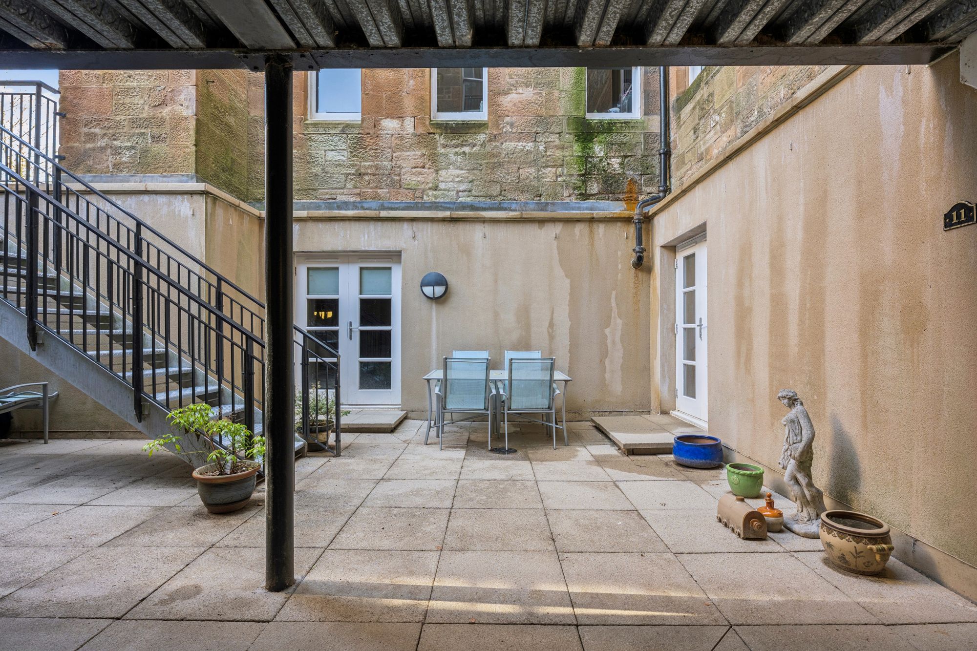 This unique home offers versatile and well-proportioned accommodation on the level, with direct access to a courtyard. The property is accessed through the building's grand main entrance hall and via a staircase shared only with Number 10. Double doors open to the entrance vestibule, which provides access to the impressive dining hall measuring approx. 20 ft in length. The heart of the home is most certainly the spacious, bay-windowed lounge with modern focal point media wall. The dining-sized kitchen is equipped with a range of high-gloss units and complete with quartz worktops and breakfast bar, along with a range of appliances to include: induction hob, self-cleaning fan oven, combination microwave oven, dishwasher, American-style fridge/freezer with water and ice dispenser, and glass-fronted wine fridge. The property also offers two double-sized bedrooms, one of which benefits from an en-suite shower room with good storage off, built-in wardrobes, and French doors to the courtyard. The second bedroom benefits from a beautiful southerly-facing bay window and significant wardrobe space. A family bathroom with three-piece suite and shower over the bath completes the accommodation. A further set of French doors from the dining hall provides direct access to a courtyard, which offers the perfect sheltered spot for alfresco dining. The courtyard is a communal space, used mainly by numbers 11 and 7, and provides access, via a lightwell with steel staircase, to the road at the rear of the building.