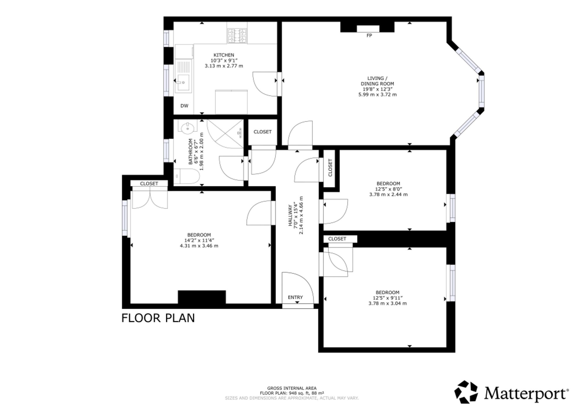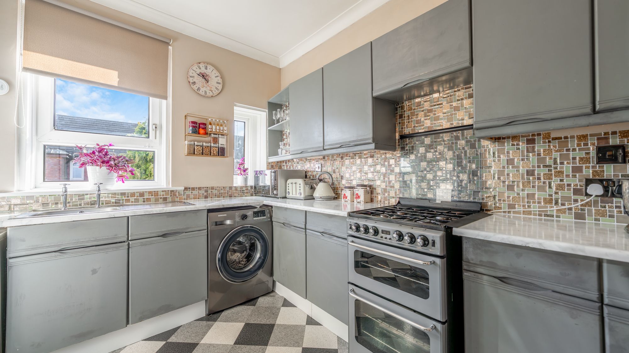 Accommodation comprises: welcoming entrance hallway with convenient storage, spacious bay-windowed lounge, a well-appointed adjoining kitchen with both wall and base units, three large double bedrooms, and a stylish family bathroom with a contemporary shower enclosure.