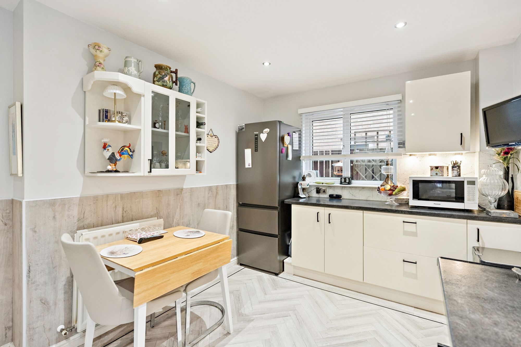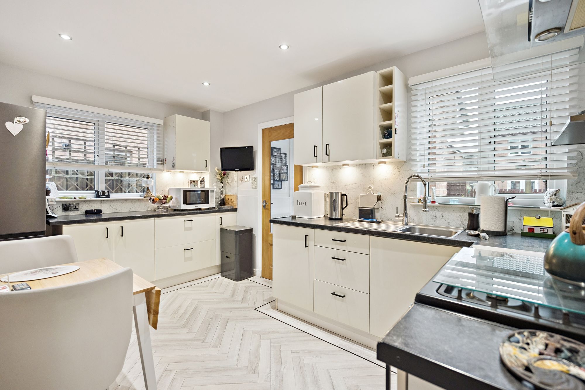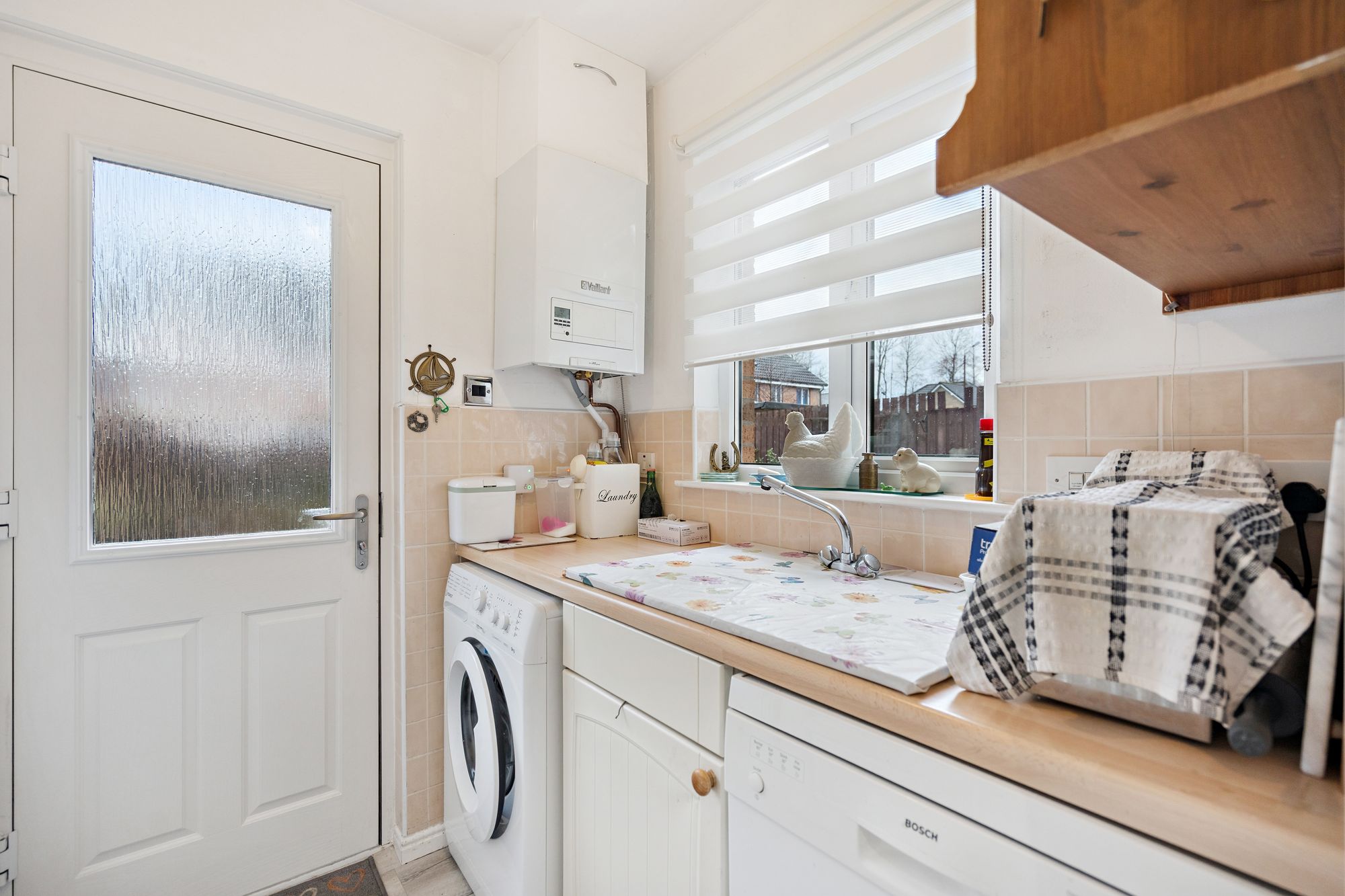 The ground floor welcomes you into an entrance hall that leads through to a generous lounge, providing an inviting space for everyday living and entertaining. A separate dining room offers flexibility for family meals or more formal occasions, while the kitchen is well proportioned and supported by a useful utility room. A convenient ground floor toilet completes the lower level.