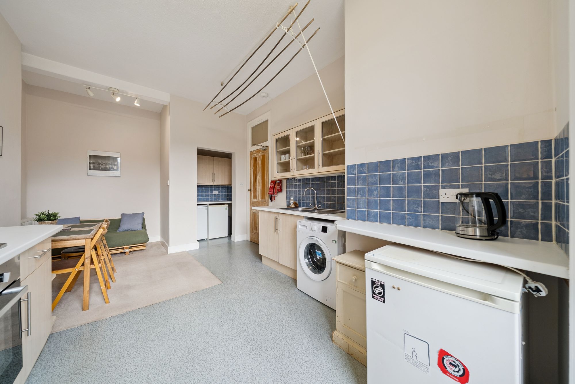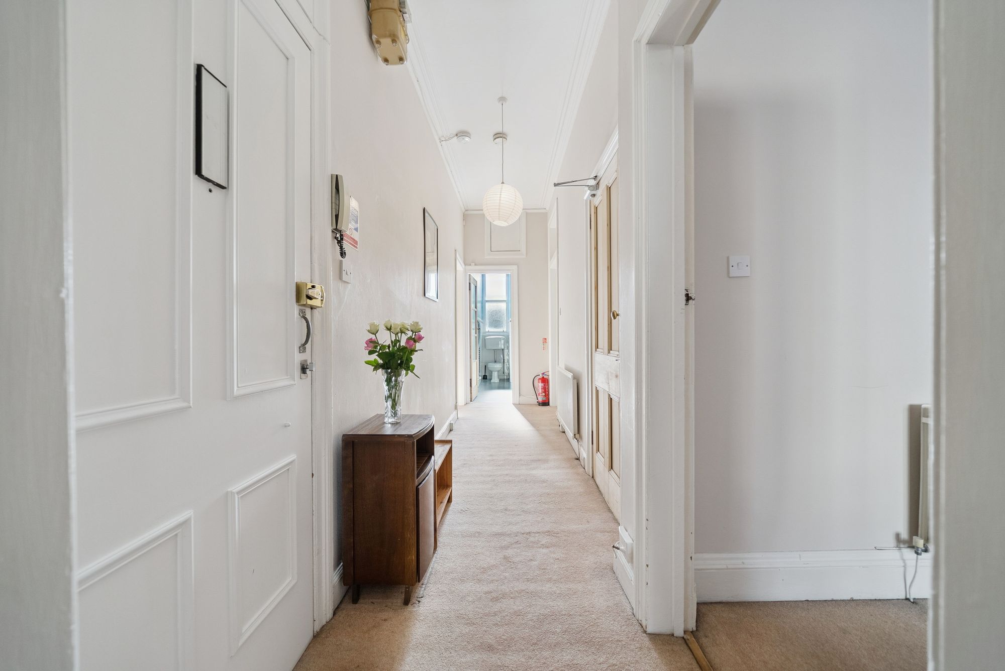 Accessed via a secure entry phone system, the accommodation opens into a welcoming and spacious hallway. The bright and well-proportioned living room is enhanced by high ceilings, intricate cornicing, and a fireplace, with ample space to accommodate a home working area. The kitchen is equally well-appointed, offering generous room for dining as well as access to a useful utility space.