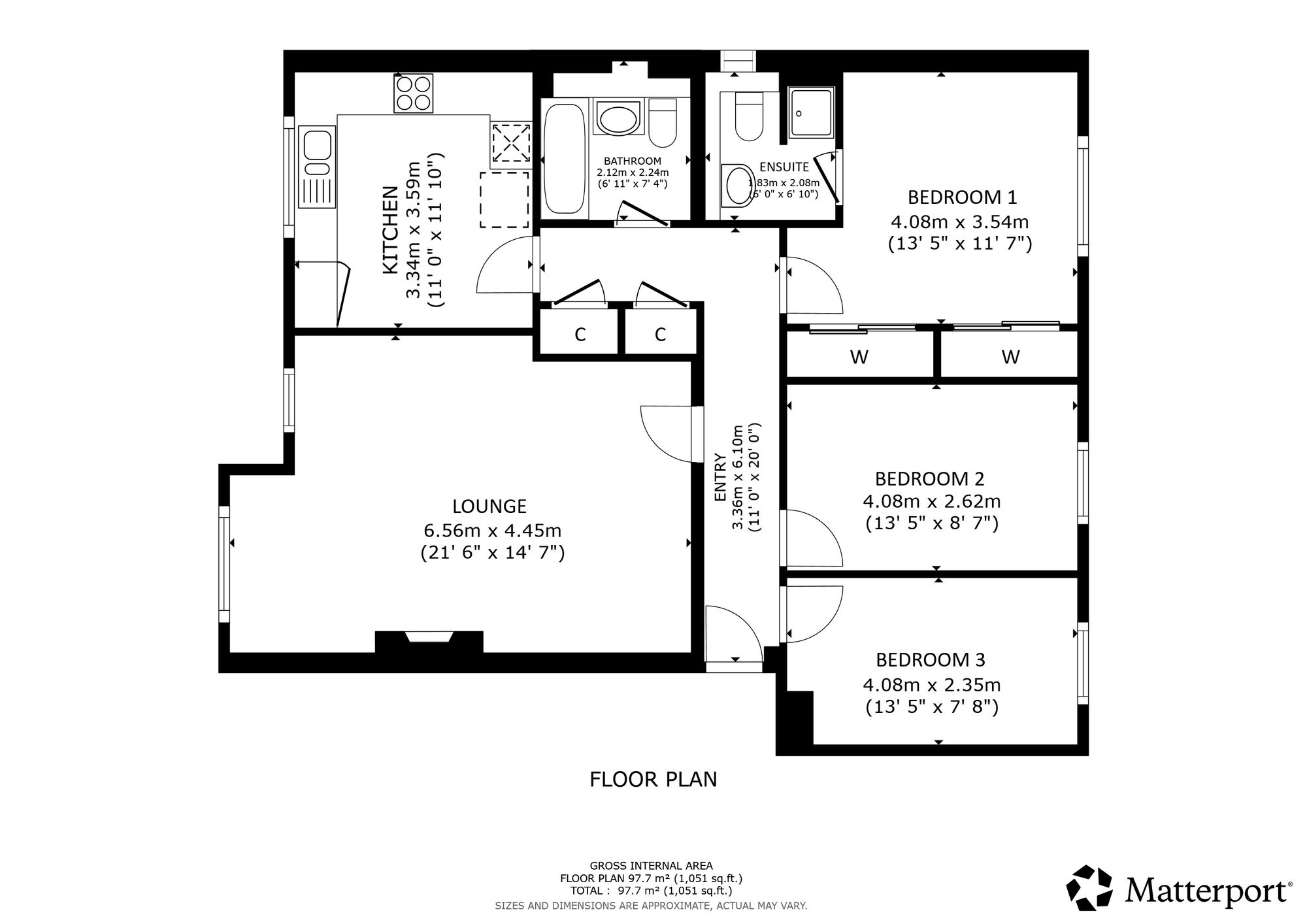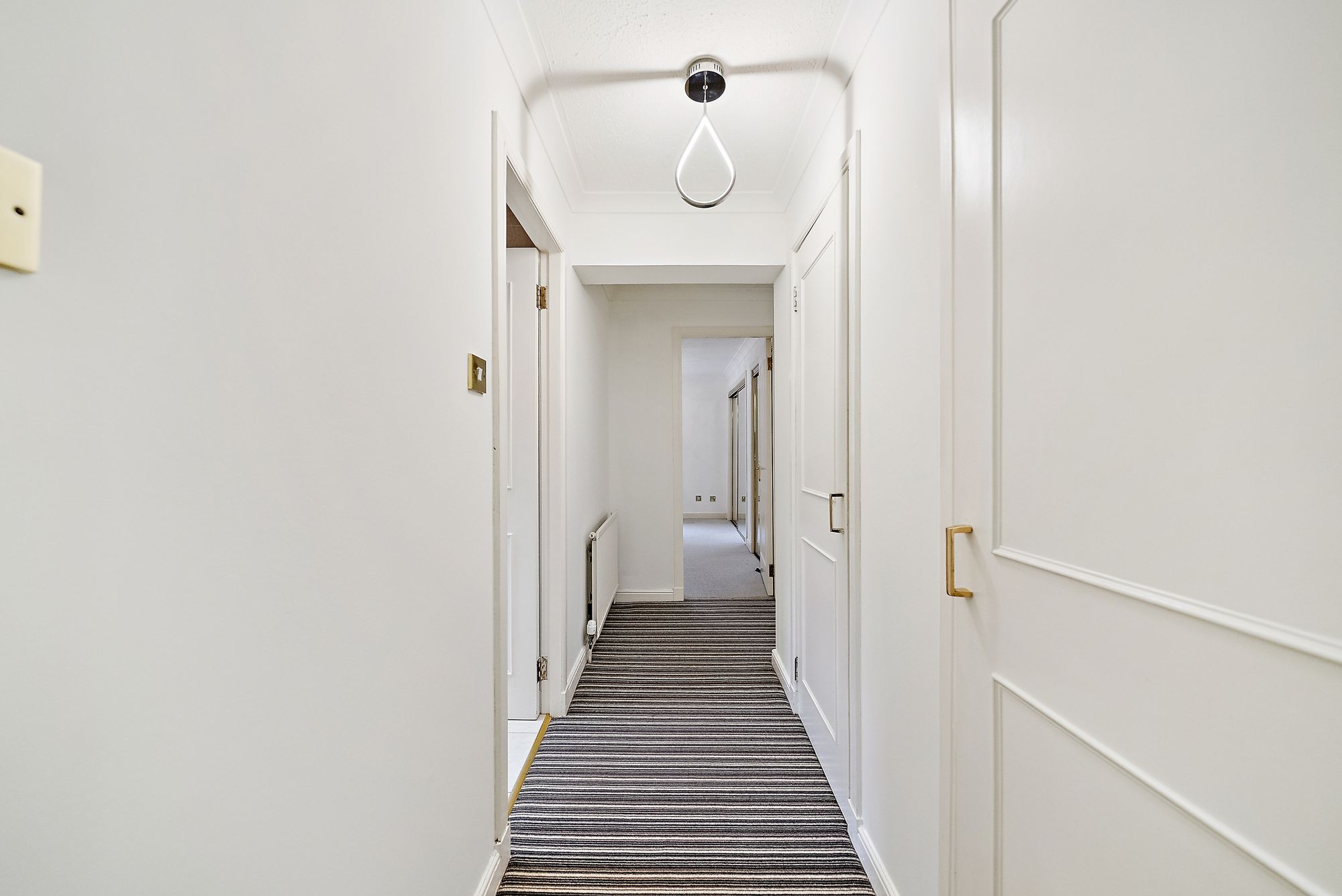 A shared entrance opens into a bright communal hallway, leading to this generously sized and well-planned flat. The accommodation includes a large, welcoming lounge featuring a decorative electric fireplace as its focal point, complemented by a sizeable window that floods the room with natural light. The spacious, modern refitted kitchen offers contemporary wall and base units, an integrated hob and oven, and another large window enhancing the light and airy feel. Across the hall, the master bedroom benefits from double built-in wardrobes, ideal for storage, and a roomy ensuite shower room. The ensuite is half-tiled and includes a walk-in shower enclosure, wc and vanity wash hand basin. Two further bedrooms provide excellent flexibility, whether for family, guests, or home-working. Completing the accommodation is the refitted main bathroom, featuring a luxury jacuzzi bath, wc and wash hand basin. The property is fully double glazed and enjoys gas fired central heating throughout.