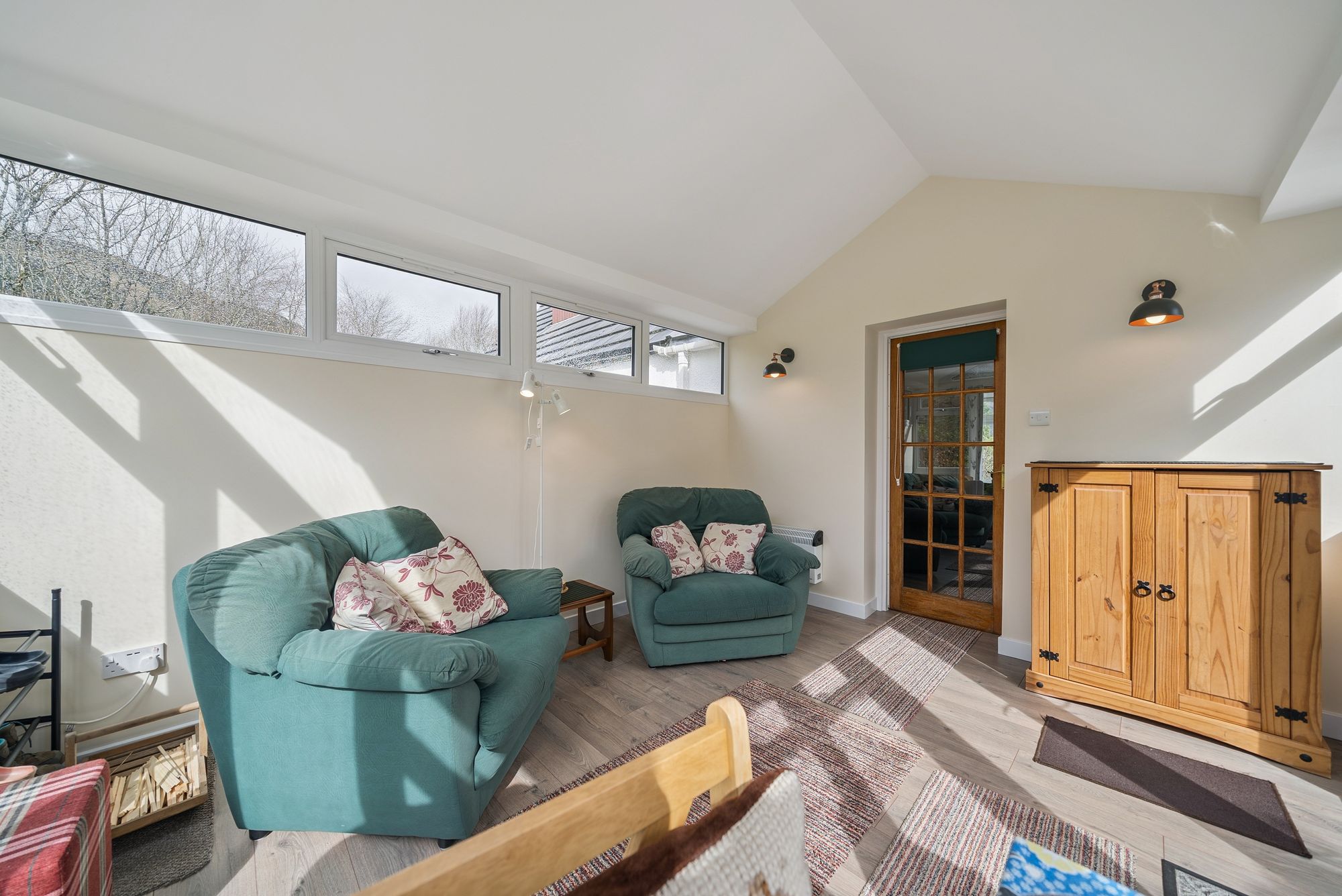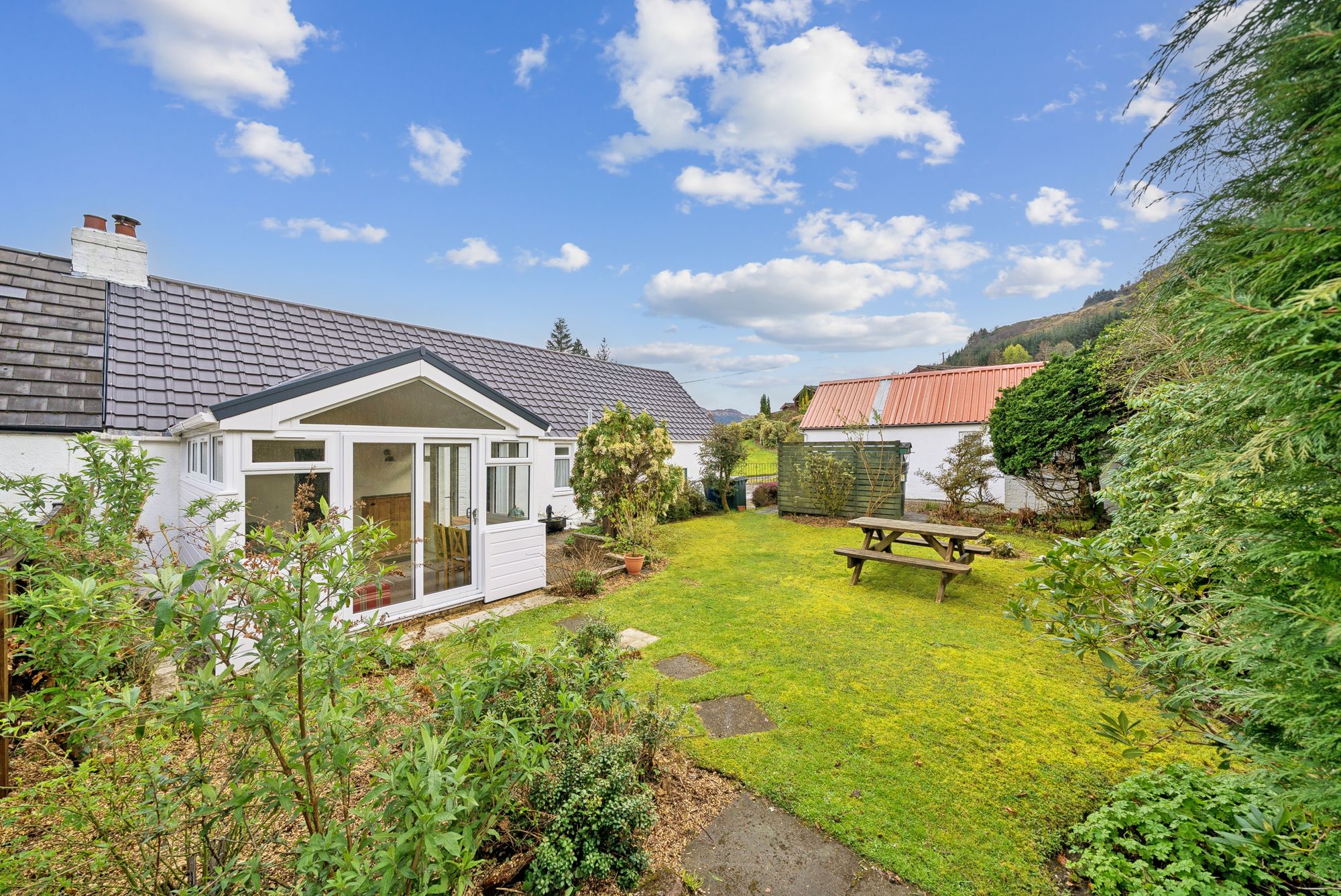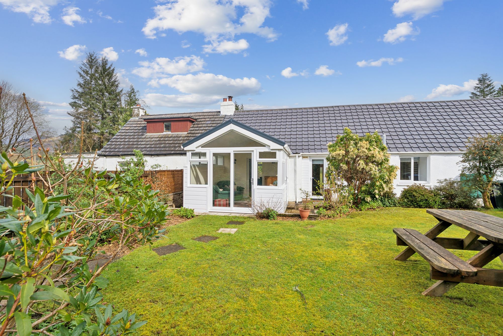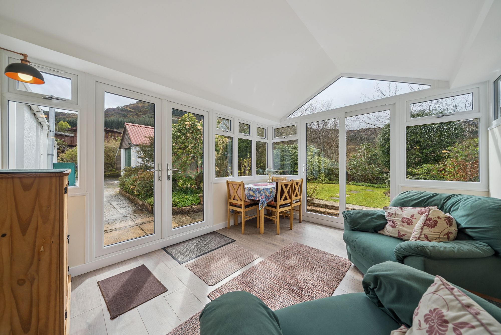 Upon entering, a welcoming entrance porch provides two convenient storage cupboards and features attractive timber flooring. This leads into a central hallway, also with storage, which offers access to all principal apartments. The lounge is a warm and inviting space, enjoying a front-facing double-glazed window that fills the room with natural light and offers stunning views out towards the Loch and hills surrounding. A charming fire surround with solid fuel fire creates a cosy focal point, complemented by tasteful décor and wooden flooring. The country-style kitchen is both practical and stylish, fitted with a generous range of floor and wall-mounted units. Included appliances consist of a hob, oven, extractor hood and space for dishwasher, washing machine, fridge, and freezer - possibly available by negotiation - ensuring excellent functionality for everyday living. There are two well-proportioned double bedrooms, with mirror fronted wardrobes in the master bedroom and further storage in the second. The family bathroom is attractively finished with a three-piece coloured suite comprising a low-level WC, wash hand basin, and panelled bath with a powerful shower overhead. A standout feature of the home is the recently completed sun room / summer room, meticulously designed with a pitched roof and extensive glazed units all round. This space enjoys peaceful, panoramic views to all angles over the rear garden and towards the surrounding countryside. Direct access from here leads out into the rear garden, seamlessly connecting indoor and outdoor living.