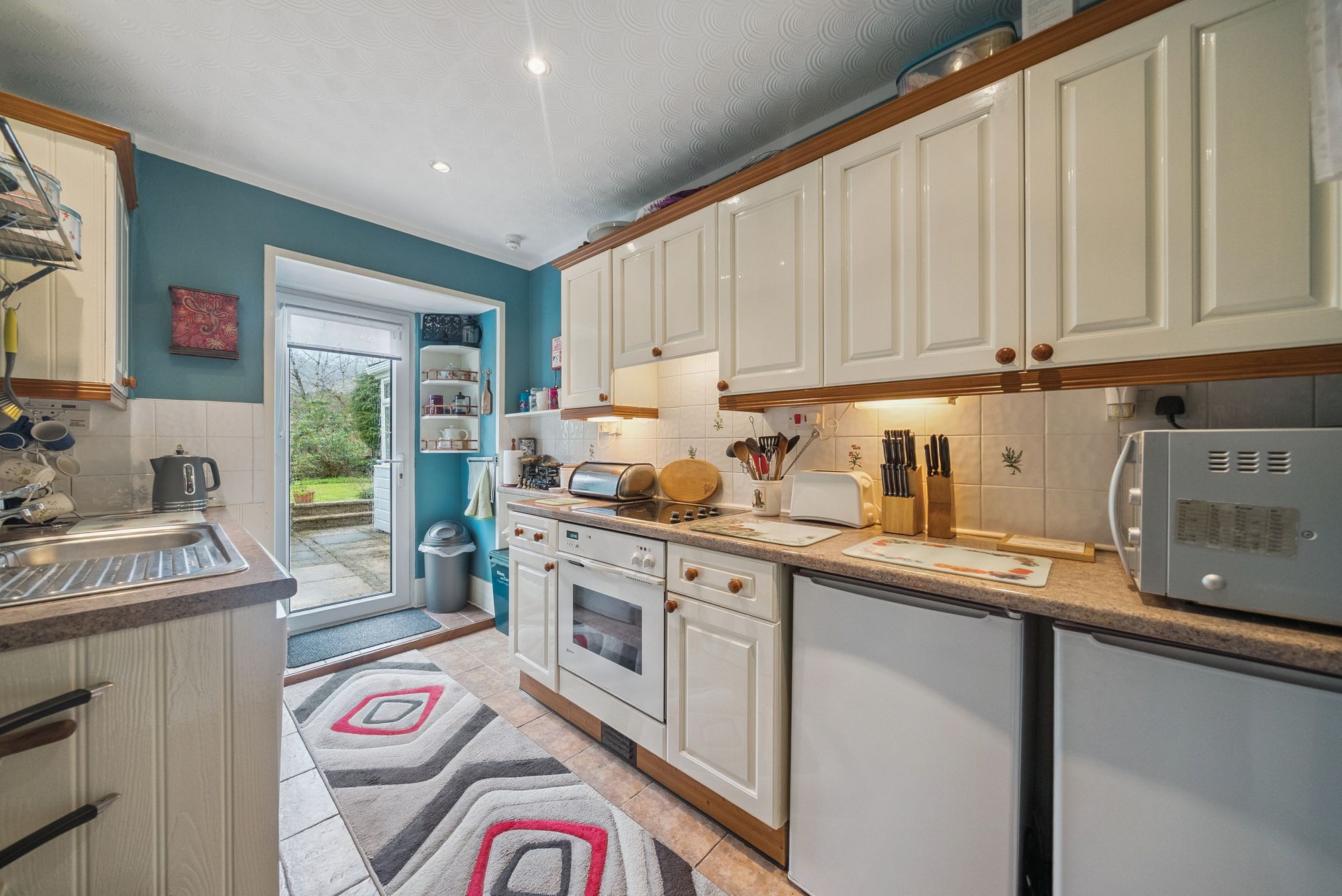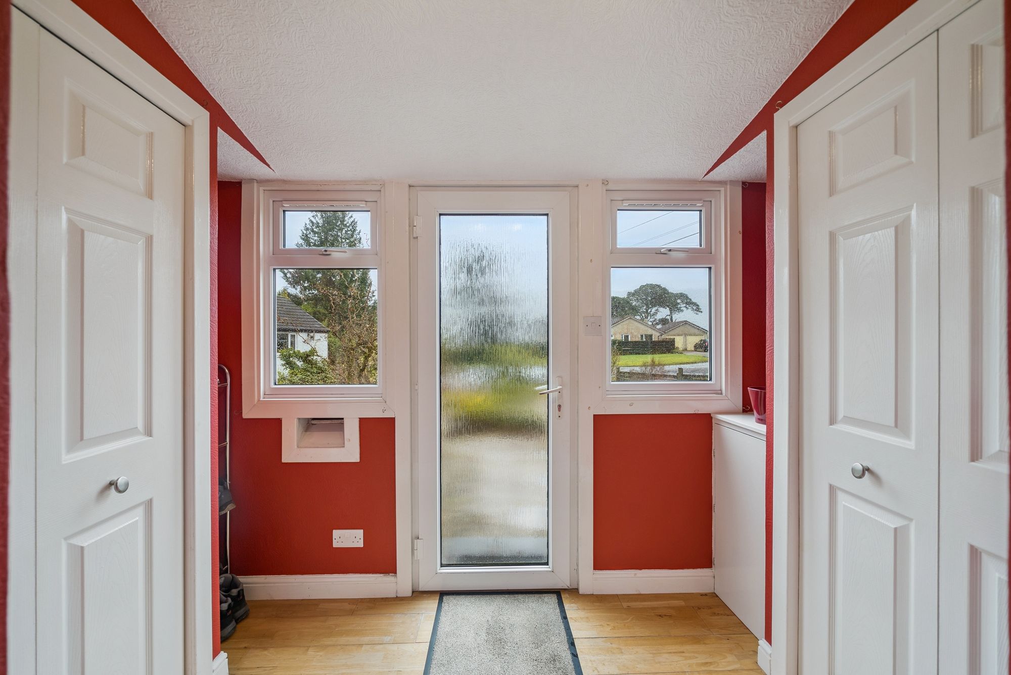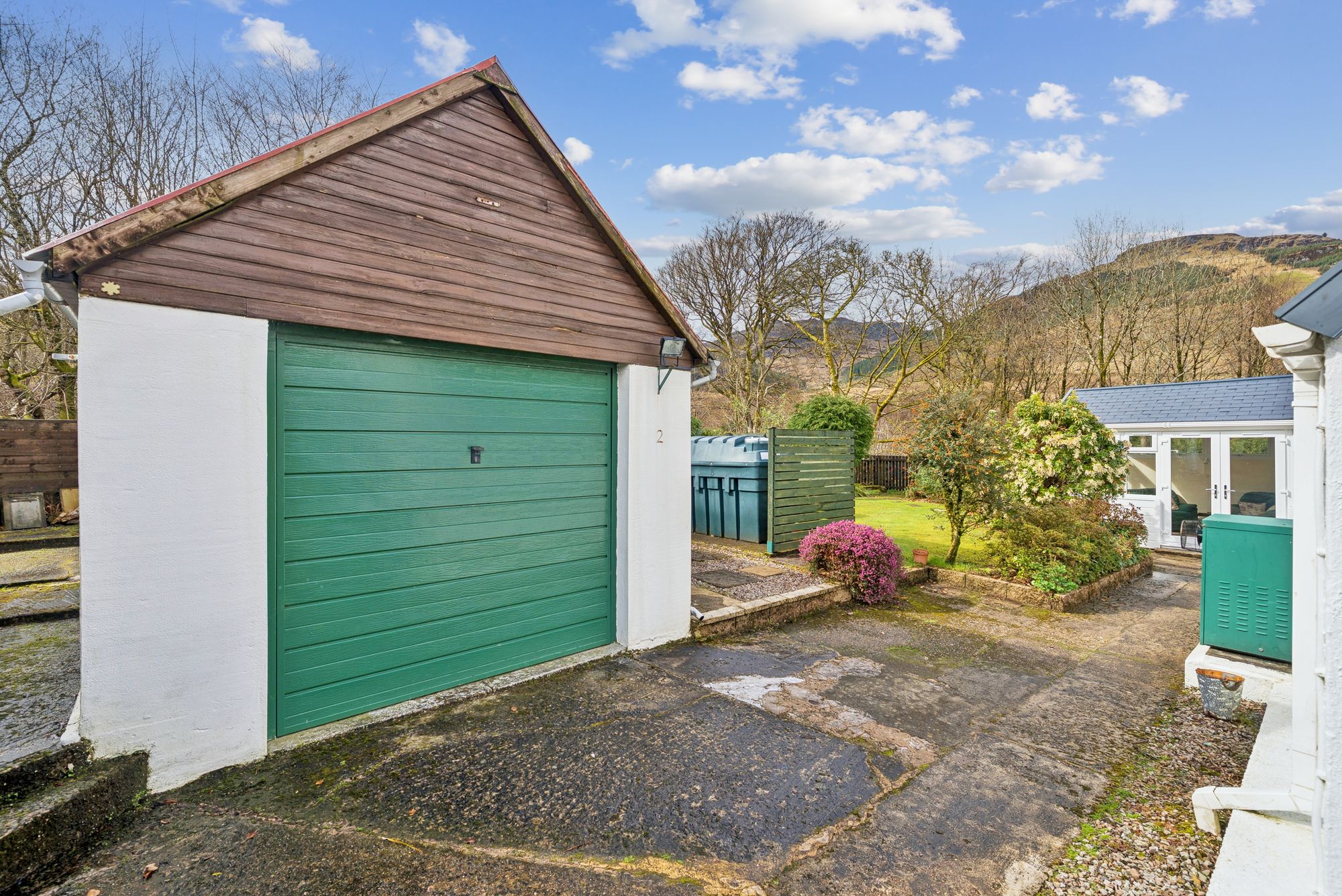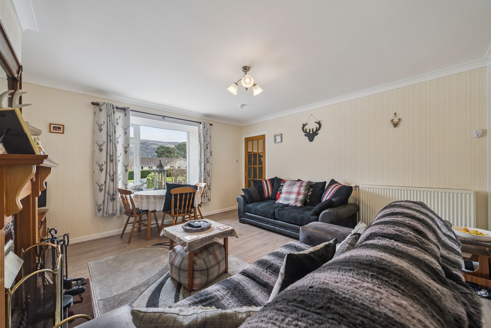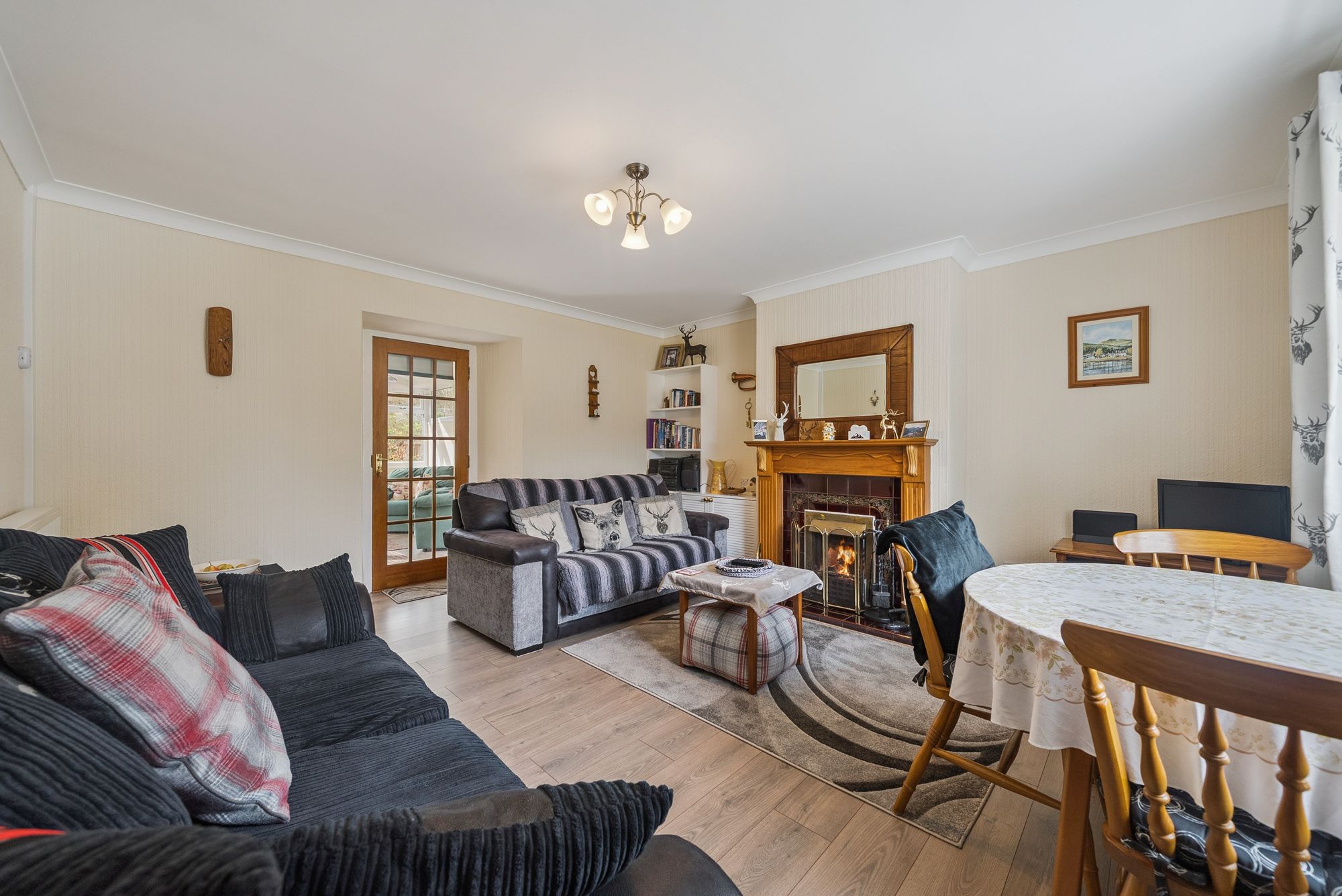 Upon entering, a welcoming entrance porch provides two convenient storage cupboards and features attractive timber flooring. This leads into a central hallway, also with storage, which offers access to all principal apartments. The lounge is a warm and inviting space, enjoying a front-facing double-glazed window that fills the room with natural light and offers stunning views out towards the Loch and hills surrounding. A charming fire surround with solid fuel fire creates a cosy focal point, complemented by tasteful décor and wooden flooring. The country-style kitchen is both practical and stylish, fitted with a generous range of floor and wall-mounted units. Included appliances consist of a hob, oven, extractor hood and space for dishwasher, washing machine, fridge, and freezer - possibly available by negotiation - ensuring excellent functionality for everyday living. There are two well-proportioned double bedrooms, with mirror fronted wardrobes in the master bedroom and further storage in the second. The family bathroom is attractively finished with a three-piece coloured suite comprising a low-level WC, wash hand basin, and panelled bath with a powerful shower overhead. A standout feature of the home is the recently completed sun room / summer room, meticulously designed with a pitched roof and extensive glazed units all round. This space enjoys peaceful, panoramic views to all angles over the rear garden and towards the surrounding countryside. Direct access from here leads out into the rear garden, seamlessly connecting indoor and outdoor living.