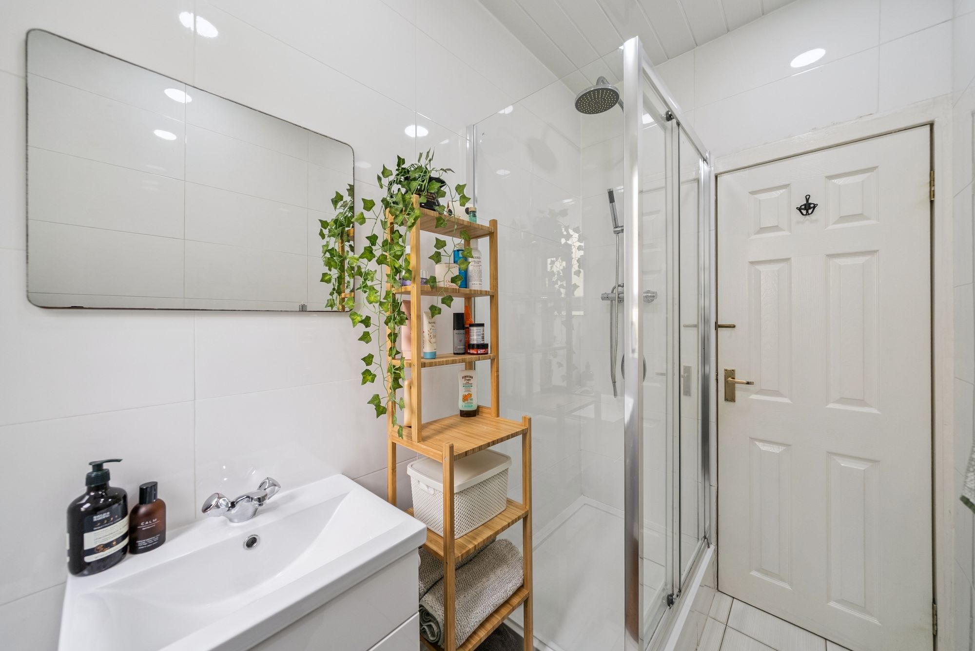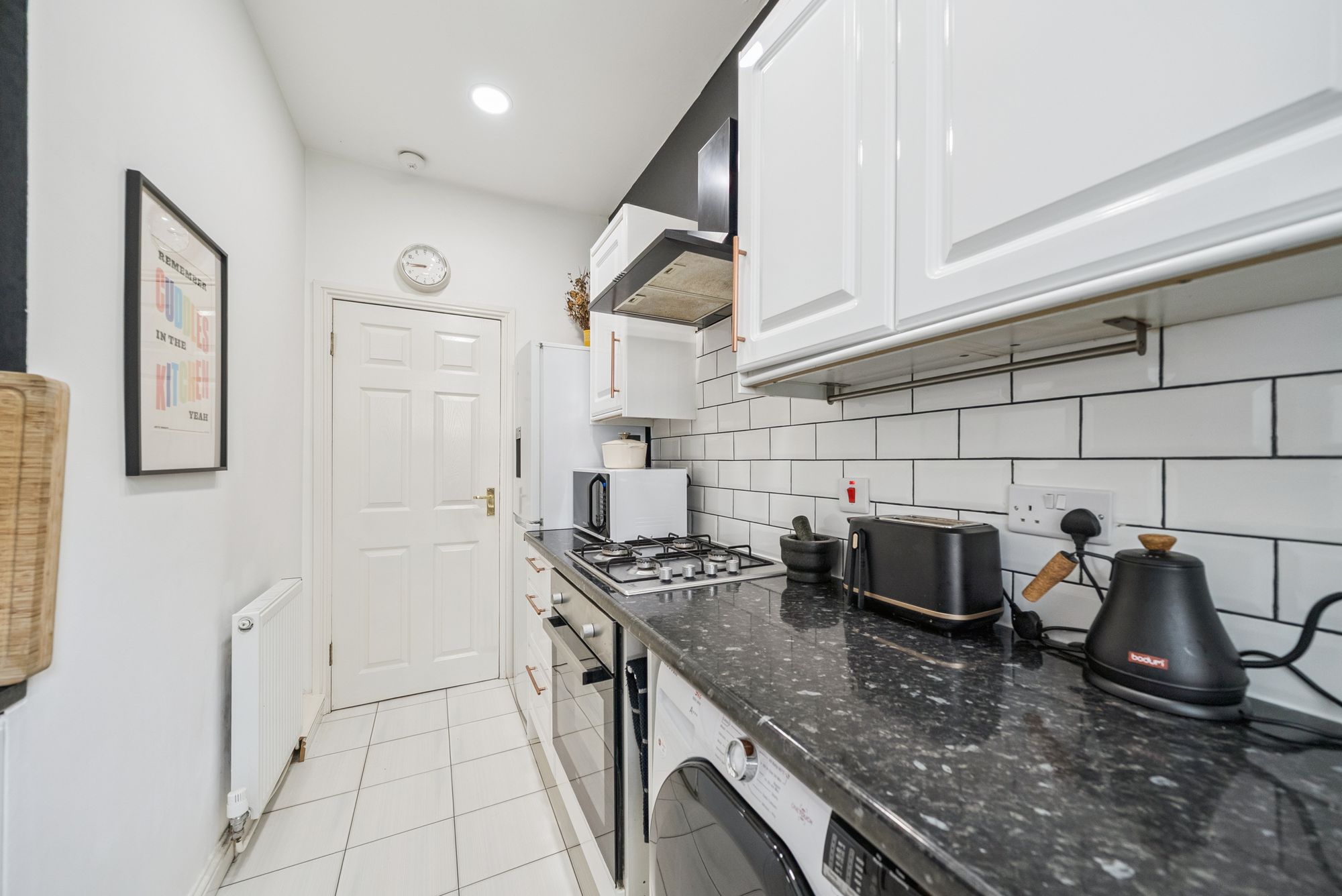 The property offers two generous double bedrooms; both flooded with natural light. The stylish galley-style kitchen features modern wall and floor-mounted units, integrated appliances, and ample worktop space. A modern family bathroom completes the accommodation, showcasing a sleek three-piece suite with a walk-in shower cubicle.