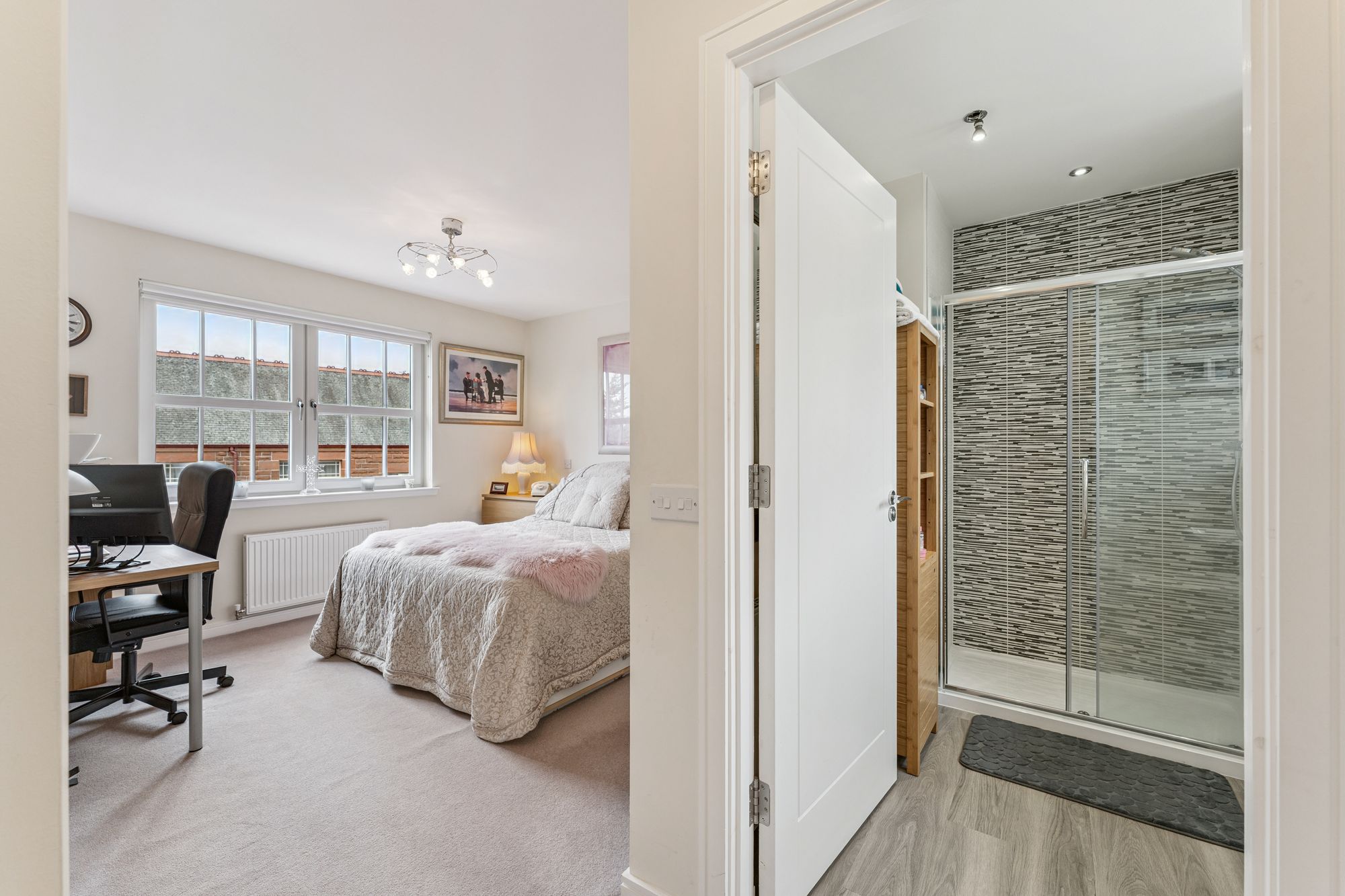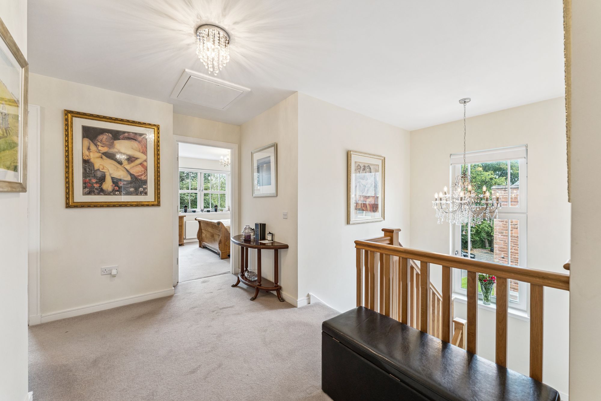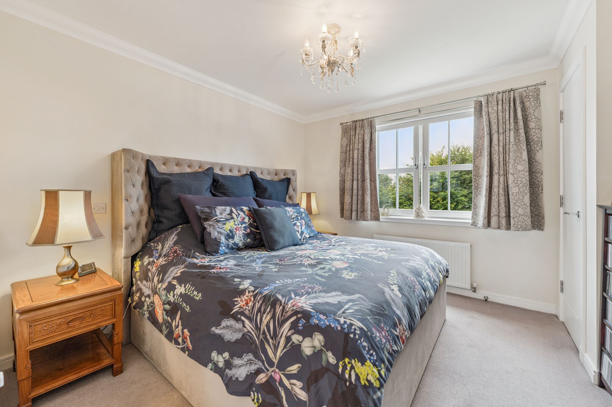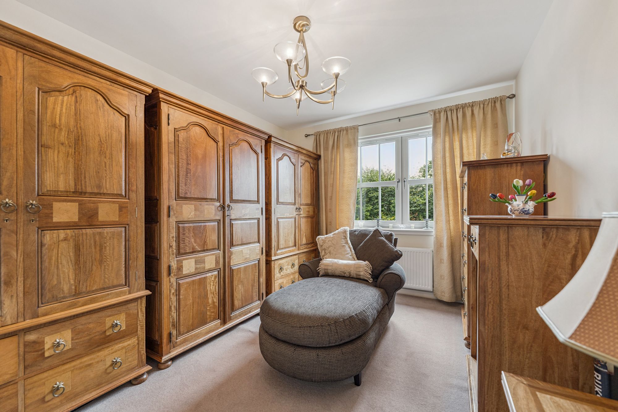 Upstairs, the property offers five well-proportioned bedrooms, four of which benefit from fitted wardrobes. The principal bedroom is particularly impressive, featuring a stylish dressing area and a private en-suite bathroom. Two further bedrooms also enjoy en-suite shower rooms, while the remaining bedrooms are served by a modern family bathroom.