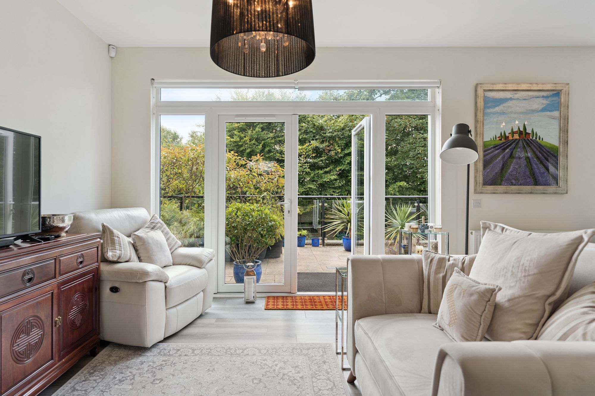 Finished to a high specification throughout, the interior is designed with modern family life in mind. A spacious and welcoming reception hallway, complete with two storage cupboards, leads to a formal lounge featuring dual aspect windows that flood the space with natural light. The heart of the home is the impressive L-shaped open-plan kitchen, dining and living area, ideal for everyday living and entertaining alike. The contemporary kitchen is fitted with white cabinetry, complemented by a stone worksurface, and includes a full range of integrated appliances such as an oven, hob, microwave, American-style fridge-freezer, and dishwasher. Off the kitchen, a good sized utility room provides additional storage and space for laundry appliances. The dining and living areas enjoy natural daylight, with patio doors opening directly to the stunning south-facing rear garden. A conveniently located WC completes the ground floor.