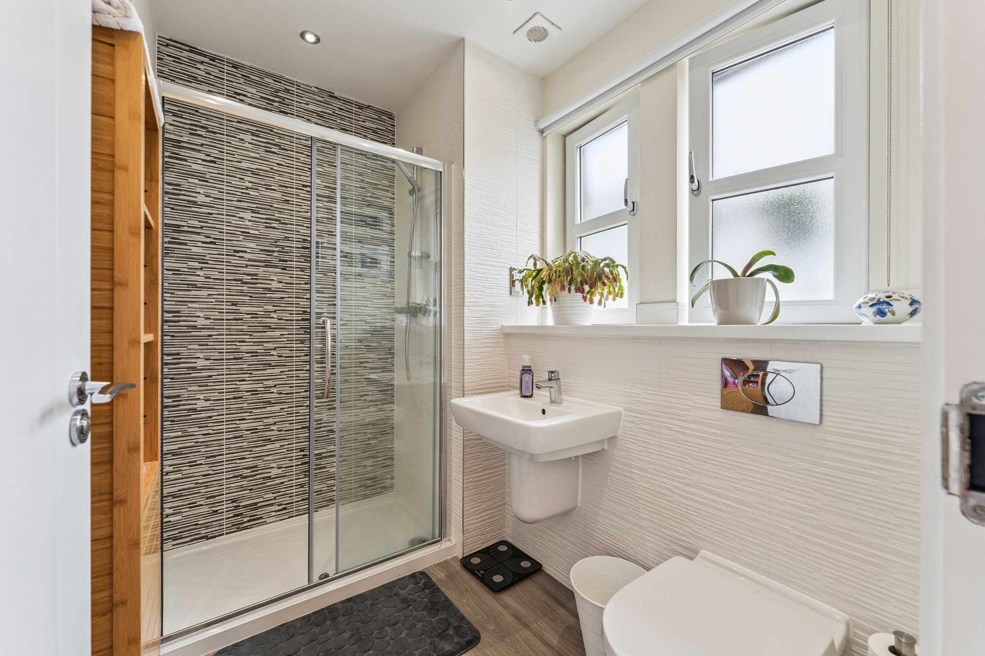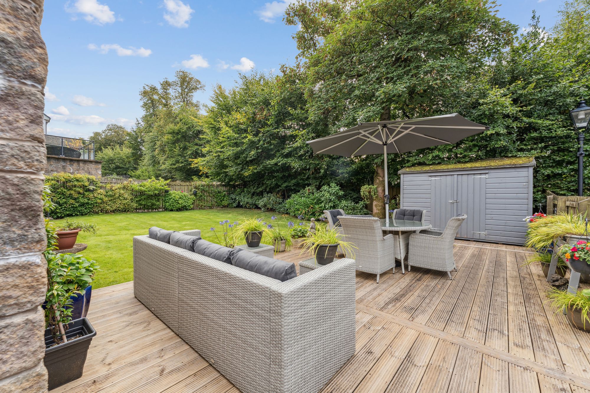 Externally, the property boasts beautifully landscaped gardens. To the front, a monoblocked driveway provides generous off-street parking and leads to an integral spacious garage. The enclosed rear garden is both private and immaculately maintained, featuring a patio area with steps down to a neat lawn and a spacious decking area. Perfect for outdoor relaxation and entertaining. A garden shed provides useful external storage.