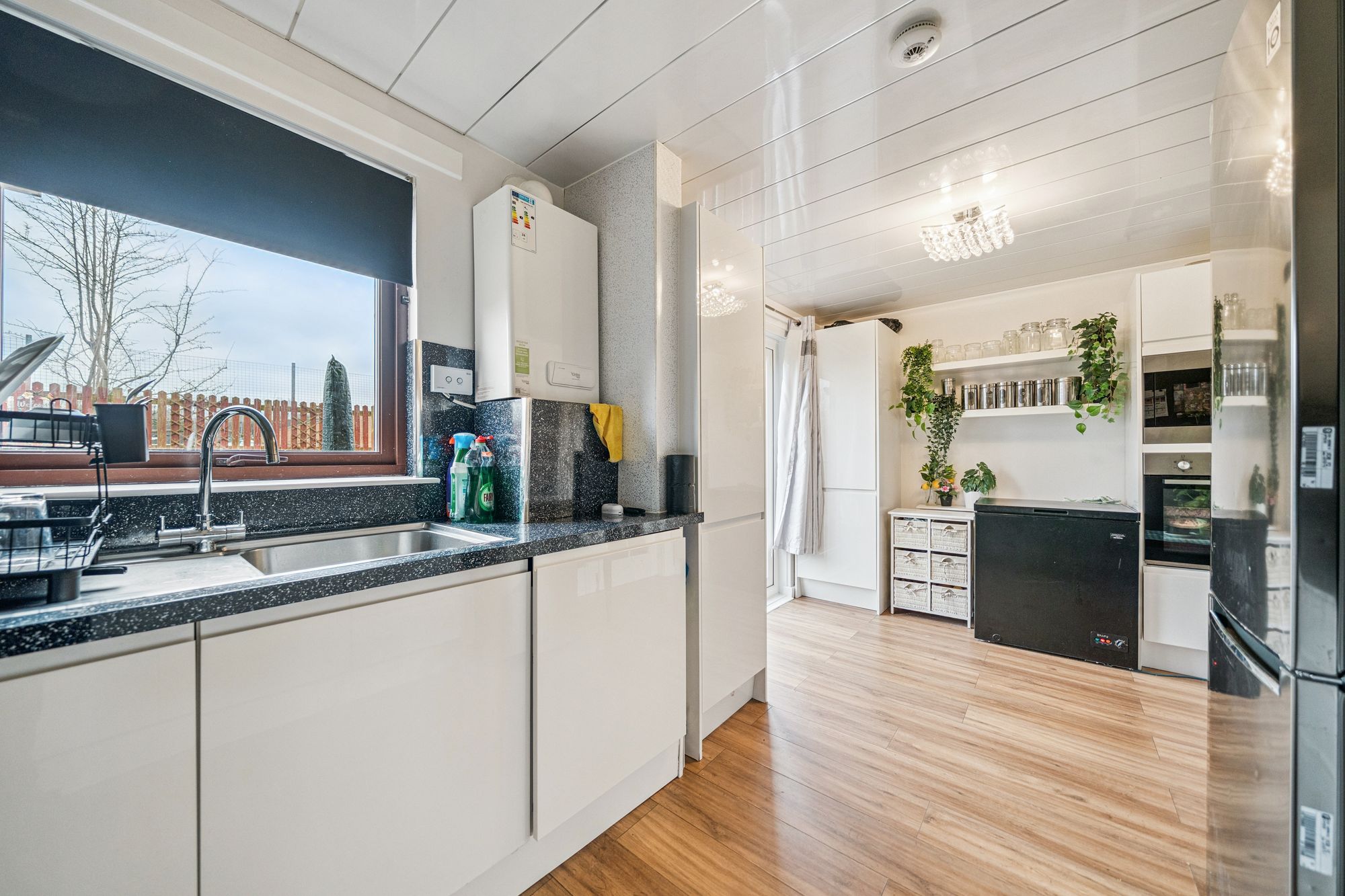 Immediately welcoming upon entry, a lengthy ground floor hallway affords access to a practical two-piece cloakroom as well as a notably bright and generously proportioned lounge which affords ample space for a dining table and features a large storage cupboard off. From here, ‘Georgian paned’ double doors lead in to an impressive re-fitted kitchen which hosts a comprehensive range of base and wall mounted units with modern integrated appliances and also provides ample space for family dining as well as attractive ‘French’ door access to the rear garden. On the notably bright upper floor of this home there are three extremely well-proportioned bedrooms, each of which have capacity to host a double bed, and a contemporary family shower room with white sanitary ware and ample vanity storage.