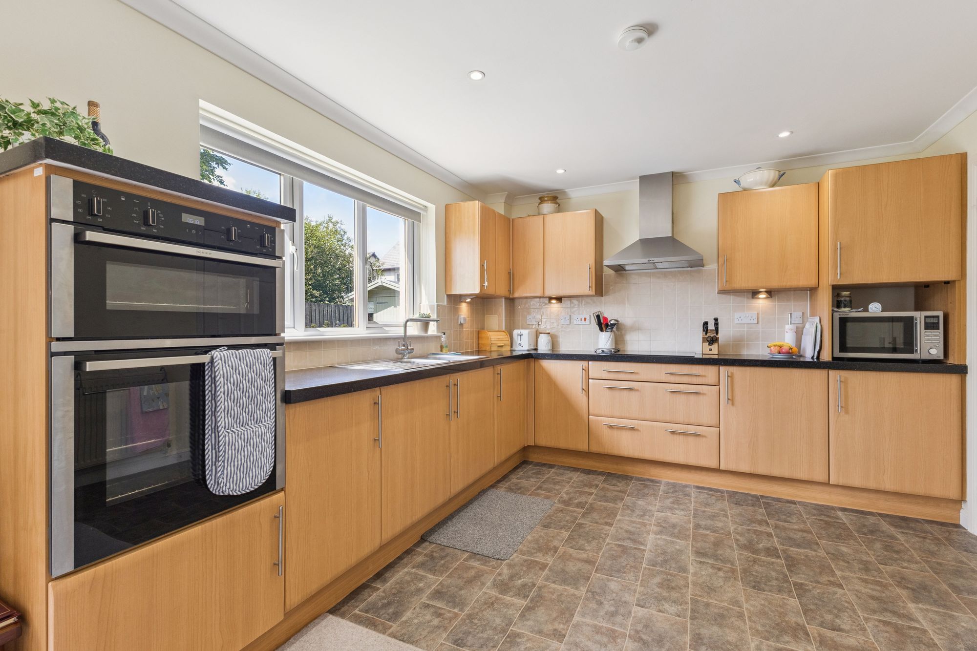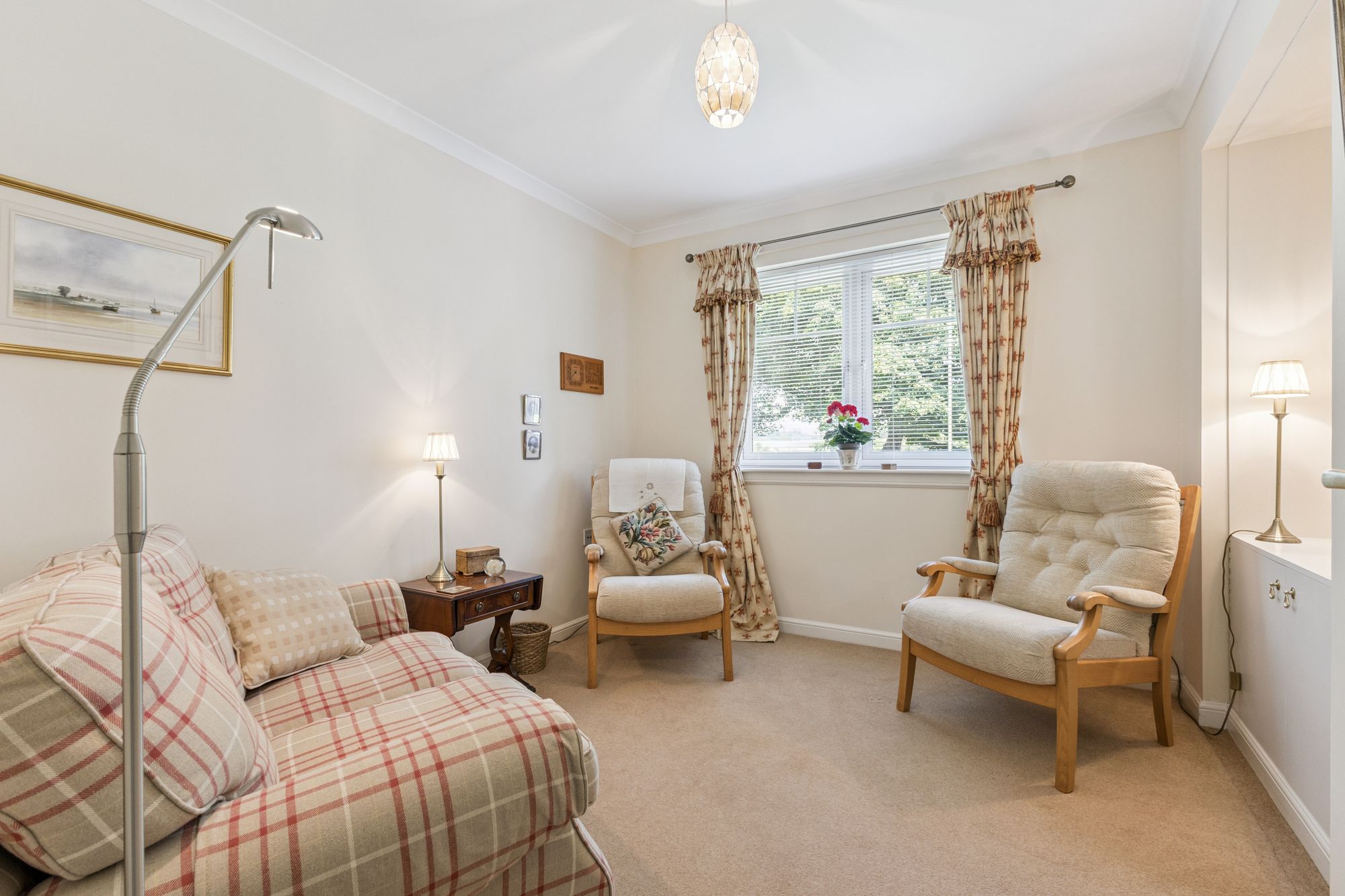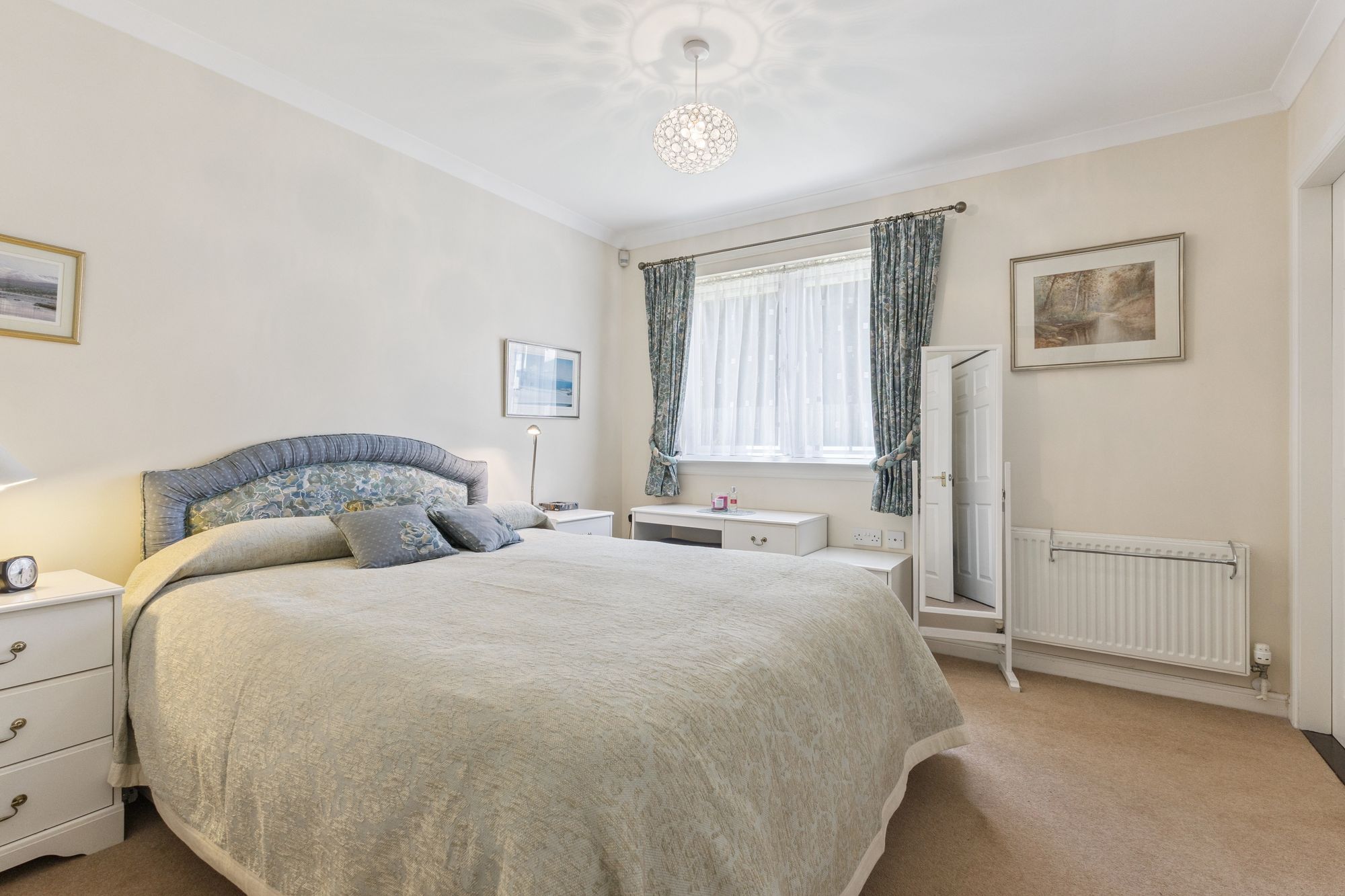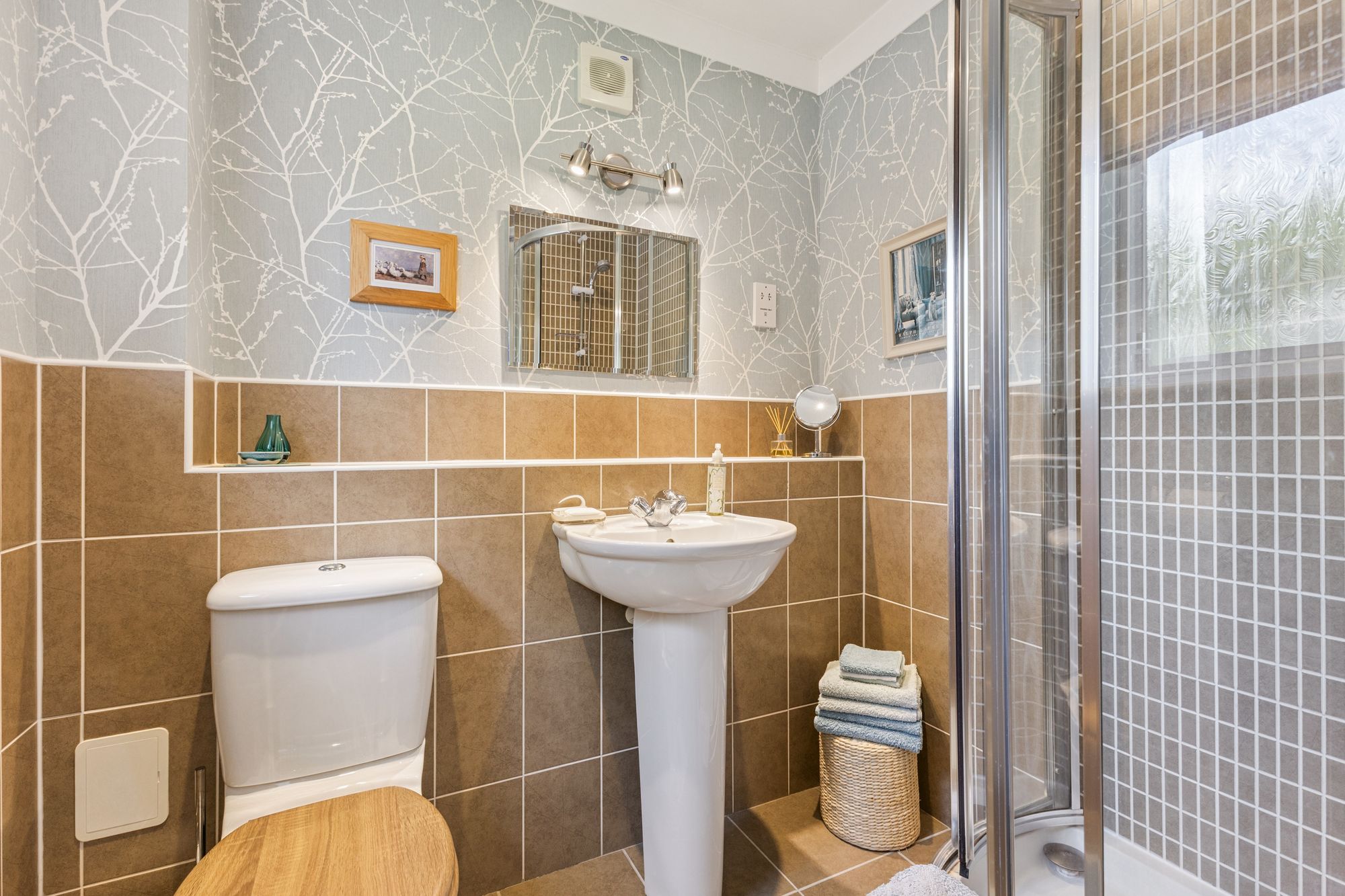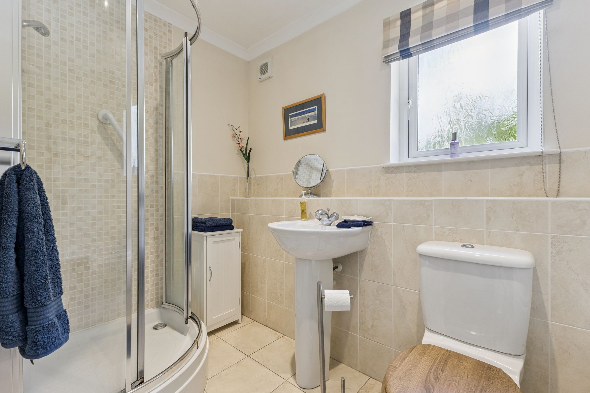 The principal bedroom features built-in wardrobes and a stylish en suite shower room. Two further double bedrooms provide flexibility—one currently serving as a second sitting room. A well-appointed four-piece family bathroom includes a separate bath, shower cubicle, wash basin, and WC.