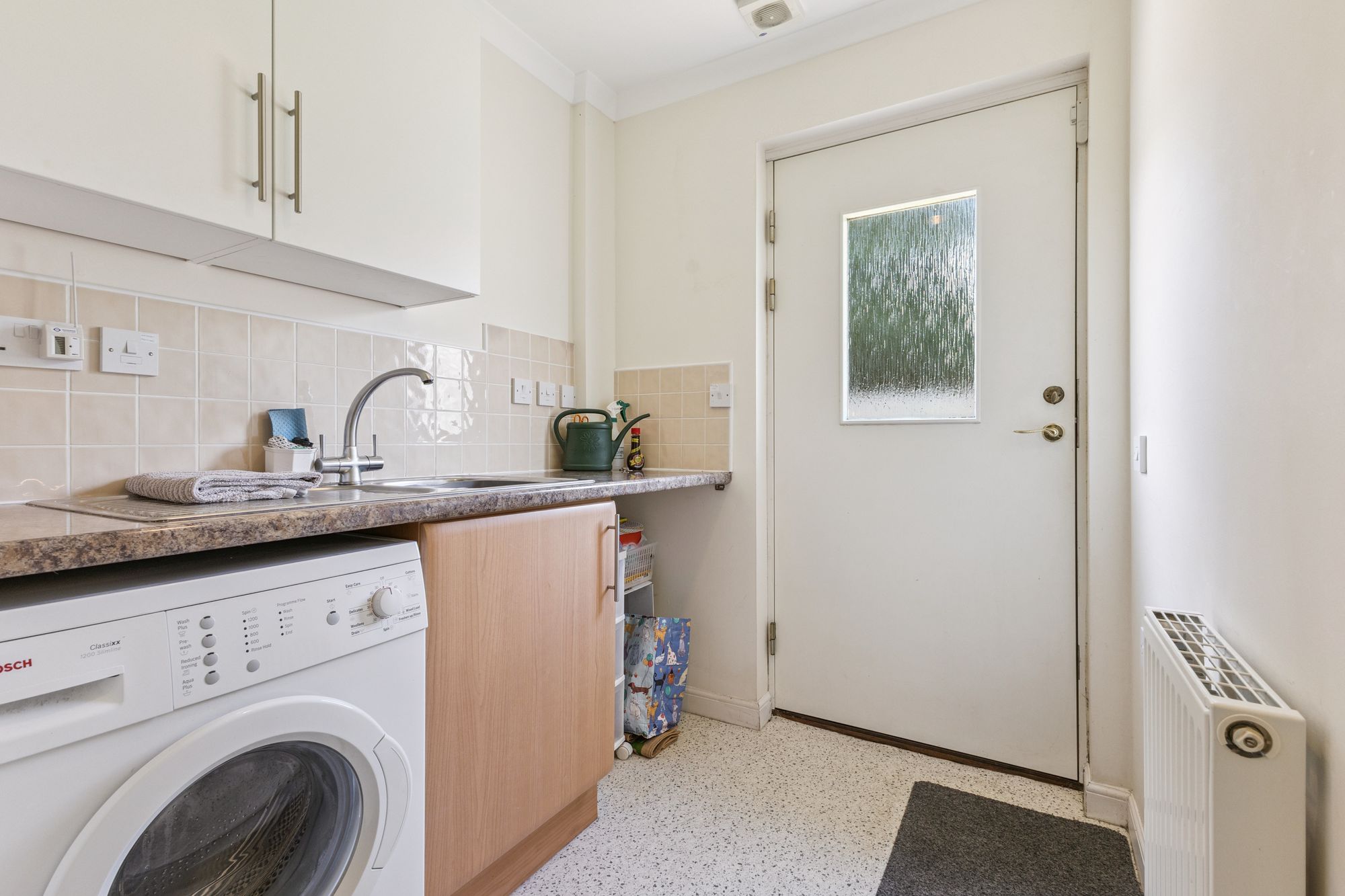 The spacious bay-windowed lounge boasts a lovely feature fireplace, creating a warm and inviting atmosphere. The adjoining dining kitchen is well-equipped with a range of wall and floor-mounted units, integrated appliances, ample space for dining, has direct access to rear garden through French doors. A separate utility room offers additional storage, a second sink, and further access to rear garden.