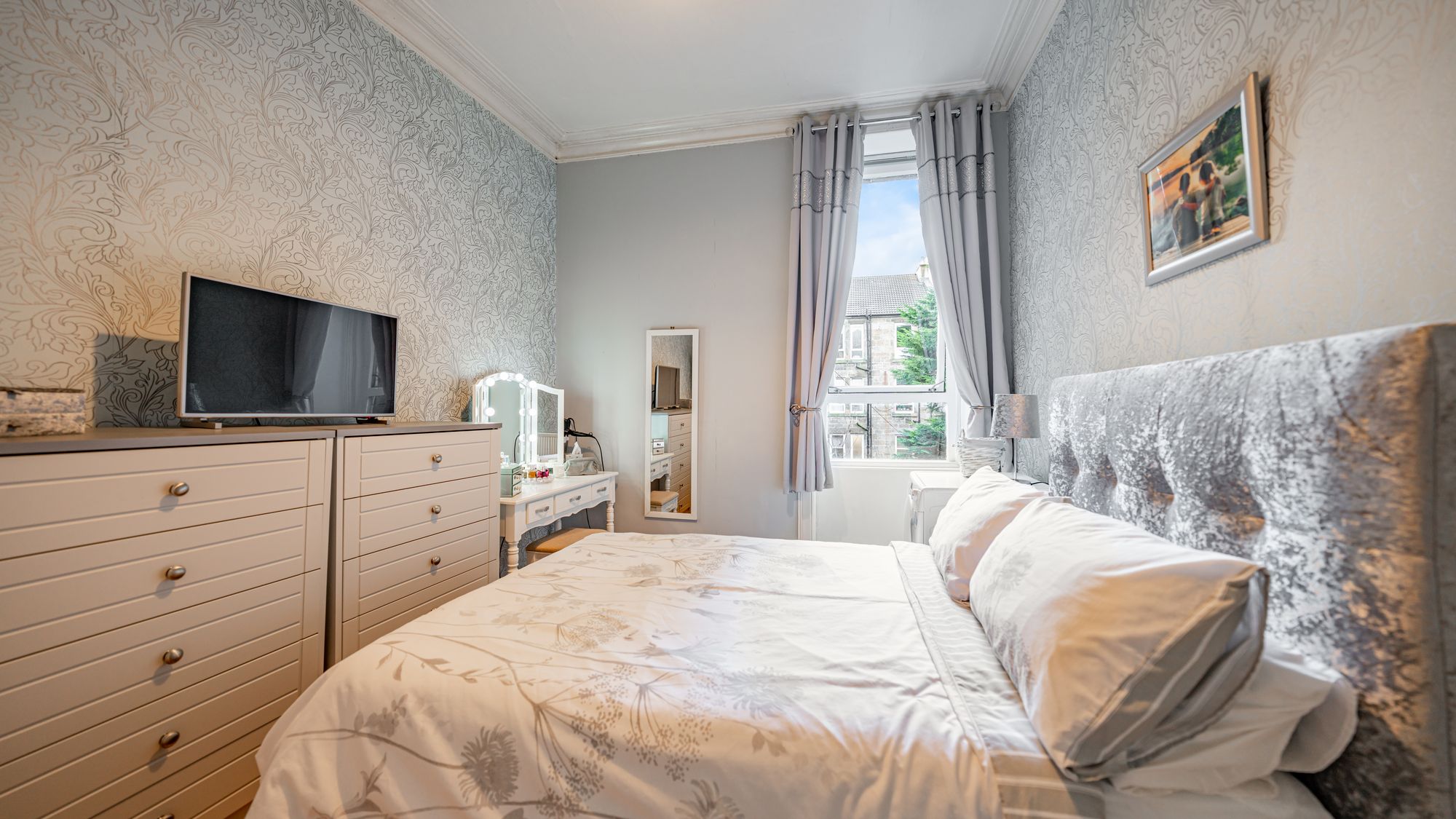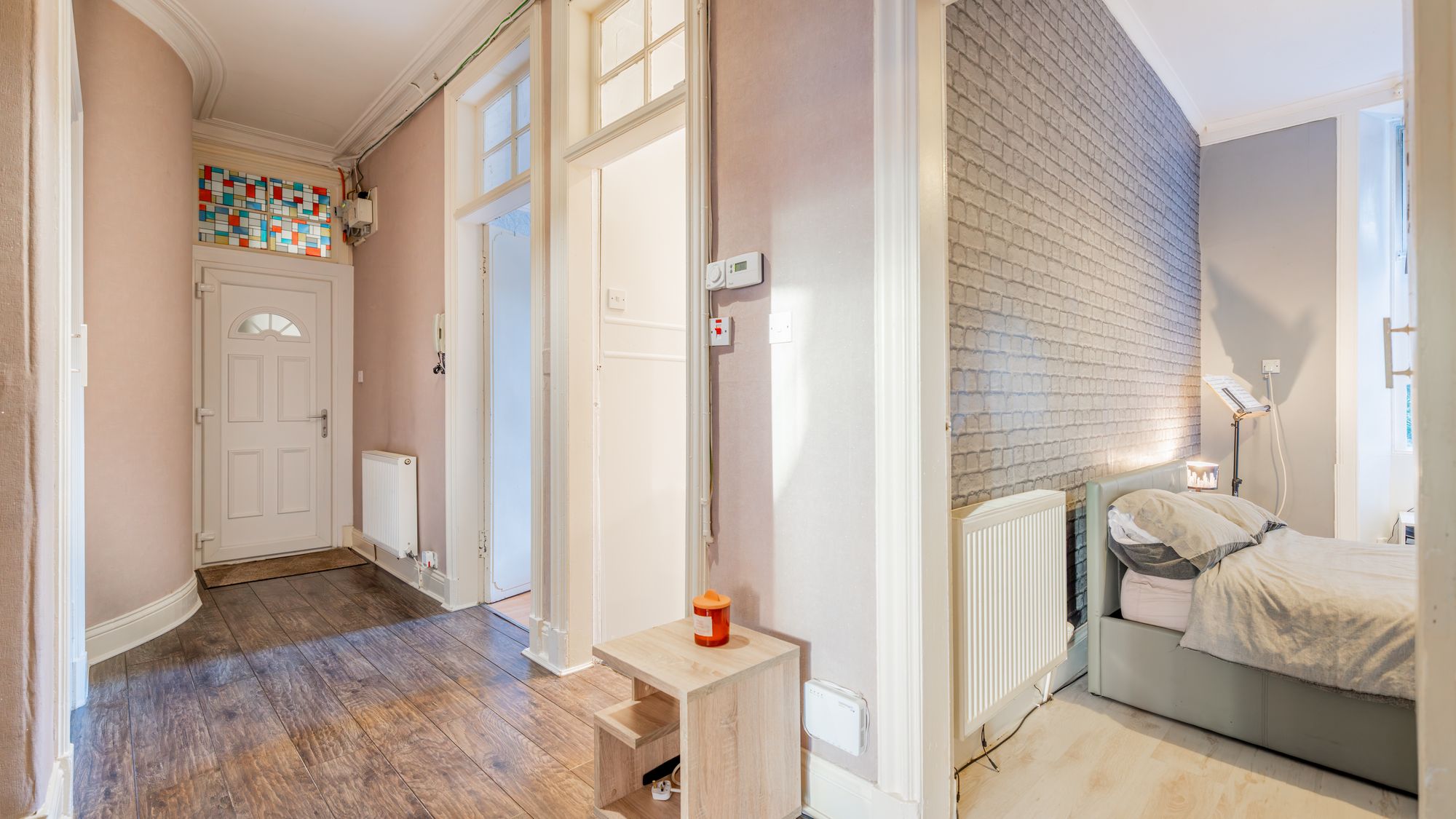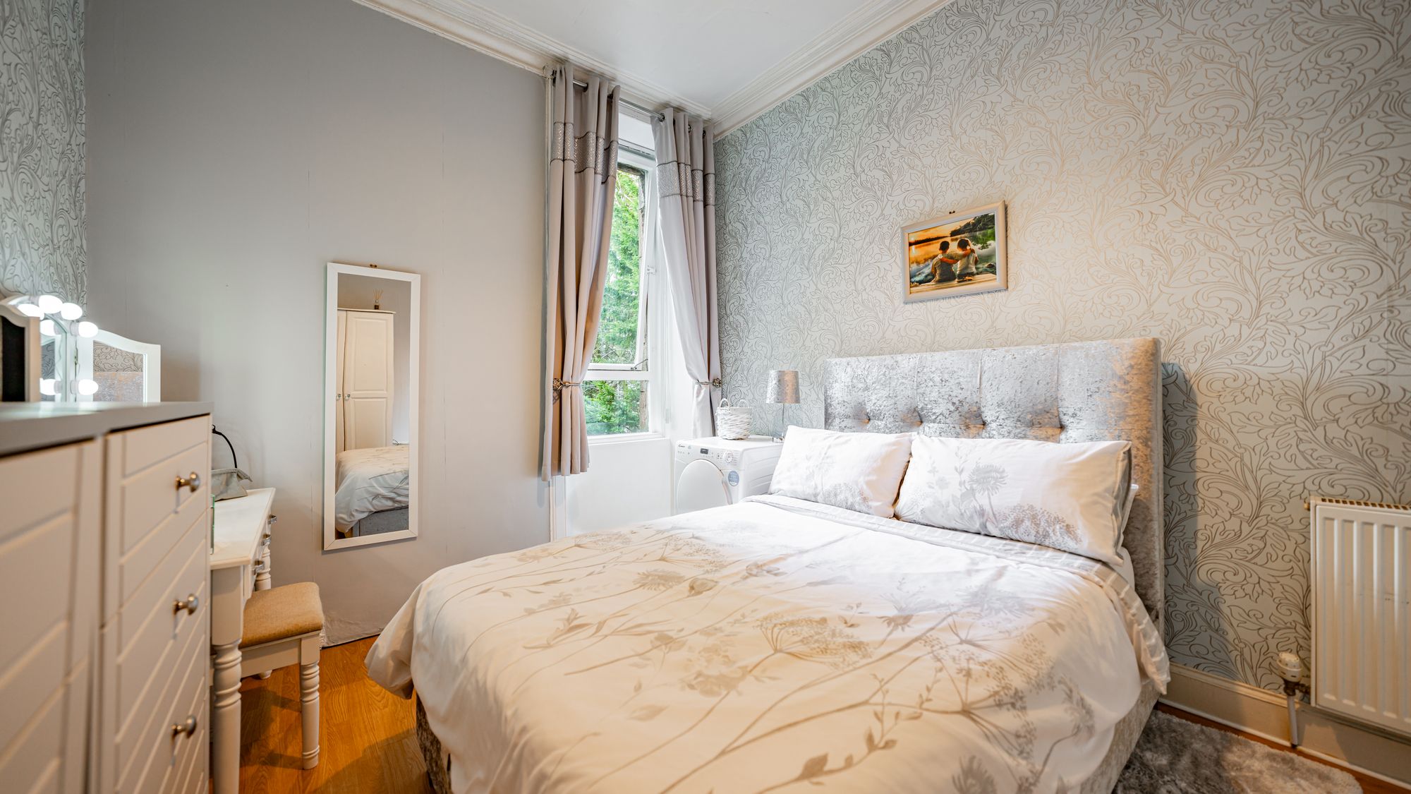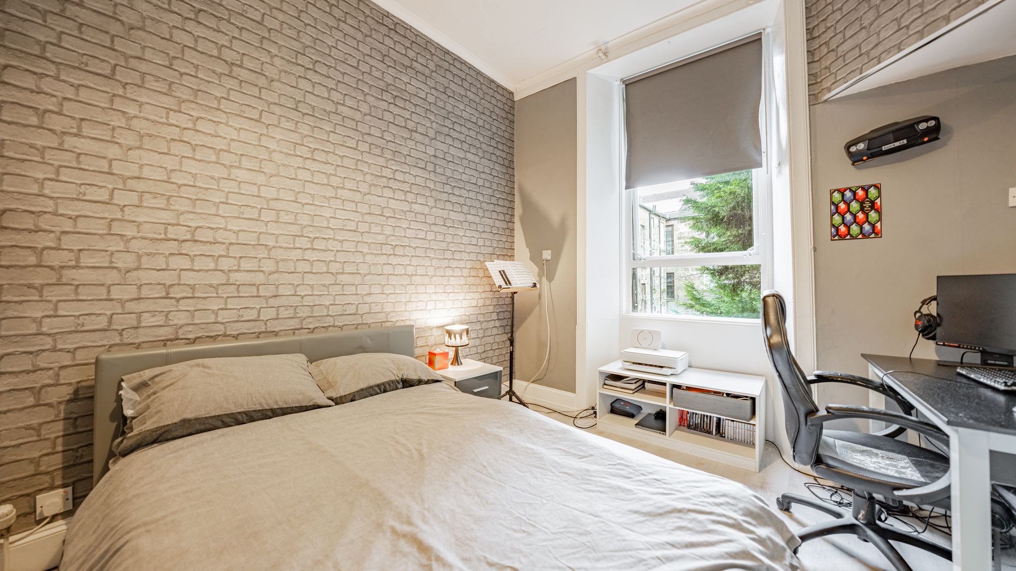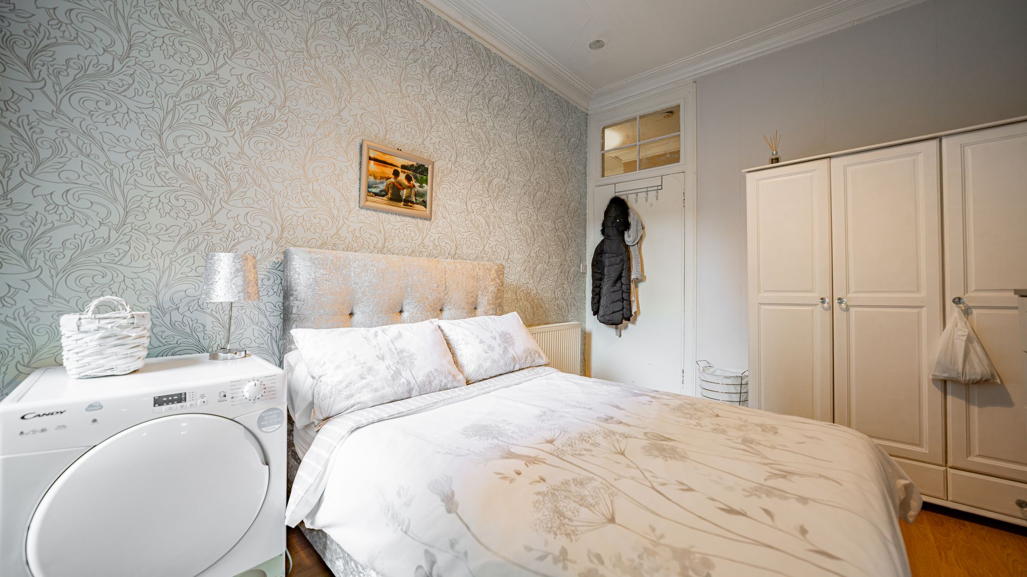 There are two well-sized double bedrooms, including a generous rear-facing principal bedroom with space for free-standing furniture, and a second double bedroom featuring unique integrated storage. Completing the accommodation is an attractive three-piece bathroom suite with shower over bath.